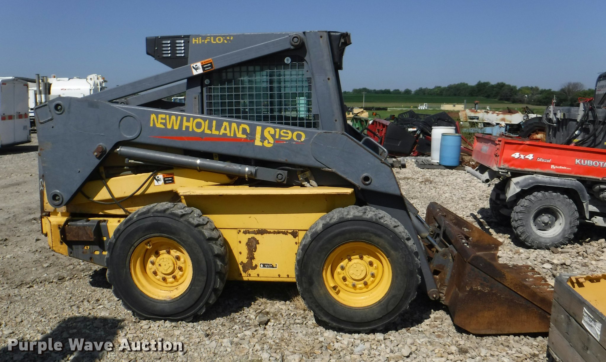 Purple Wave is selling a used Skid Steer Loader in Kansas. This item is a 2001 New Holland LS190 skid steer with the following: Diesel engine, Two speed hydrostatic transmission, Enclosed cab, Joystick controls, Front work lights, 72"W bucket, Weld-on cutting edge, Weld-on teeth, Counterweights, Desston 12-16.5 tires, Additional tire included, No front door, Bucket solenoid needs to be replaced, Serial 195870, Unit# 179722