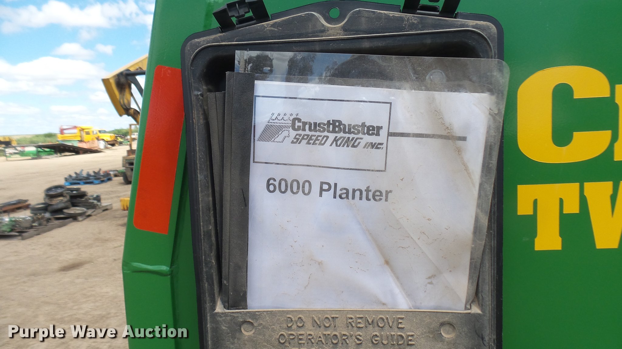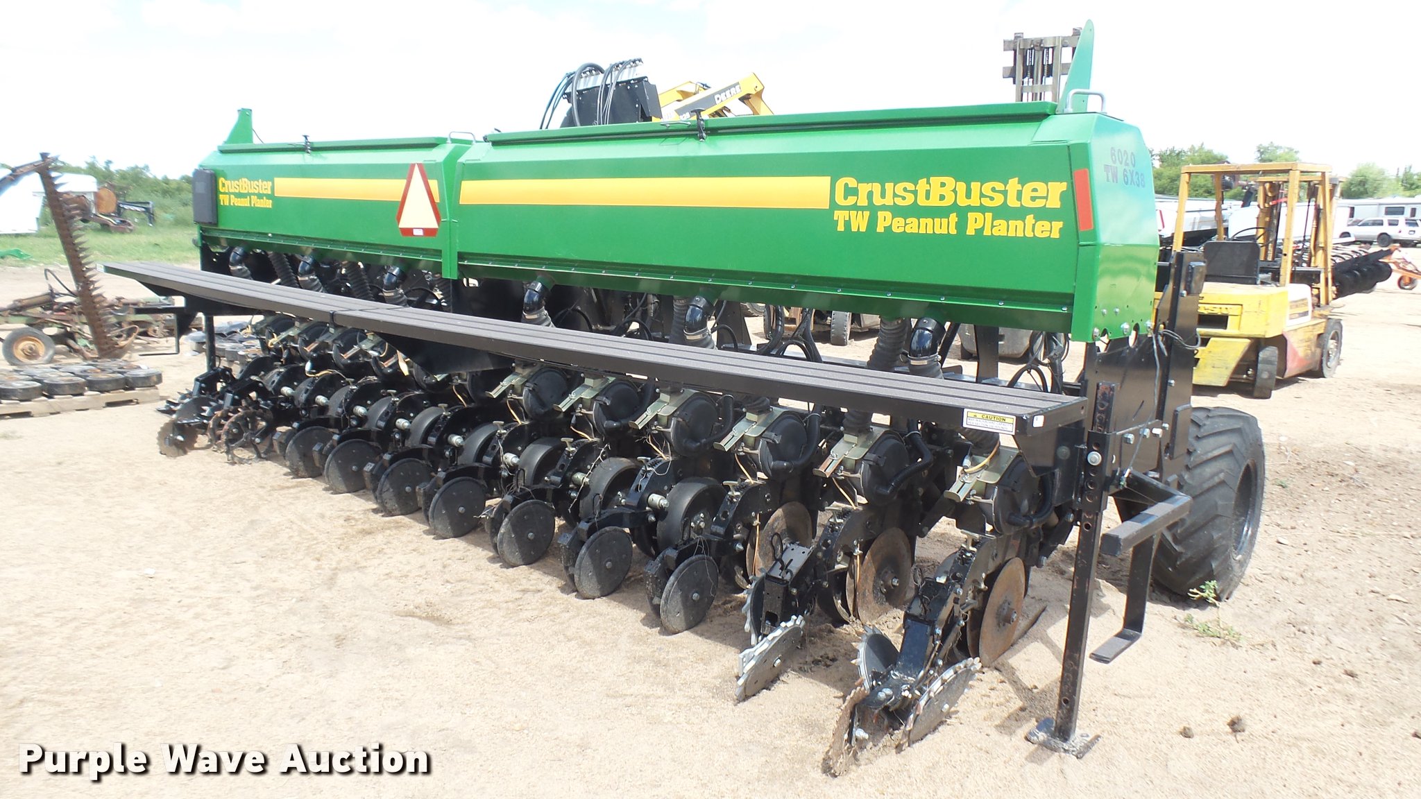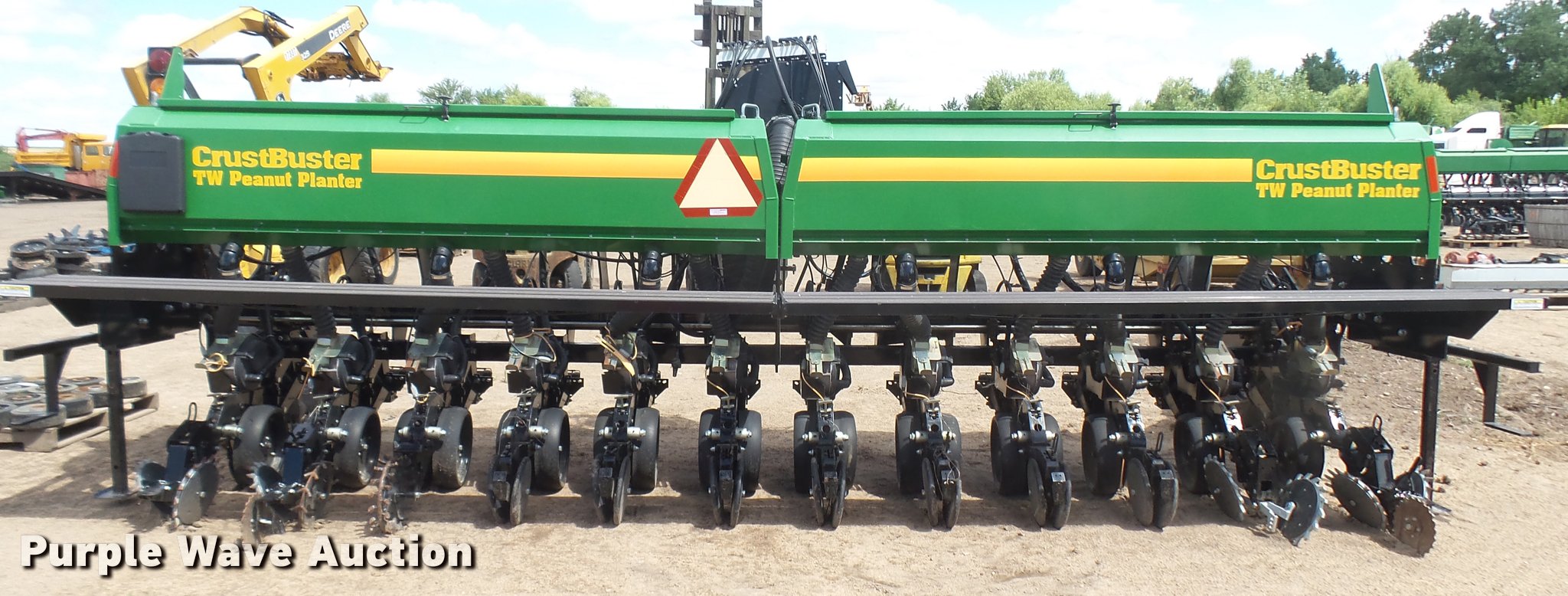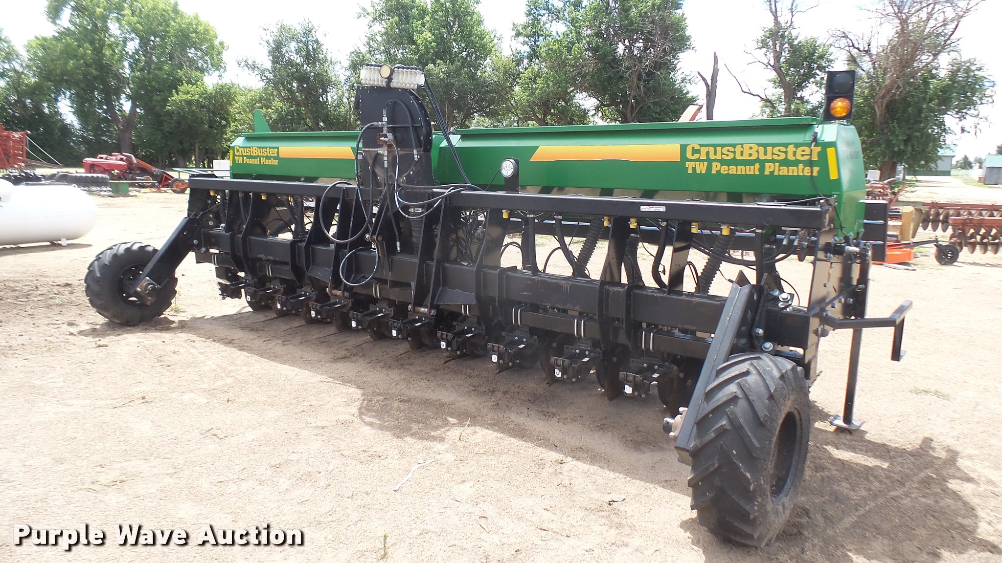 Purple Wave is selling a used Planter in Kansas. This item is a 2014 CrustBuster 6020TW peanut planter with the following: 20.5'W, 12 row units, 18" row spacing, Double disk openers, Trash whippers, Transport lights, Three point, 12.5L-15 tires, Manuals