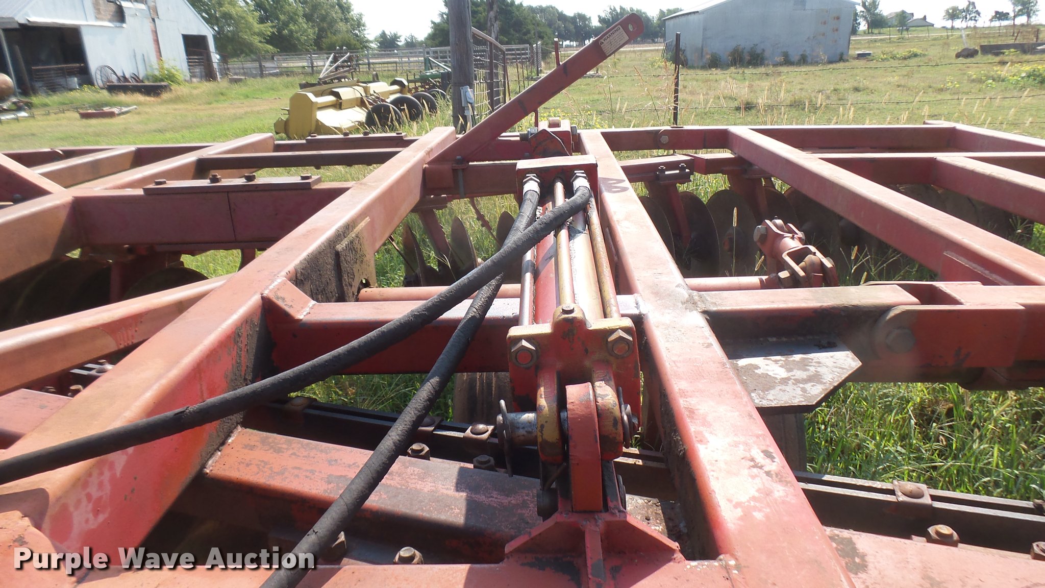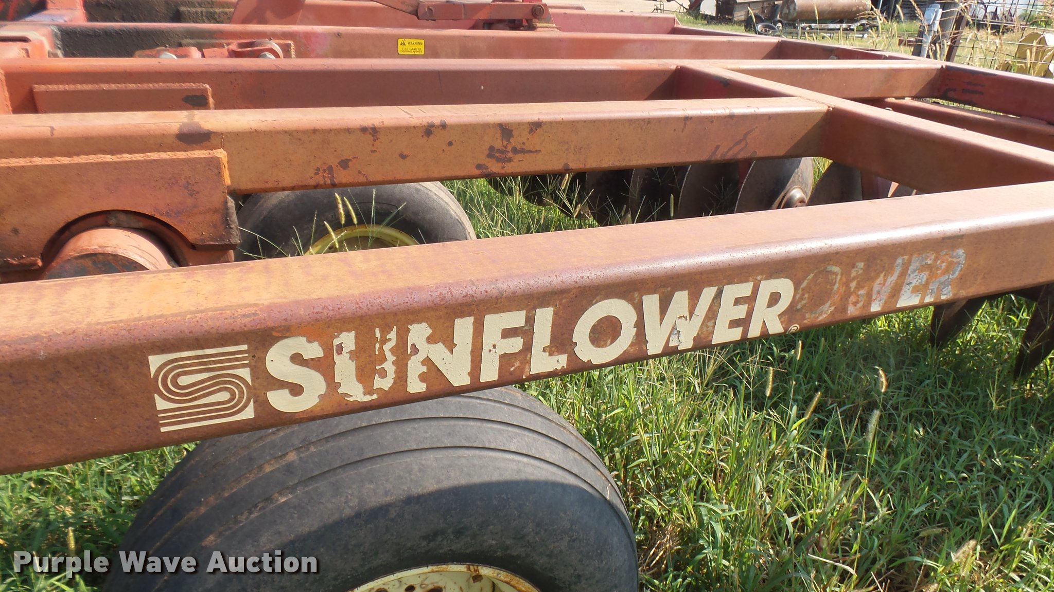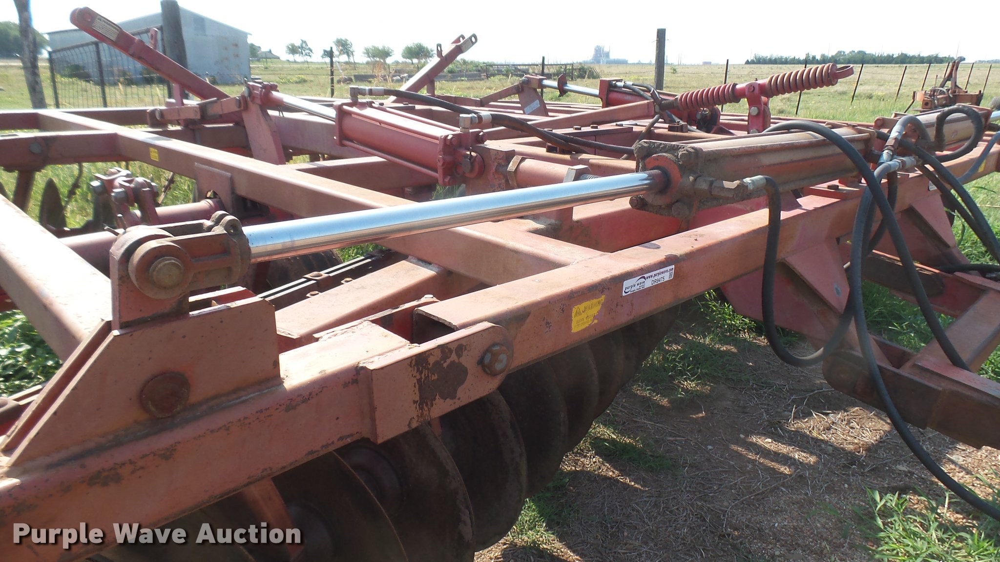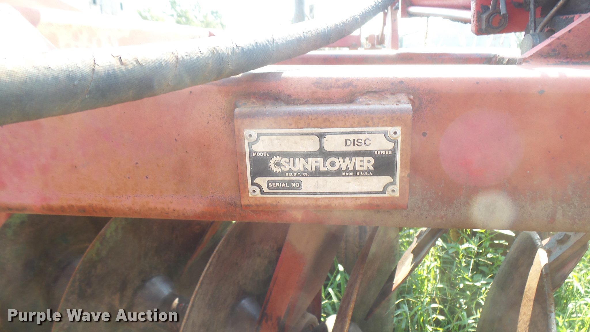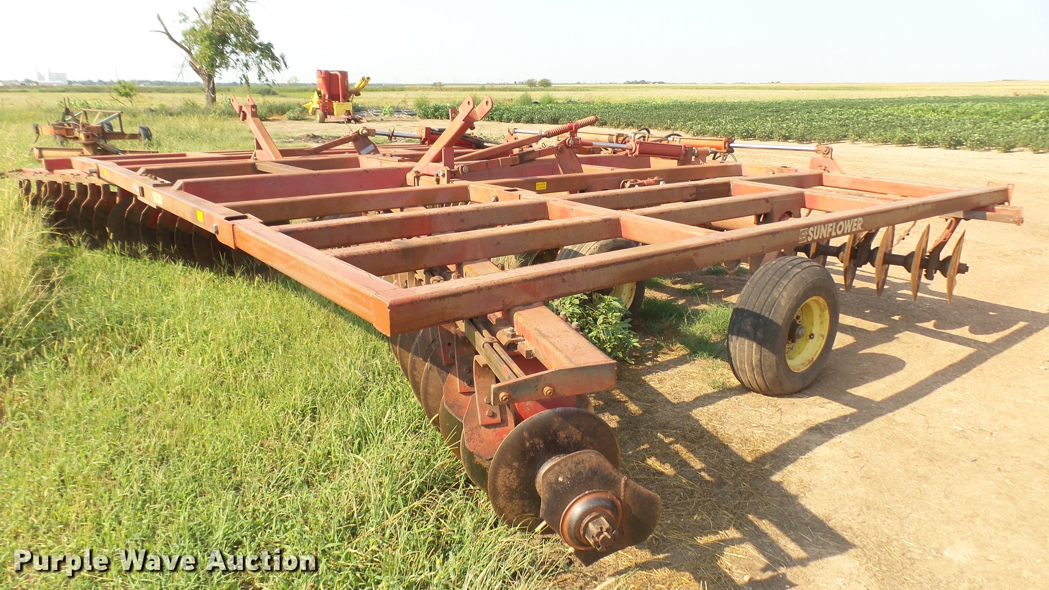 Purple Wave is selling a used Disk in Kansas. This item is a Sunflower 1430 disk with the following: 22'W, 20" disks, Hydraulic lift and fold, Pin hitch