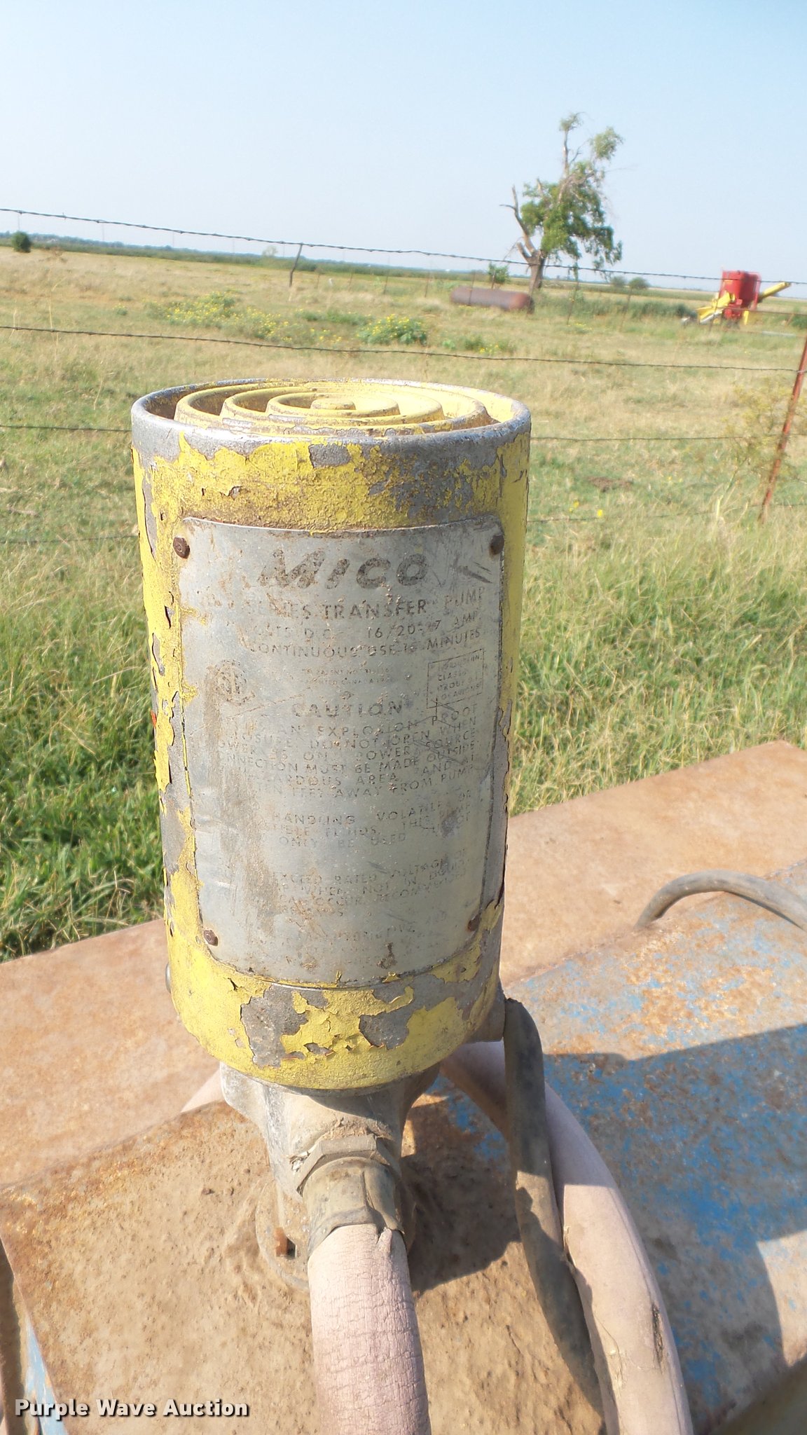 Purple Wave is selling a used Fuel and Lube in Kansas. This item is a Fuel tank with the following: 60"W x 36"D x 24"H, Hose and nozzle, Mico pump, Non-operational
