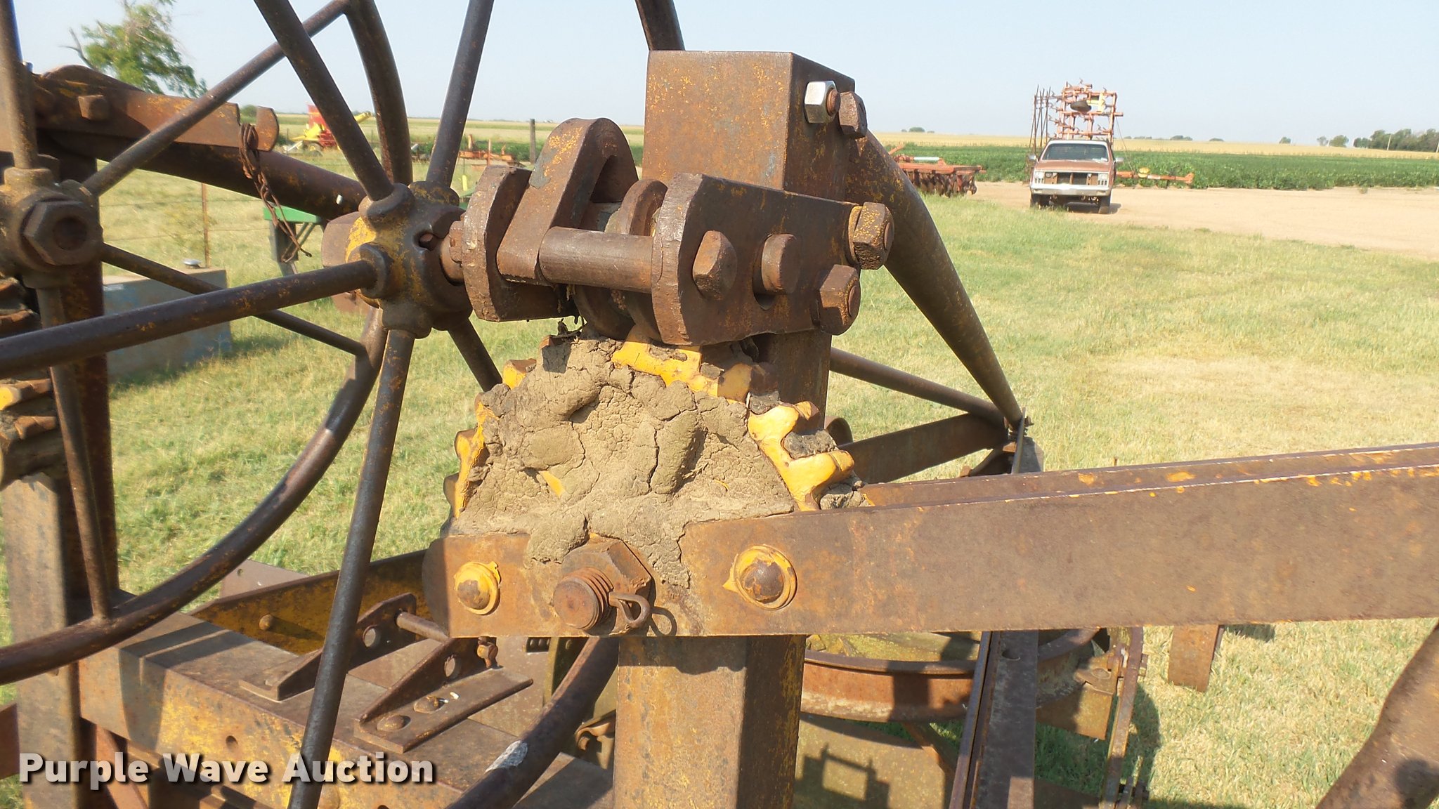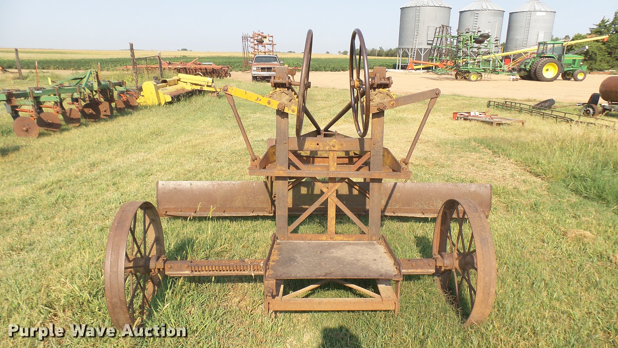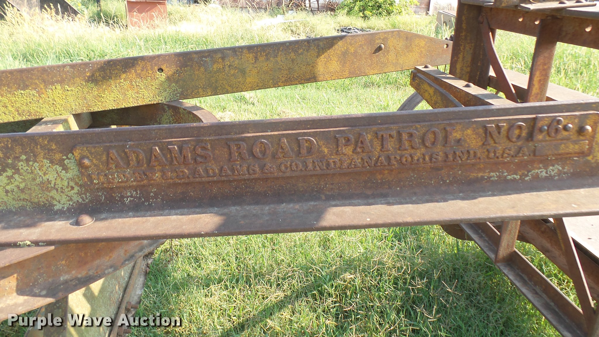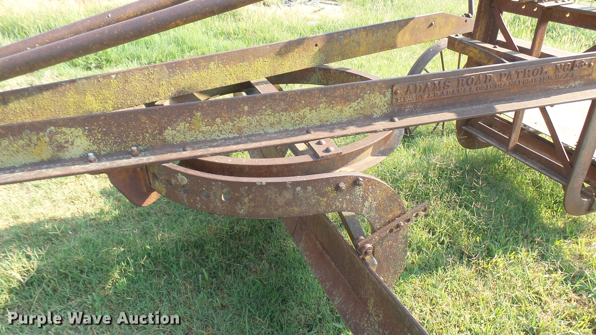 Purple Wave is selling a used Pull Type Scraper in Kansas. This item is a Adams Road Patrol #6 grader with the following: 10' moldboard, Manual angle adjust, Steel wheels, Pin hitch, Serial 526F