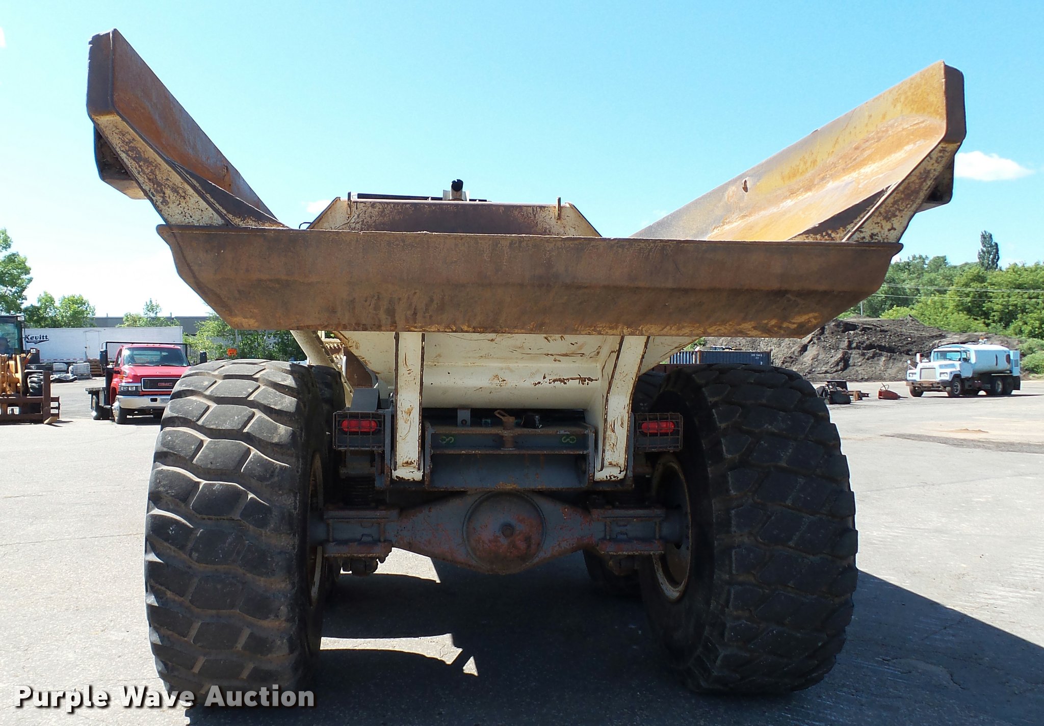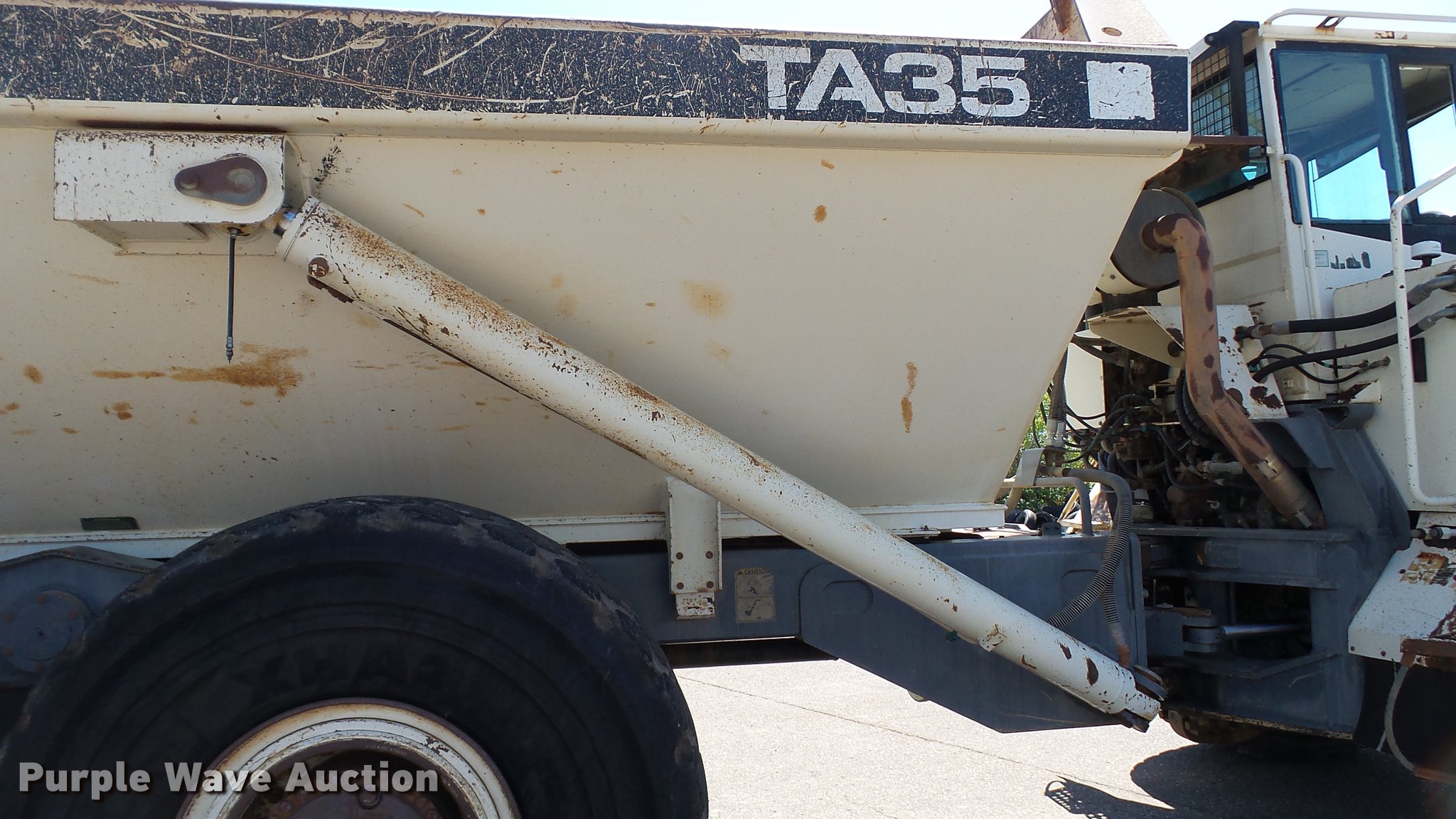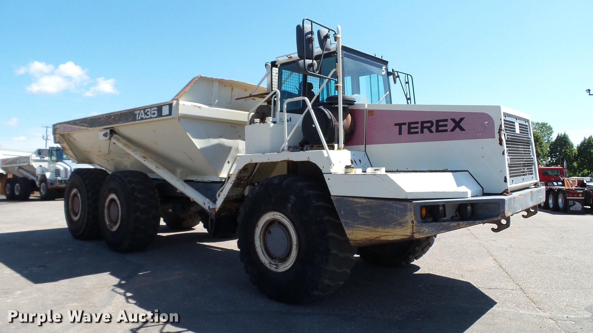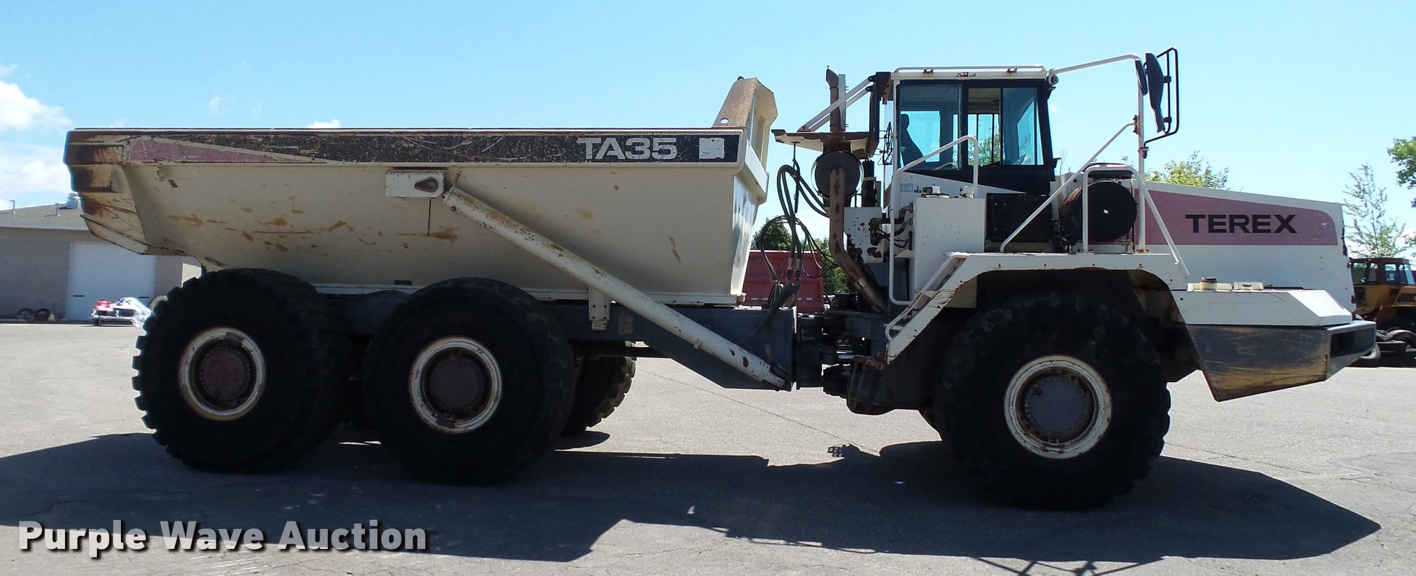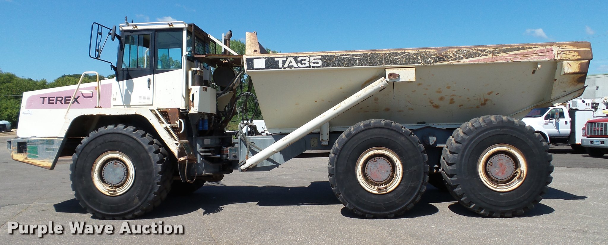 Purple Wave is selling a used Off Road Haul Truck in Minnesota. This item is a 2001 Terex TA35 haul truck with the following: 5,021 hours on meter, Detroit Diesel Series 60 11.1L six cylinder diesel engine, 350 HP, Serial 06R0648589, Automatic transmission, 6F-3R, Inter-axle differential lock, Tandem axle, AC and heat, Tilt, Suspension seat, Instructor seat, Backup alarm, Steel barrel bed, 18.5'L x 11'W, Dual ram hoist, Heated box, Work lights, Front tow hooks, Block heater, Single fuel tank, Walking beam suspension, Hydraulic brakes, 26.5R25 tires, 70,548 lbs maximum payload, Serial A7761355