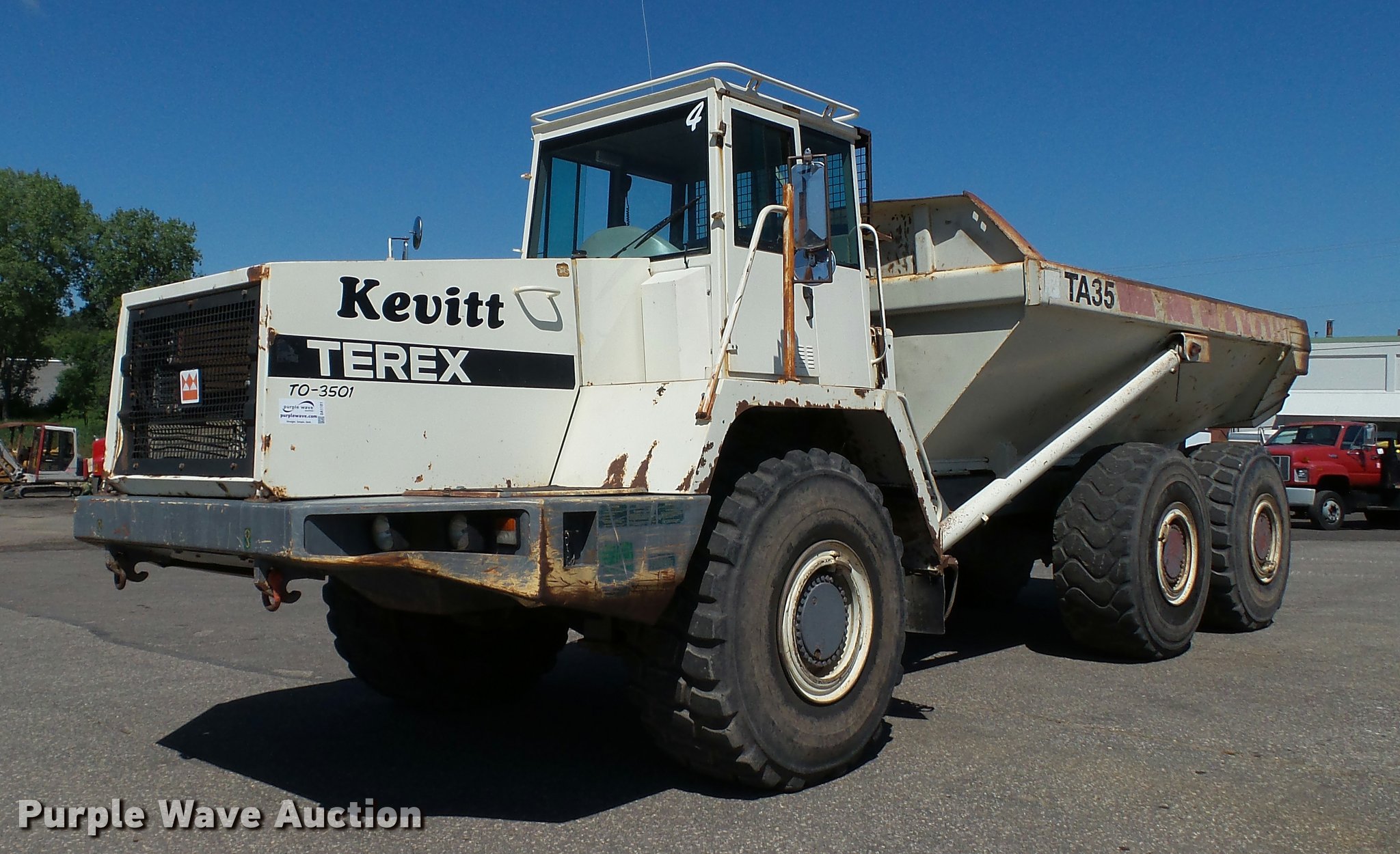 2001 Terex TA35 haul truck. 5,005 hours on meter, Detroit Diesel Series 60 11.1L six cylinder diesel engine 350 HP, Serial 06R0617329, Automatic transmission 6F-3R, Six wheel drive, Inter-axle differential lock, Tandem axle, AC and heat, Tilt, Suspension seat, Instructor seat, Backup alarm, Steel barrel bed 18.5'L x 11'W, Dual ram hoist, Heated box, Front tow hooks, Work lights, Single fuel tank, Block heater, 18'4" wheelbase, Walking beam suspension, Hydraulic brakes, 26.5R25 tires, 70,548 lbs payload capacity. A7761264. Kevitt Excavating LLC - Open inspection Sept. 6. 3335 Pennsylvania Ave N. Crystal, MN 55427