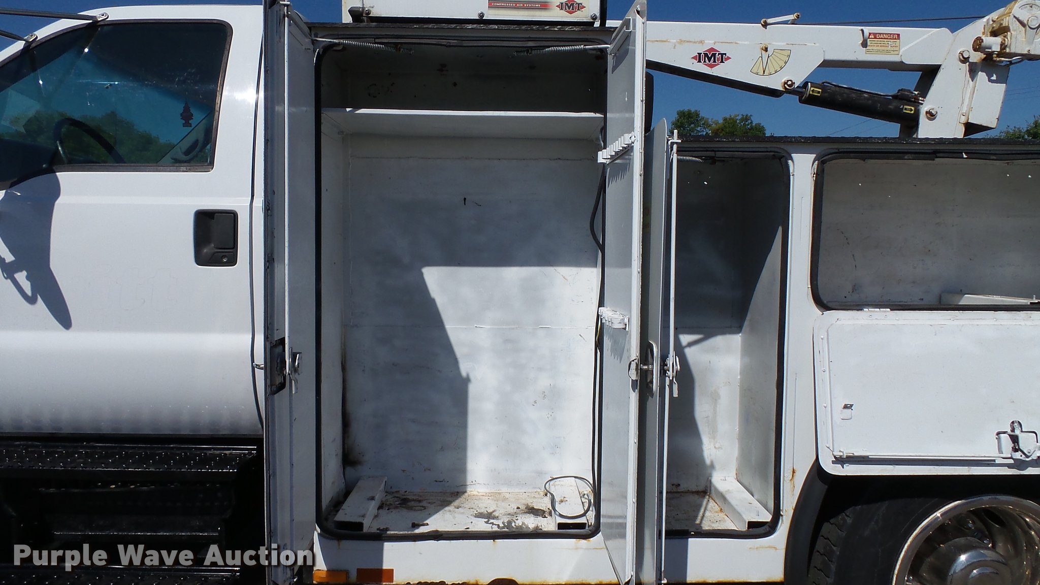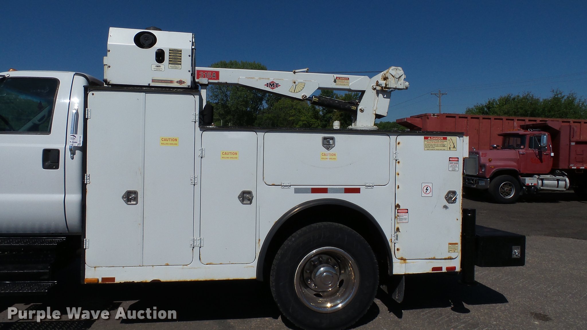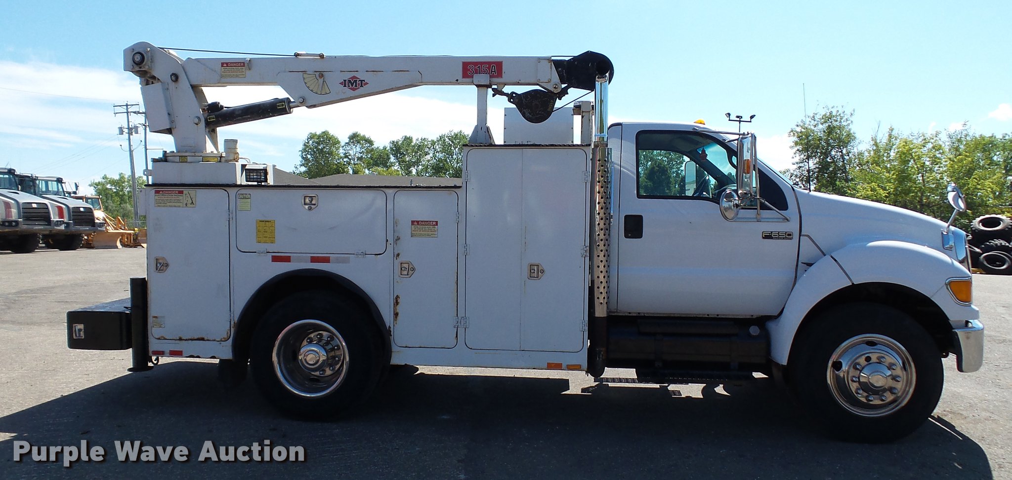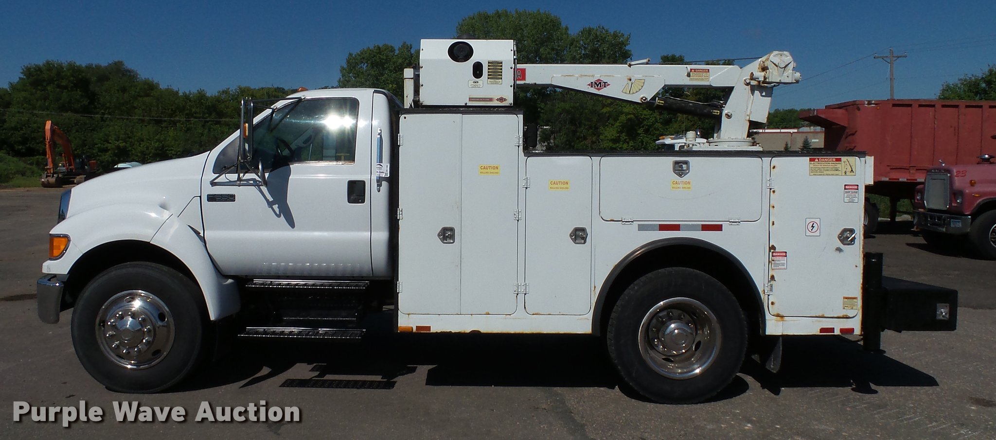 Purple Wave is selling a used Service Truck in Minnesota. This item is a 2005 Ford F650 Super Duty XLT service truck with crane with the following: 163,619 miles on odometer, International VT365 6.0L V8 turbo diesel engine, 230 HP, Serial 184559061, Automatic transmission, Single axle, AC and heat, Cruise, AM/FM/cassette, Power windows and locks, Heated mirrors, Beacon light, 11'L utility bed, Shelving, Enclosed body, Work lights, Bed liner, Torch bottle rack, IMT air compressor, Hose reel, IMT oil/lube system, Hydraulic fluid, IMT 315A crane, 17'9" boom length, 7,500 lbs maximum lift capacity, (2) outriggers,, Front tow hooks, Single fuel tank, Single exhaust stack, 508" wheelbase, Spring suspension, Hydraulic brakes, Firestone 10R22.5 tires, GVWR 25,999 lbs, FAWR 10,000 lbs, RAWR 17,500 lbs