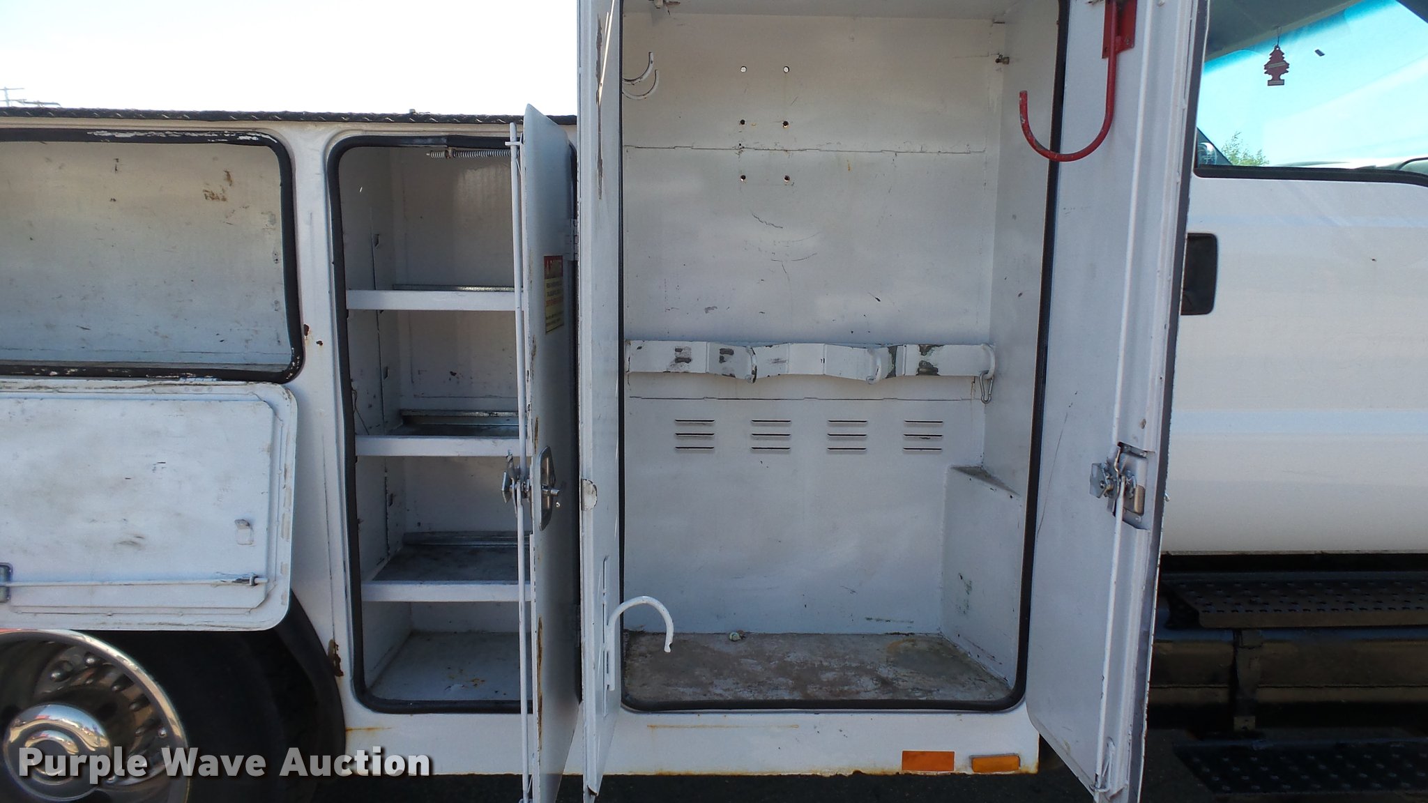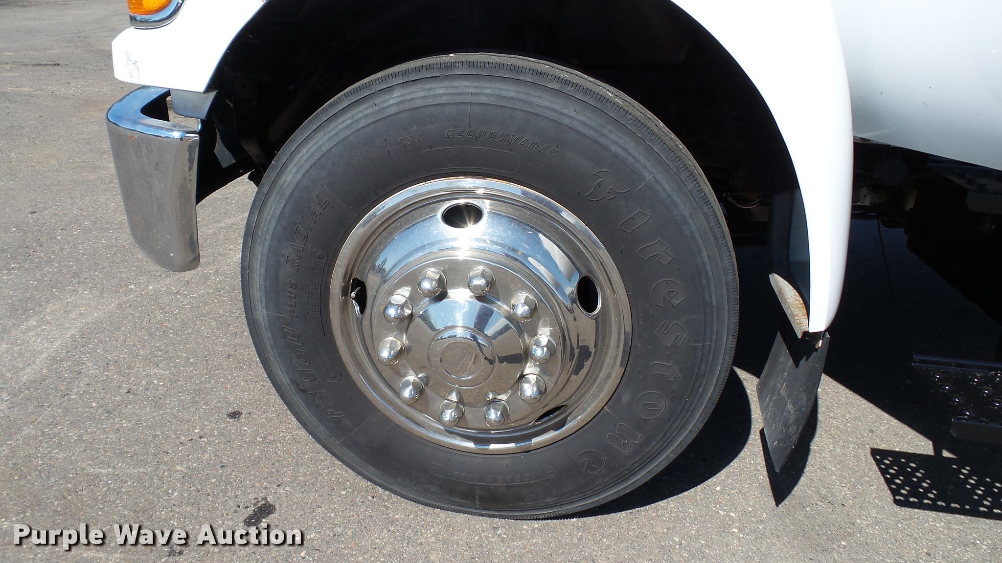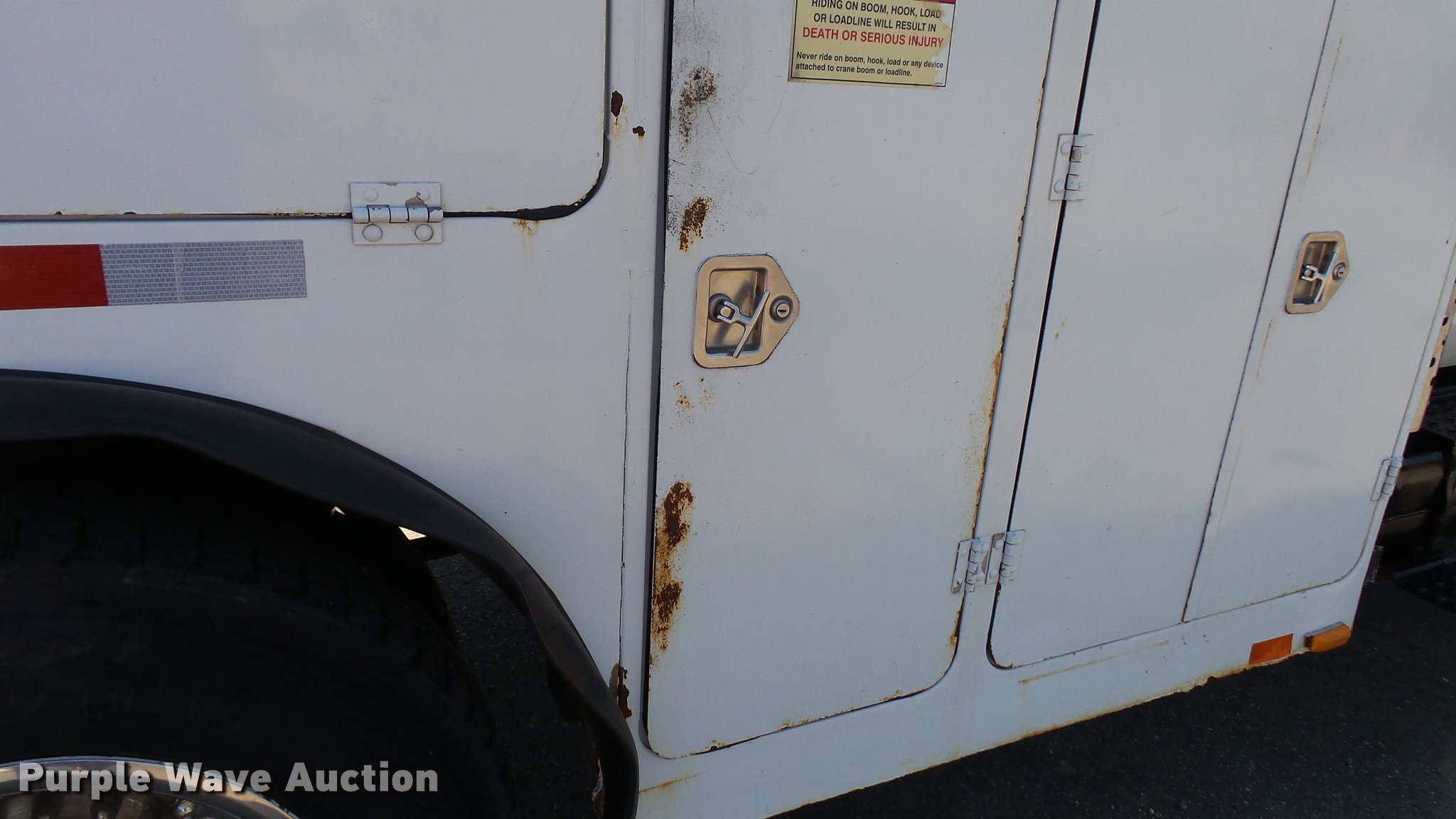 Purple Wave is selling a used Service Truck in Minnesota. This item is a 2005 Ford F650 Super Duty XLT service truck with crane with the following: 163,619 miles on odometer, International VT365 6.0L V8 turbo diesel engine, 230 HP, Serial 184559061, Automatic transmission, Single axle, AC and heat, Cruise, AM/FM/cassette, Power windows and locks, Heated mirrors, Beacon light, 11'L utility bed, Shelving, Enclosed body, Work lights, Bed liner, Torch bottle rack, IMT air compressor, Hose reel, IMT oil/lube system, Hydraulic fluid, IMT 315A crane, 17'9" boom length, 7,500 lbs maximum lift capacity, (2) outriggers,, Front tow hooks, Single fuel tank, Single exhaust stack, 508" wheelbase, Spring suspension, Hydraulic brakes, Firestone 10R22.5 tires, GVWR 25,999 lbs, FAWR 10,000 lbs, RAWR 17,500 lbs