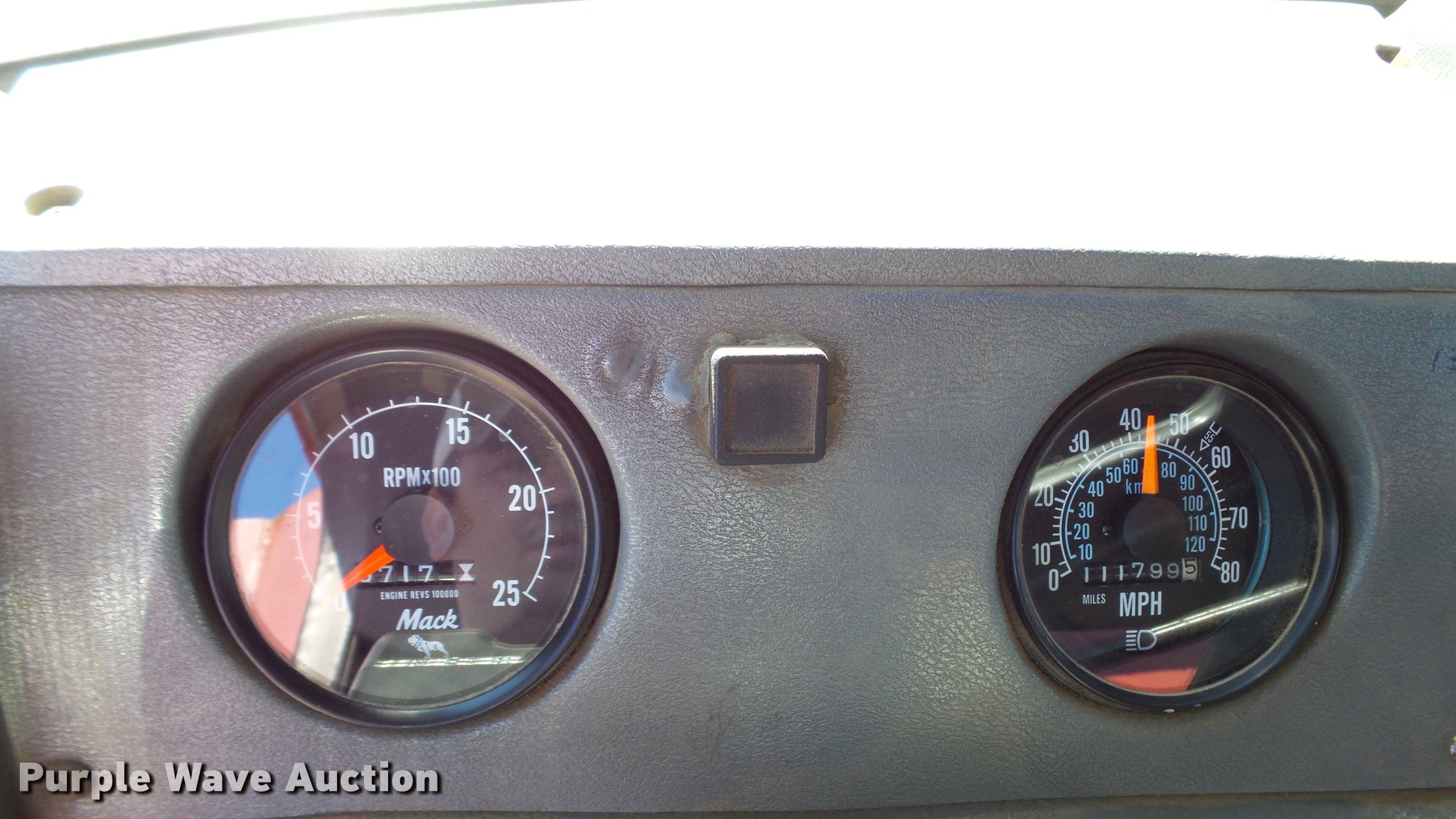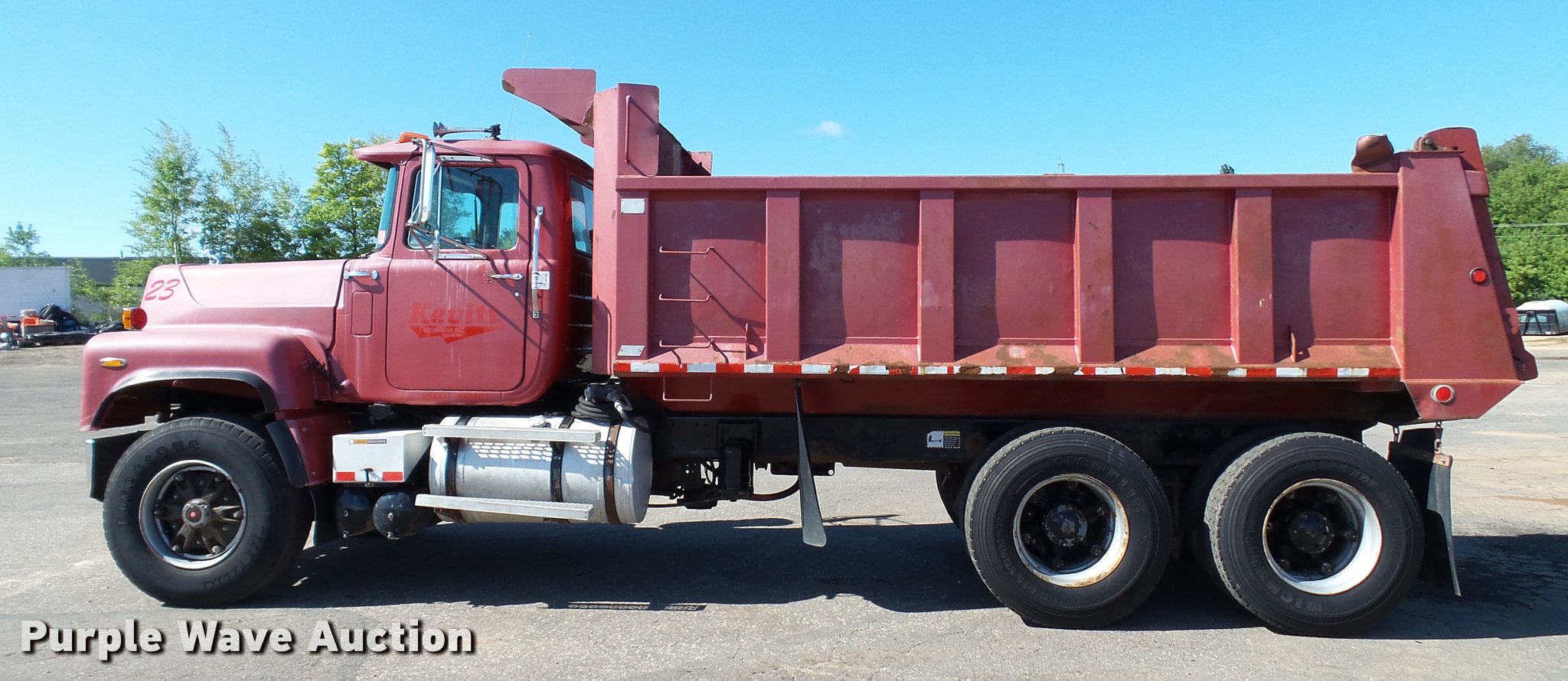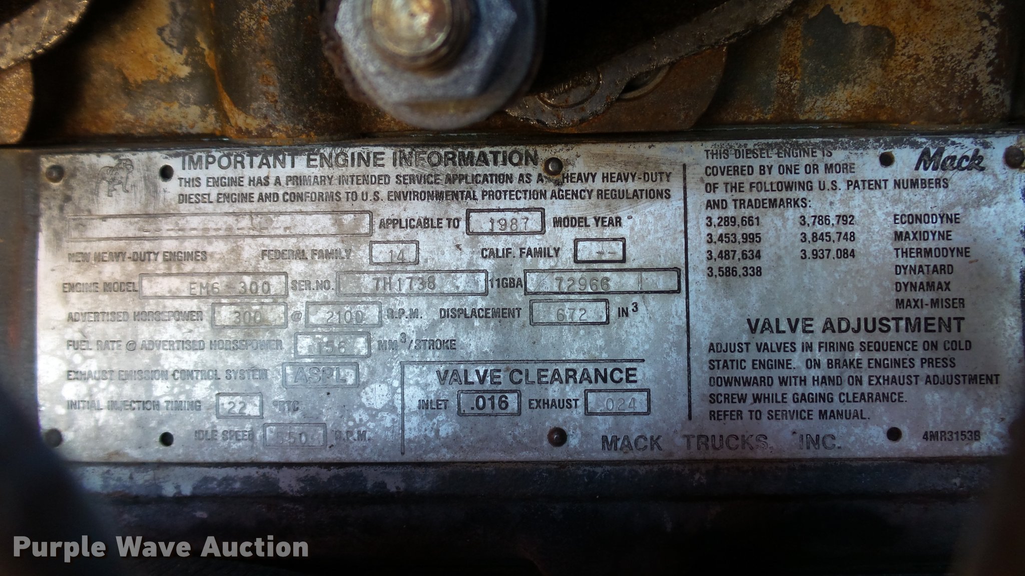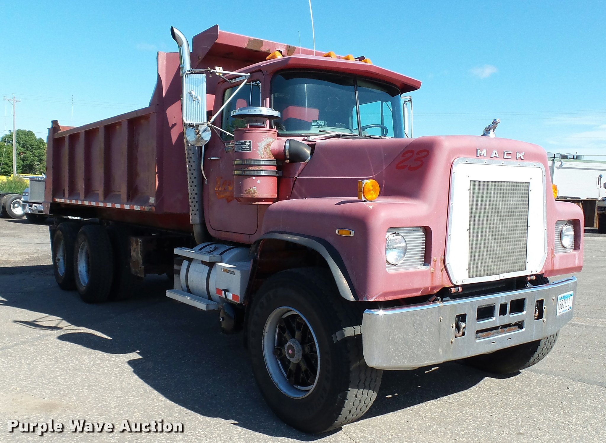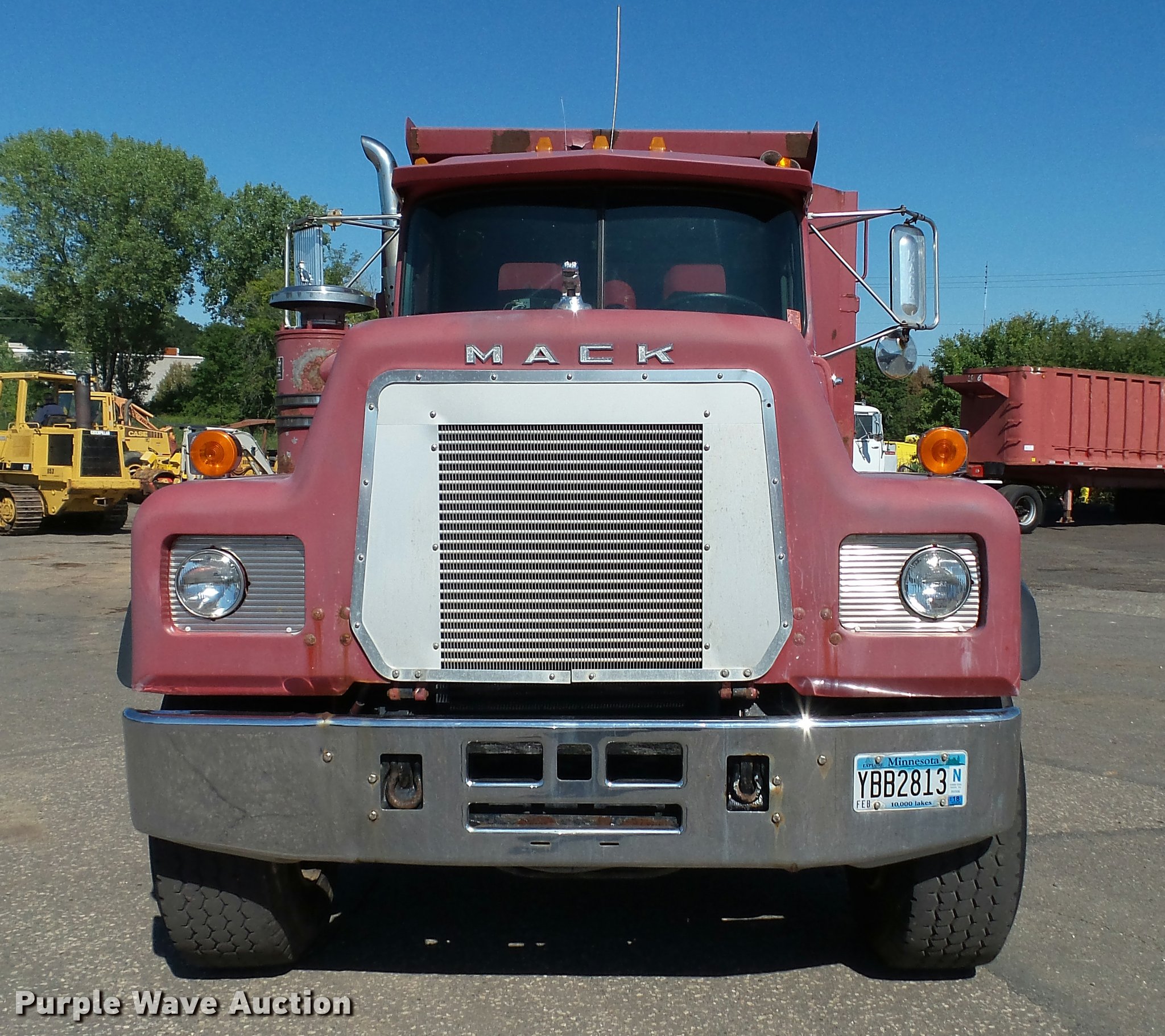 Purple Wave is selling a used Construction Dump Truck in Minnesota. This item is a 1987 Mack RS686LS dump truck with the following: 111,800 miles on odometer, 767 hours on meter, Mack EM6-300 six cylinder turbo diesel engine, 300 HP, 7H-1738, speed manual transmission, Tandem axle, Inter-axle differential lock, AC and heat, AM/FM/CD, Block heater, Exterior visor, PTO, Beav-Roc LTT-16-44-48 steel dump bed, 16'L x 98"W, 36" side height, Single ram hoist, Air operated end gate, Dual fuel tanks, Driver's side fuel tank equipped for off road diesel, Electric fuel pump, Hose, Nozzle,, Pintle hitch, Trailer wiring, 17'9" wheelbase, Camelback suspension, Air brakes, 385/65R22.5 front tires, 11R22.5 rear tires