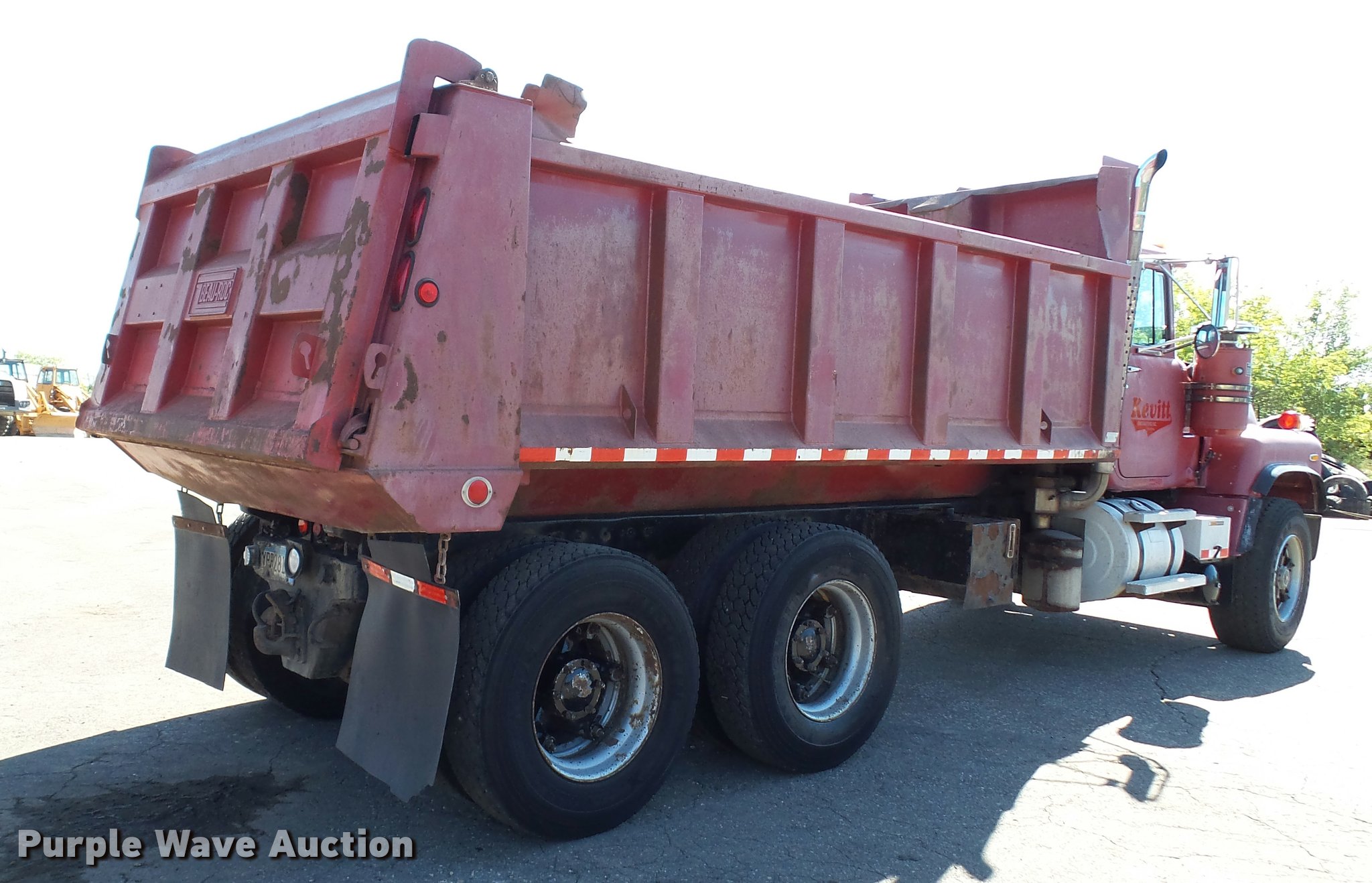 1987 Mack RS686LS dump truck. 111,800 miles on odometer, 767 hours on meter, Mack EM6-300 six cylinder turbo diesel engine 300 HP, 7H-1738, speed manual transmission, Tandem axle, Inter-axle differential lock, AC and heat, AM/FM/CD, Block heater, Exterior visor, PTO, Beav-Roc LTT-16-44-48 steel dump bed 16'L x 98"W, 36" side height, Single ram hoist, Air operated end gate, Dual fuel tanks Driver's side fuel tank equipped for off road diesel Electric fuel pump, Hose, Nozzle, Pintle hitch, Trailer wiring, 17'9" wheelbase, Camelback suspension, Air brakes, 385/65R22.5 front tires, 11R22.5 rear tires. Minnesota title. 1M2T152C4HM003191. Kevitt Excavating LLC - Open inspection Sept. 6. 3335 Pennsylvania Ave N. Crystal, MN 55427