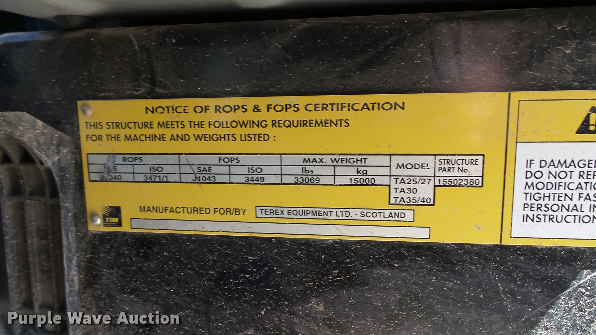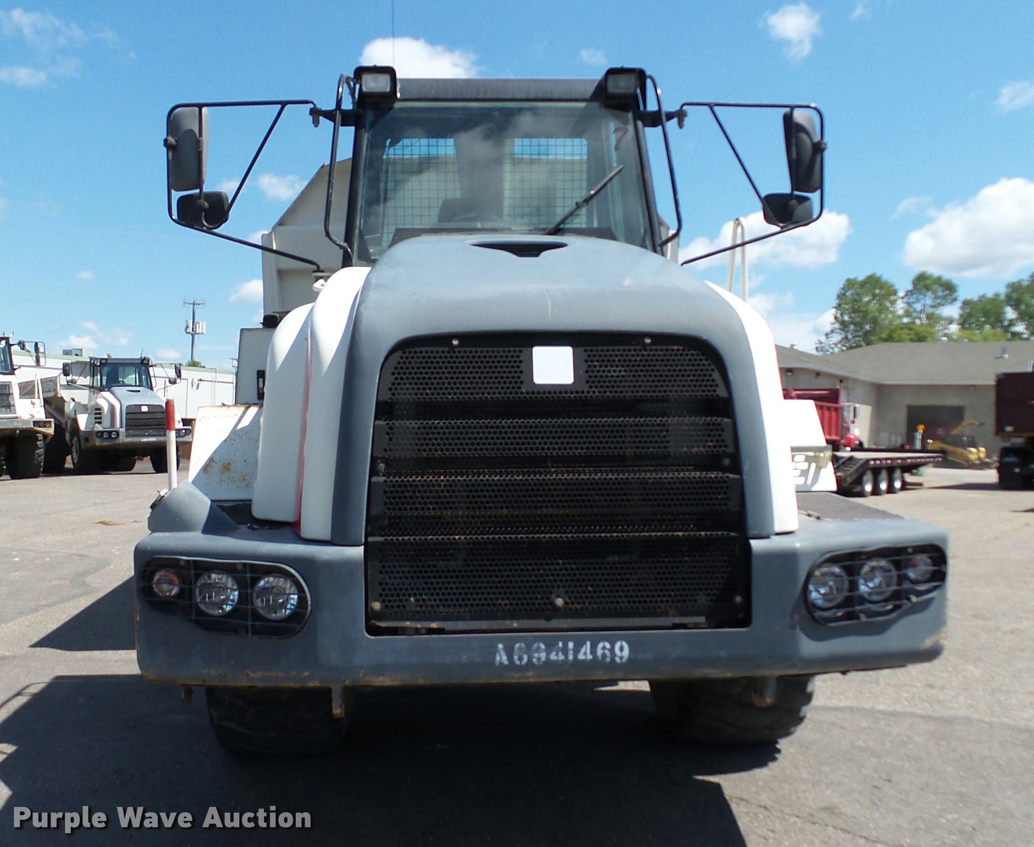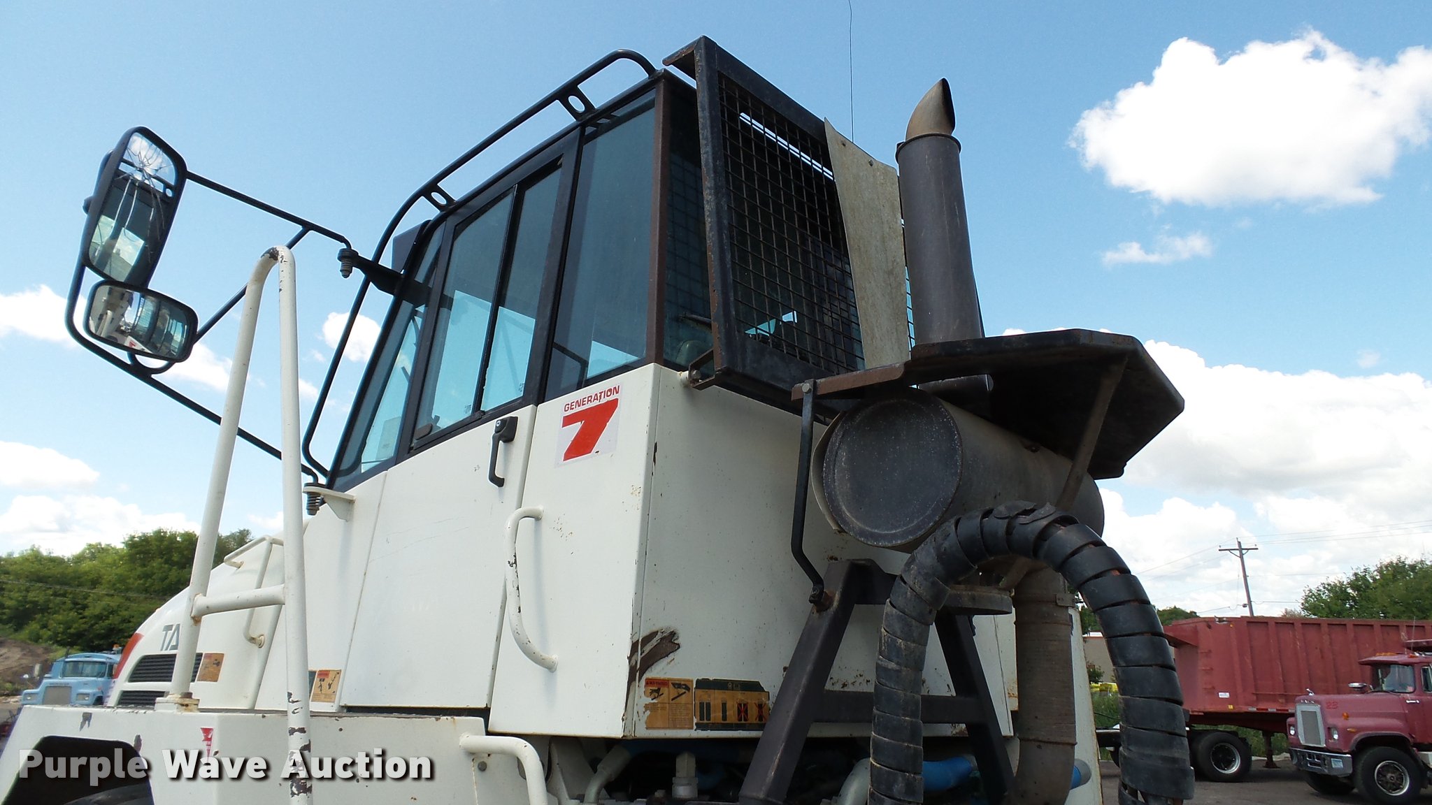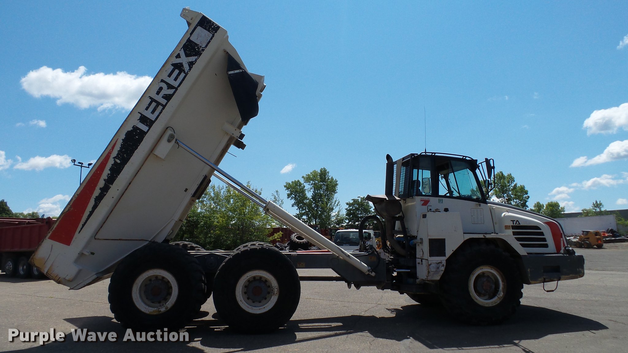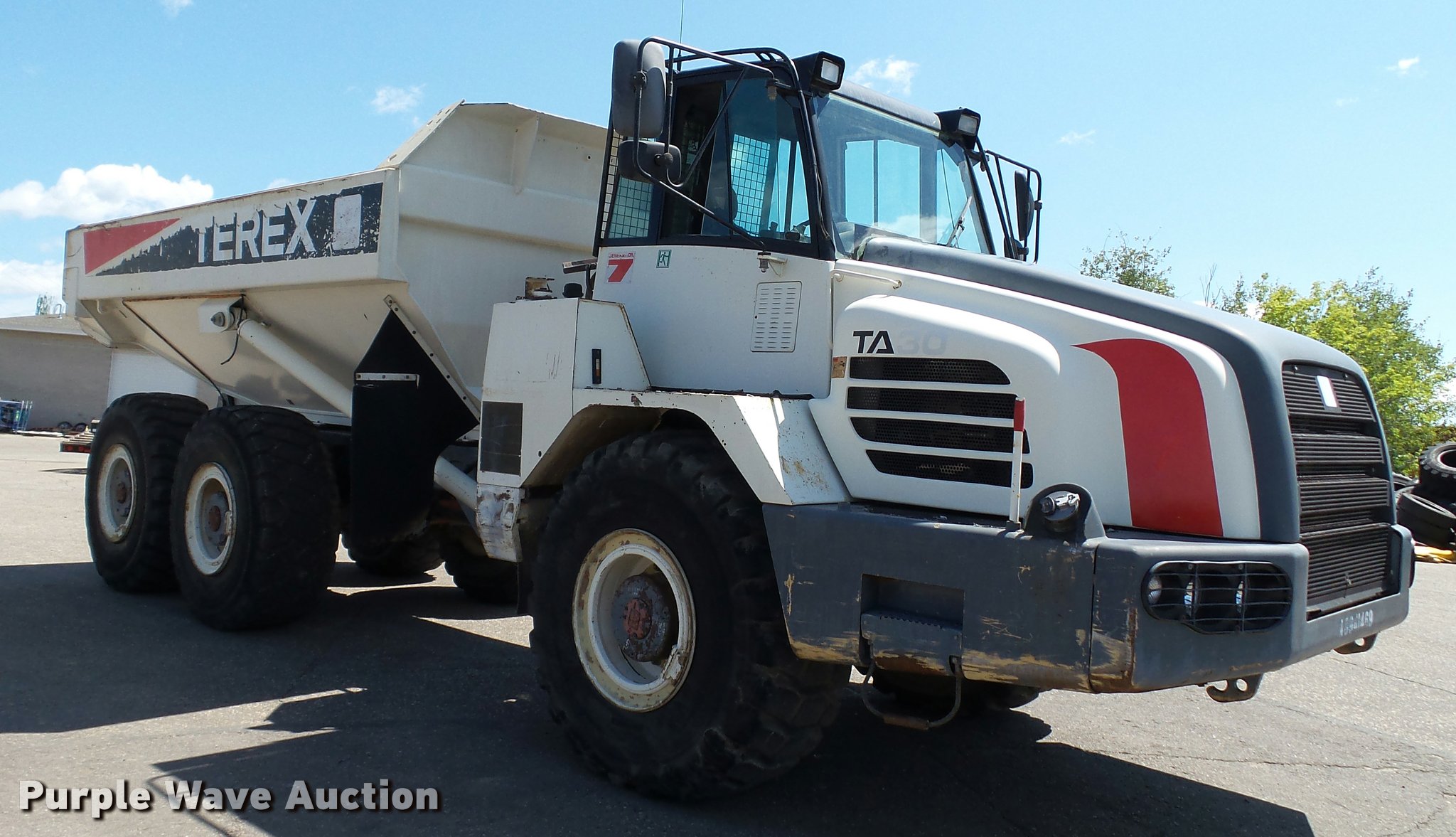 Purple Wave is selling a used Off Road Haul Truck in Minnesota. This item is a 2007 Terex TA30 haul truck with the following: 33,044 miles on odometer, 8,193 hours on meter, Cummins M11 10.8L L6 turbo diesel engine, 350 HP, Serial 35196931, Automatic transmission, 6F-3R, Six wheel drive, Tandem axle, AC and heat, AM/FM/CD, Suspension seat, Instructor seat, Backup alarm, Steel barrel bed, 17'L x 9.5'W, Dual ram hoist, Heated box, Block heater, Single fuel tank, Walking beam suspension, Hydraulic brakes, Bridestone 23.5R25 tires, 49,573 unladen weight, 61,730 lbs maximum payload capacity, Mirror cracked, Serial A8941469