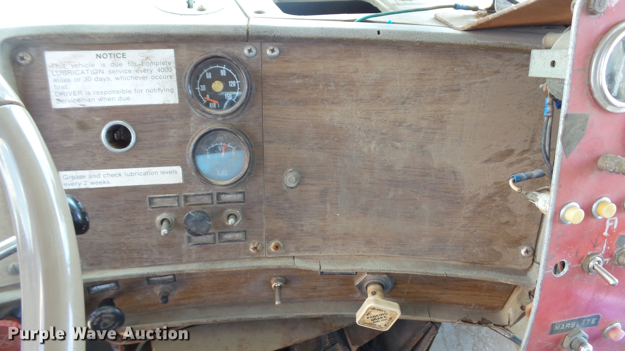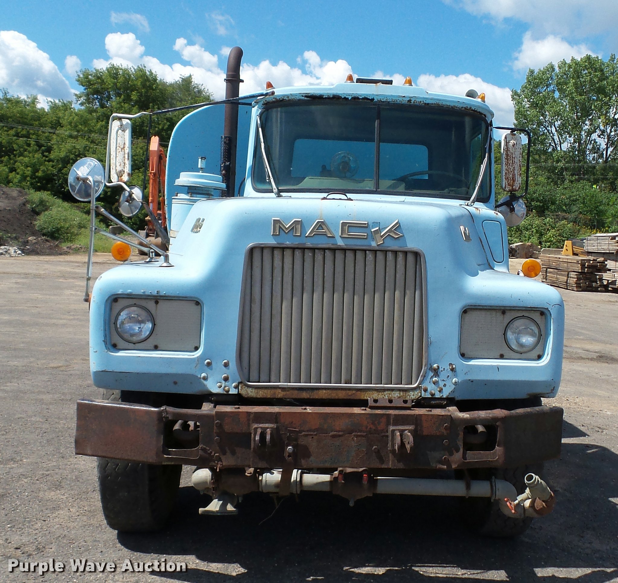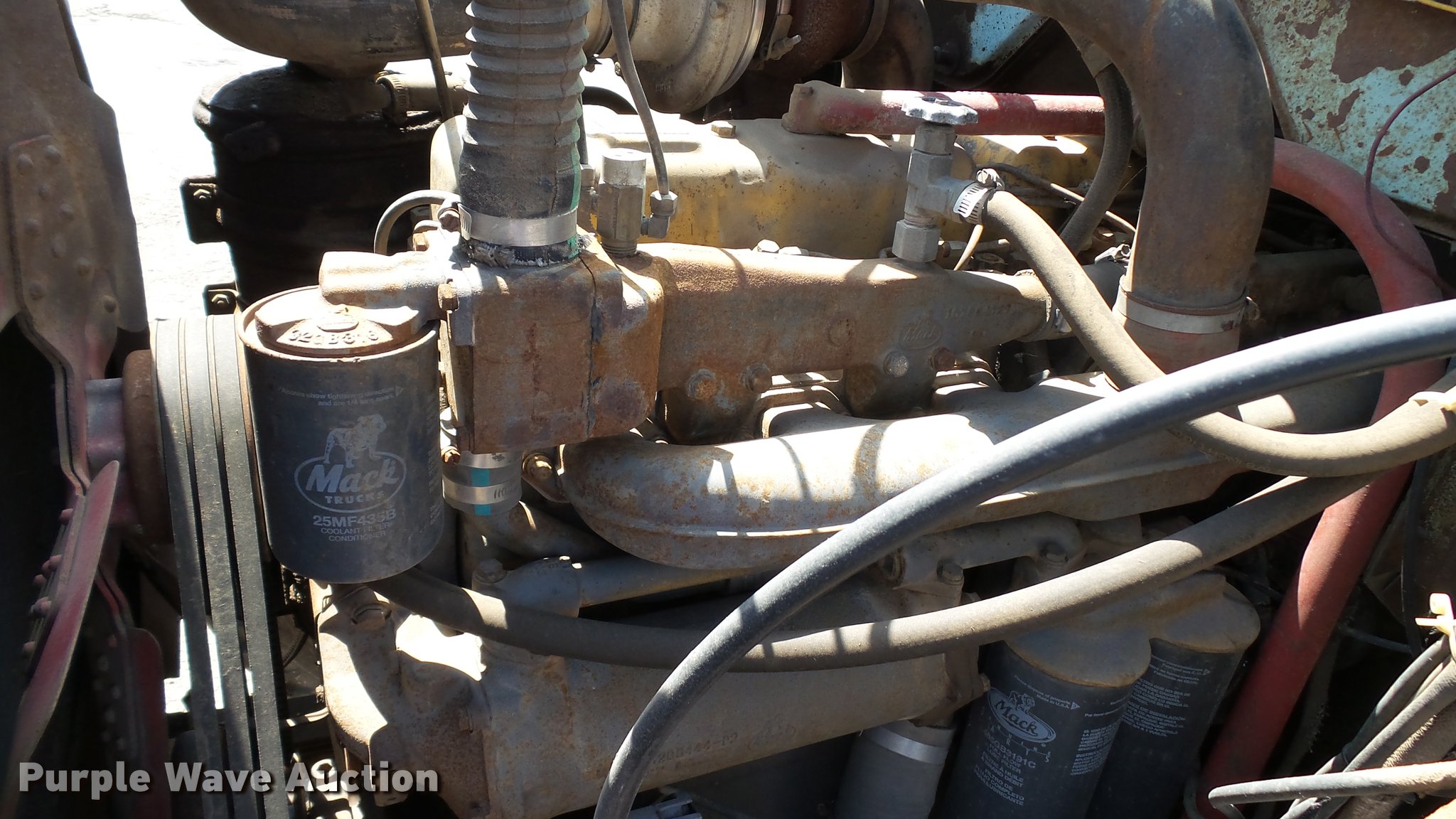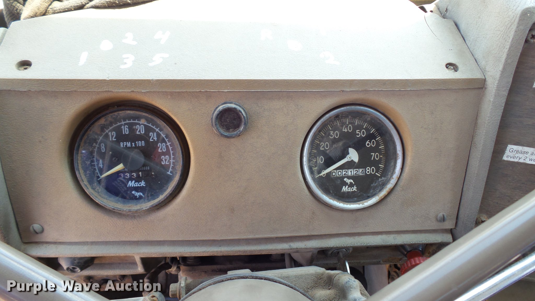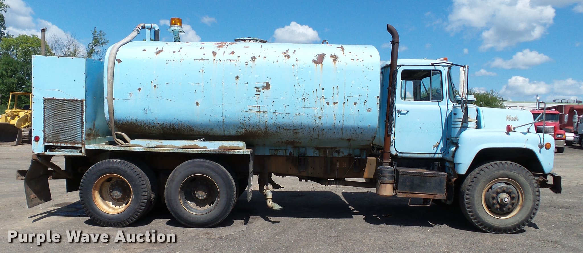 Purple Wave is selling a used Tank Truck or Water Truck in Minnesota. This item is a 1974 Mack tank truck with the following: 2,124 miles on odometer, Six cylinder turbo diesel engine, 10 speed manual transmission, Tandem axle, Heat, Air suspension seat, PTO, Beacon light, 13'L tank, Front, side, and rear discharge, 3" rear discharge, 3" rear outlet, Top fill, Six cylinder gas deck engine, 1,320 hours on meter, Battery dead, Single fuel tank, Single exhaust stack, 16'9" wheelbase, Camelback suspension, Air brakes, 12.00-20 front tires, 11R22.5 rear tires, GVWR 48,000 lbs, FAWR 14,000 lbs, IAWR 17,000 lbs, RAWR 17,000 lbs, Vehicle has not been used in approximately eight years, Unknown operating condition, Non-operational air compressor