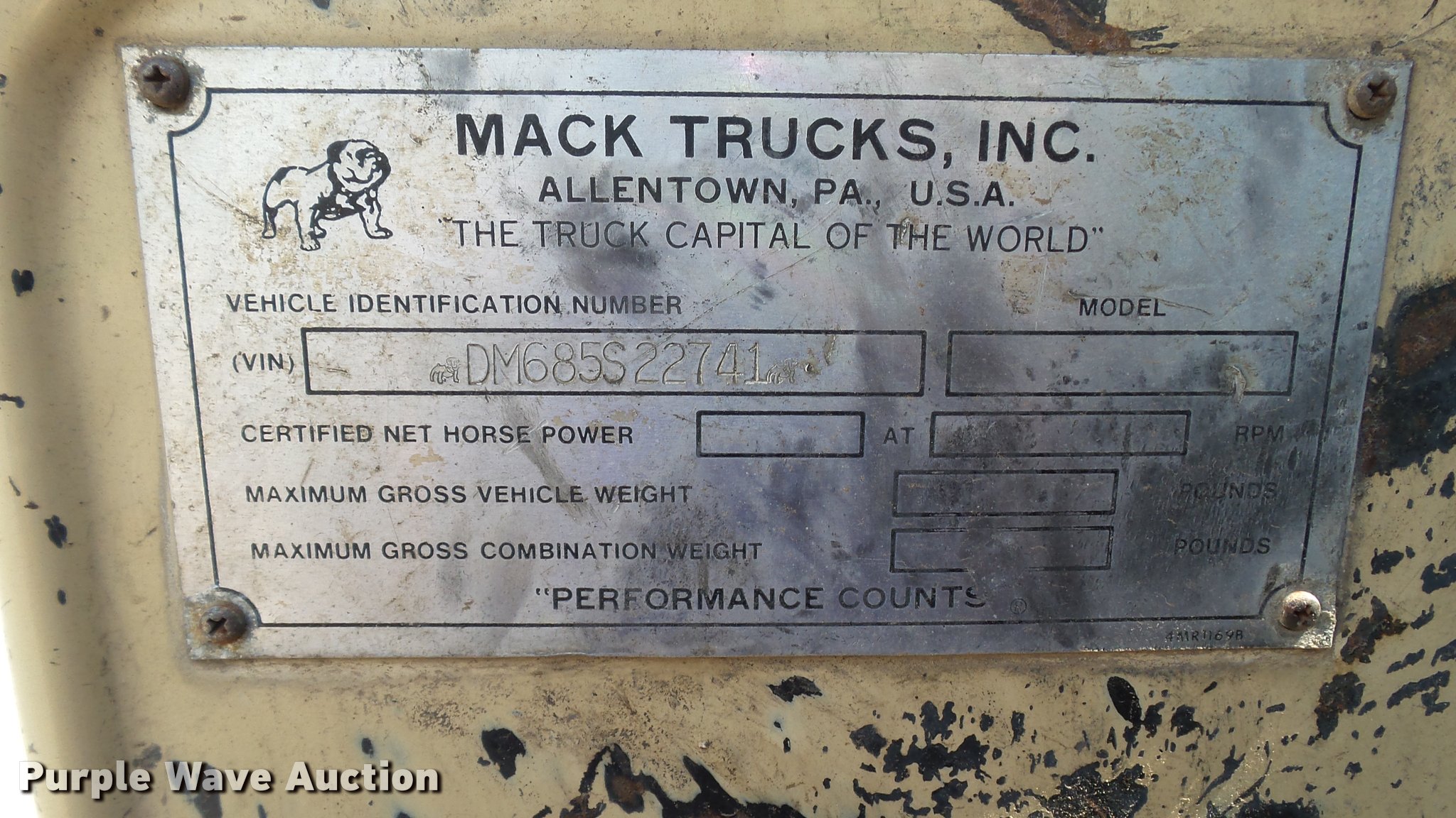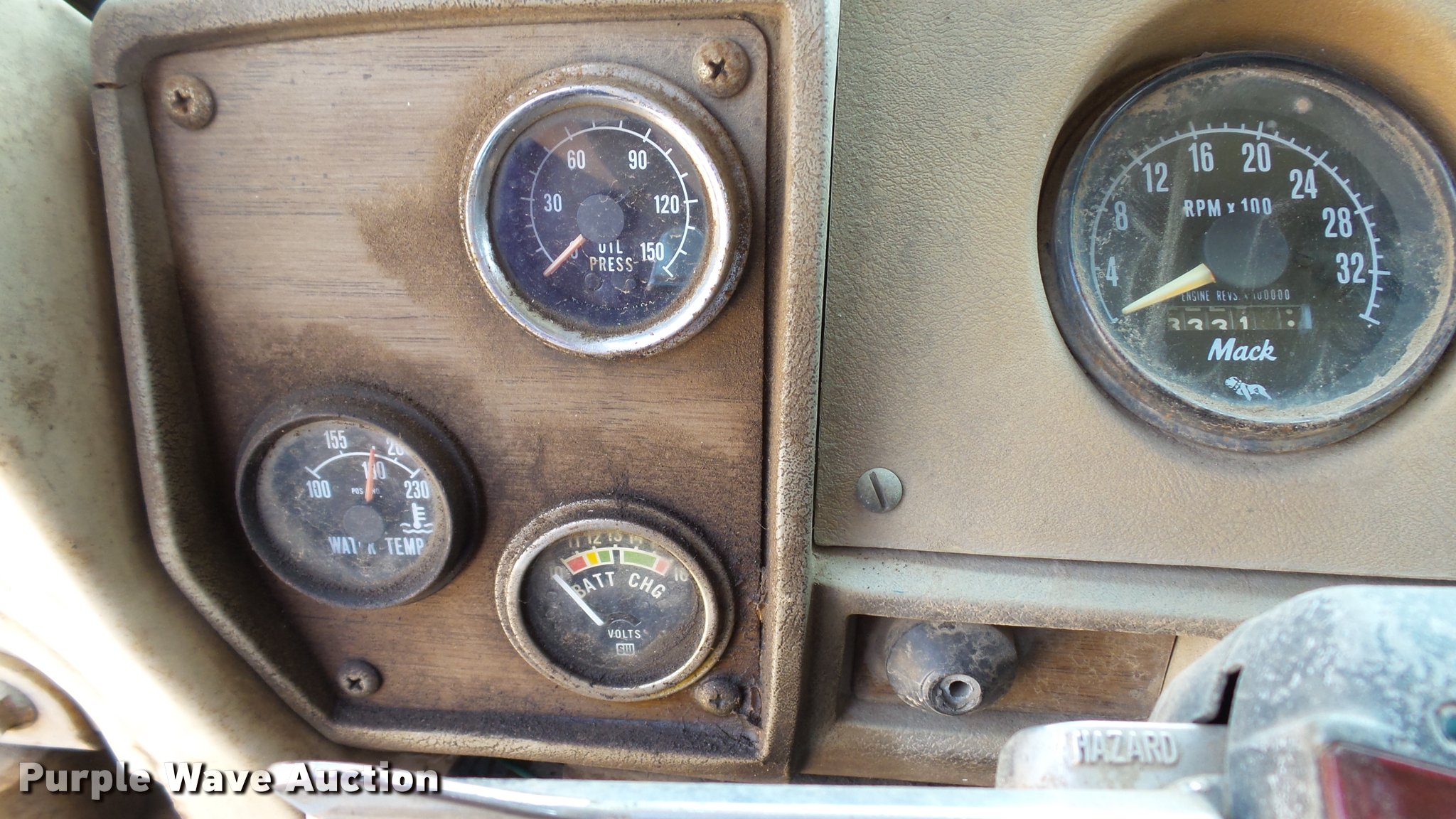 1974 Mack tank truck. 2,124 miles on odometer, Six cylinder turbo diesel engine, 10 speed manual transmission, Tandem axle, Heat, Air suspension seat, PTO, Beacon light, 13'L tank Front, side, and rear discharge, 3" rear discharge, 3" rear outlet, Top fill, Six cylinder gas deck engine 1,320 hours on meter, Battery dead, Single fuel tank, Single exhaust stack, 16'9" wheelbase, Camelback suspension, Air brakes, 12.00-20 front tires, 11R22.5 rear tires, GVWR 48,000 lbs, FAWR 14,000 lbs, IAWR 17,000 lbs, RAWR 17,000 lbs, Vehicle has not been used in approximately eight years, Unknown operating condition, Non-operational air compressor. Minnesota title. Title distribution may be delayed up to 30 days from verification of funds. DM685522741. Kevitt Excavating LLC - Open inspection Sept. 6. 3335 Pennsylvania Ave N. Crystal, MN 55427