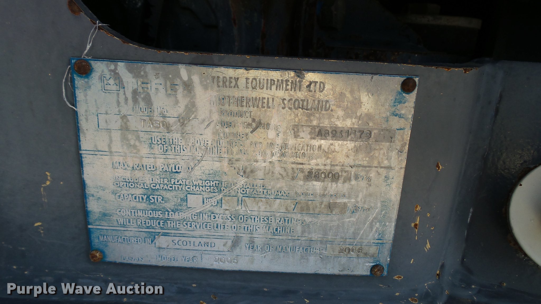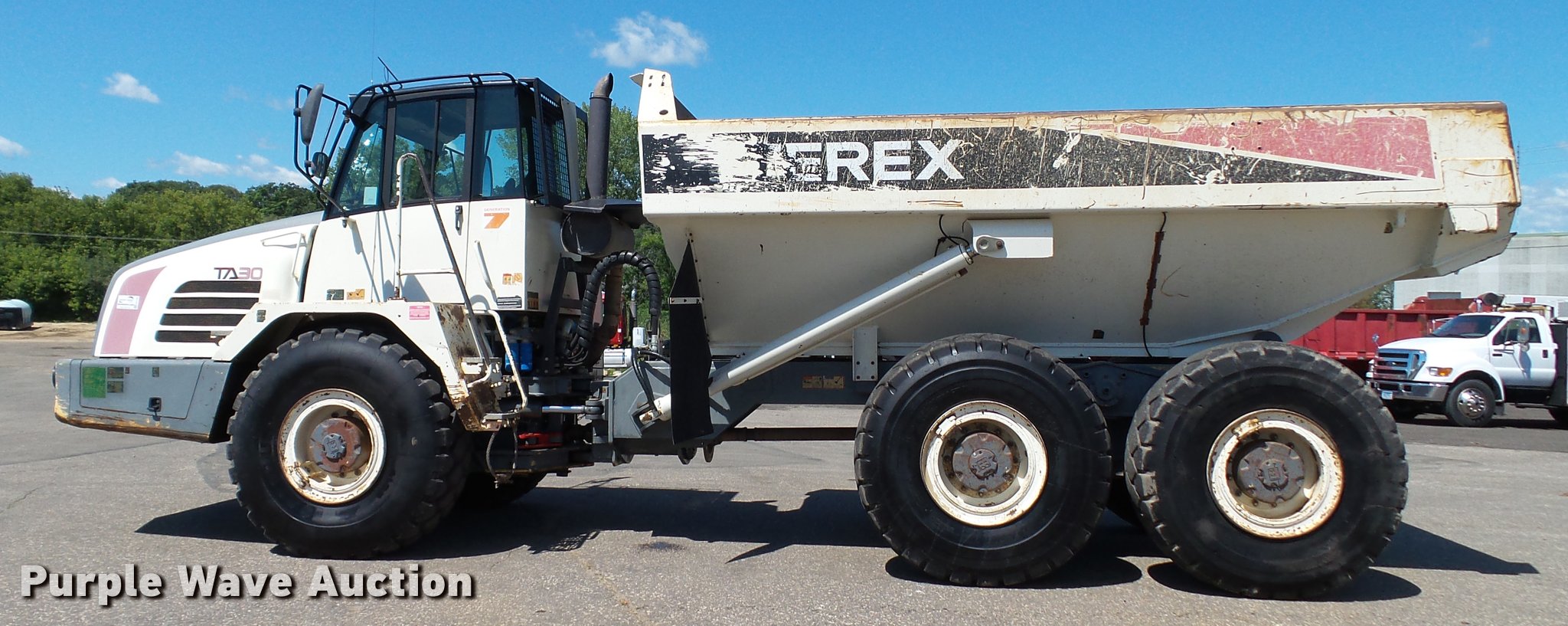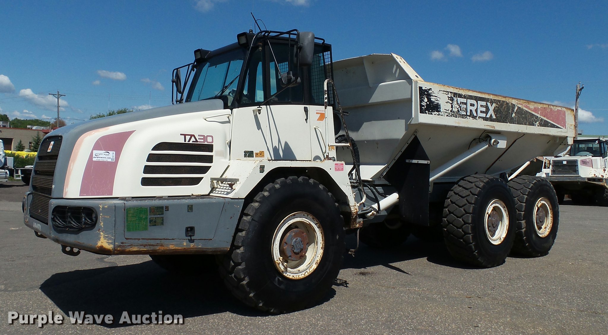 Purple Wave is selling a used Off Road Haul Truck in Minnesota. This item is a 2006 Terex TA30 haul truck with the following: 7,949 hours on meter, Cummins M11 10.8L L6 turbo diesel engine, 350 HP, Serial 35166035, Automatic transmission, 6F-3R, Six wheel drive, Inter-axle differential lock, Tandem axle, AC and heat, Tilt, AM/FM/CD, Suspension seat, Instructor seat, Backup alarm, Block heater, Steel barrel bed, 17'L x 95"W, Dual ram hoist, Heated box, Block heater, Single fuel tank, Walking beam suspension, Hydraulic brakes, 23.5R25 tires, 61,730 lbs maximum payload capacity, Windshield cracked
