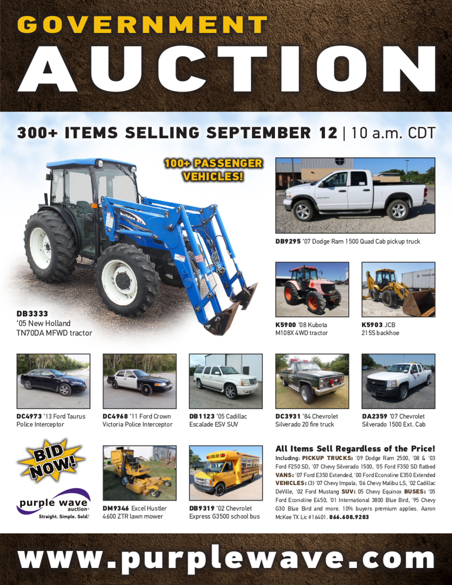- All information for vehicles, equipment, or items offered for sale is intended to be as accurate as possible; however, bidders are urged to examine the vehicles, equipment, and items before bidding. An error or omission in the listing will not change the results of the bid.