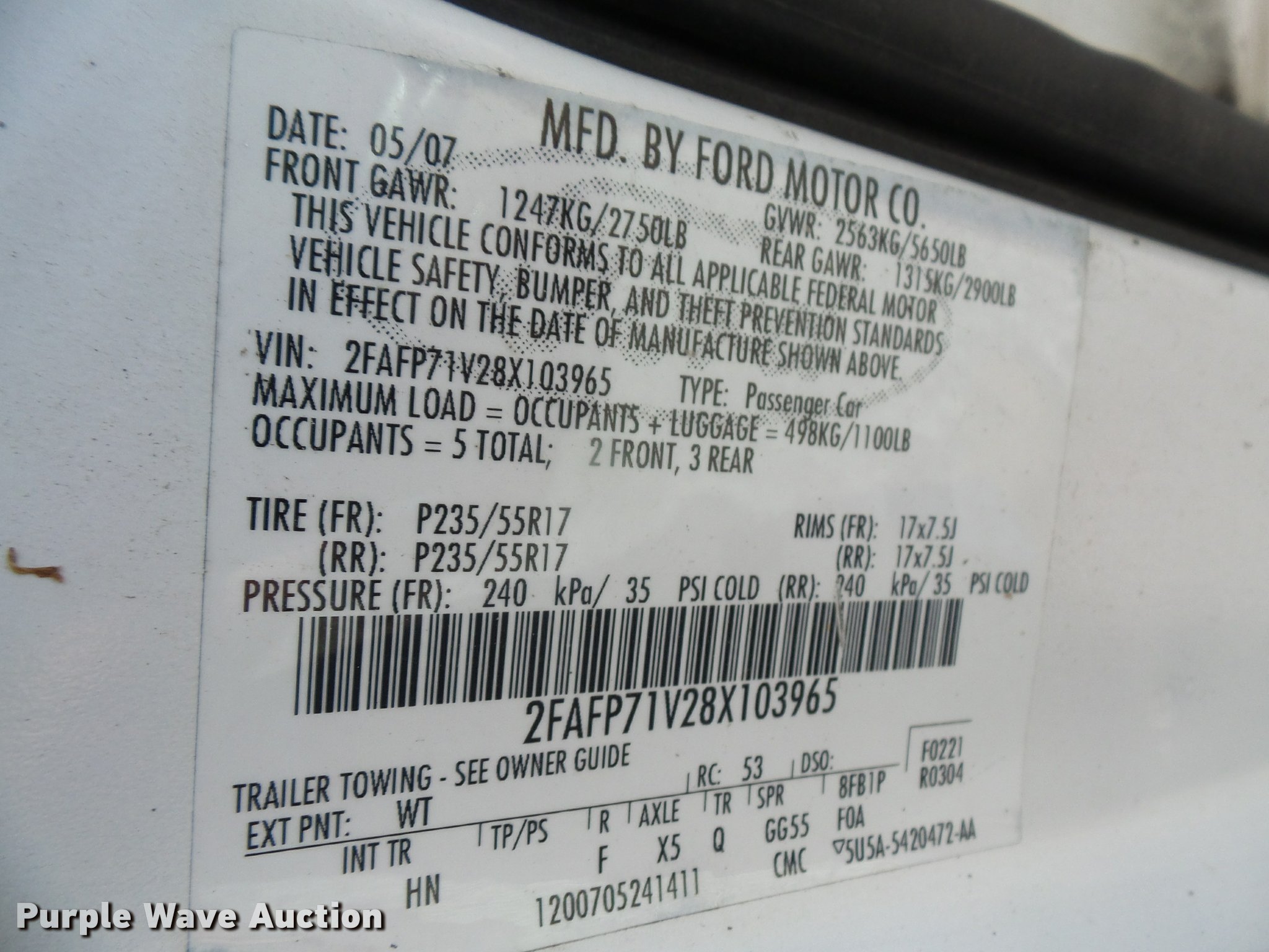 Purple Wave is selling a used Passenger Vehicle in Kansas. This item is a 2008 Ford Crown Victoria Police Interceptor with the following: 189,553 miles on odometer, 4.6L V8 SOHC 16V FFV gas engine, Automatic transmission, AC and heat, Tilt, Cruise, AM/FM, Power windows, locks, mirrors, and seat, Cloth interior, Grill guard, 235/55R17 tires, Dead battery, Unit# 102