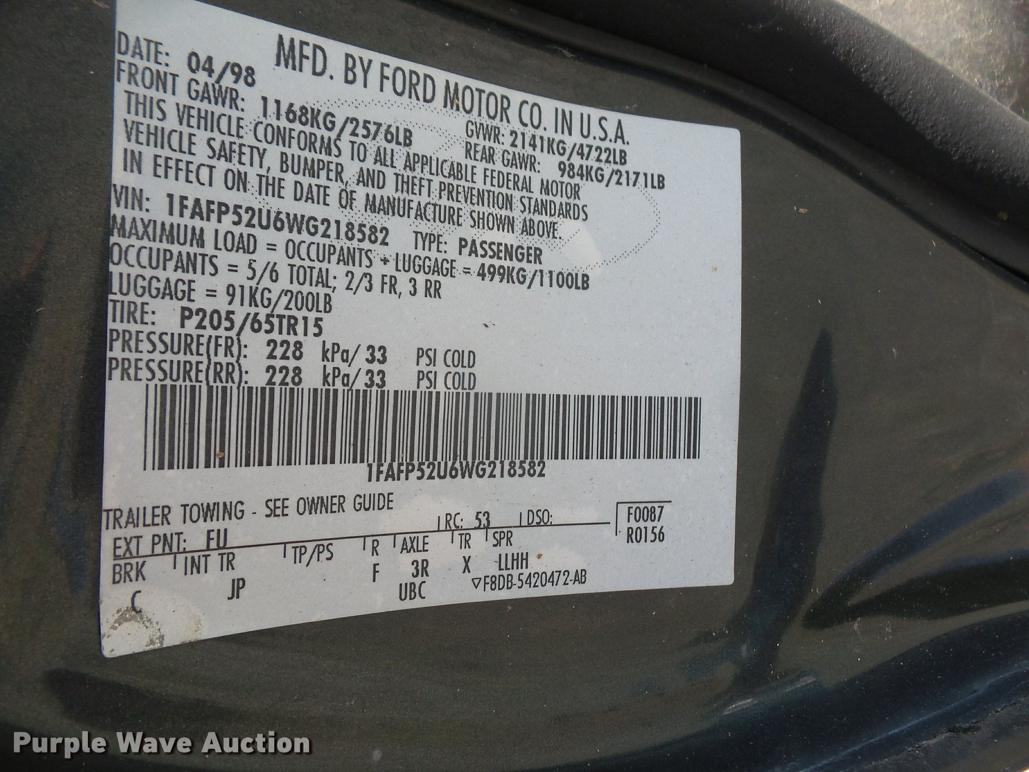 Purple Wave is selling a used Passenger Vehicle in Kansas. This item is a 1998 Ford Taurus with the following: 75,685 miles on odometer, 3.0L V6 OHV 12V gas engine, Automatic transmission, AC and heat, Tilt, Cruise, AM/FM, Power windows, locks, and mirrors, Cloth interior, 205/65R15 tires, Dead battery, Unit# 357