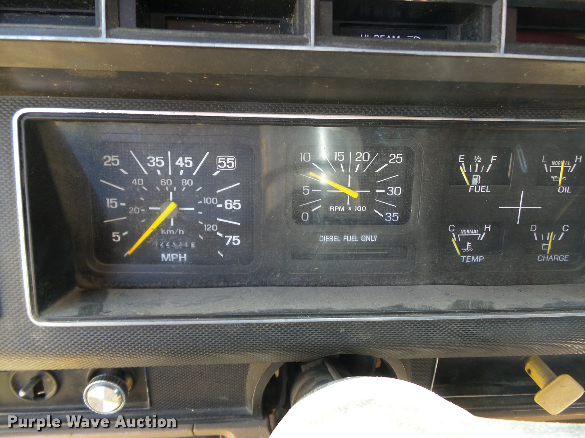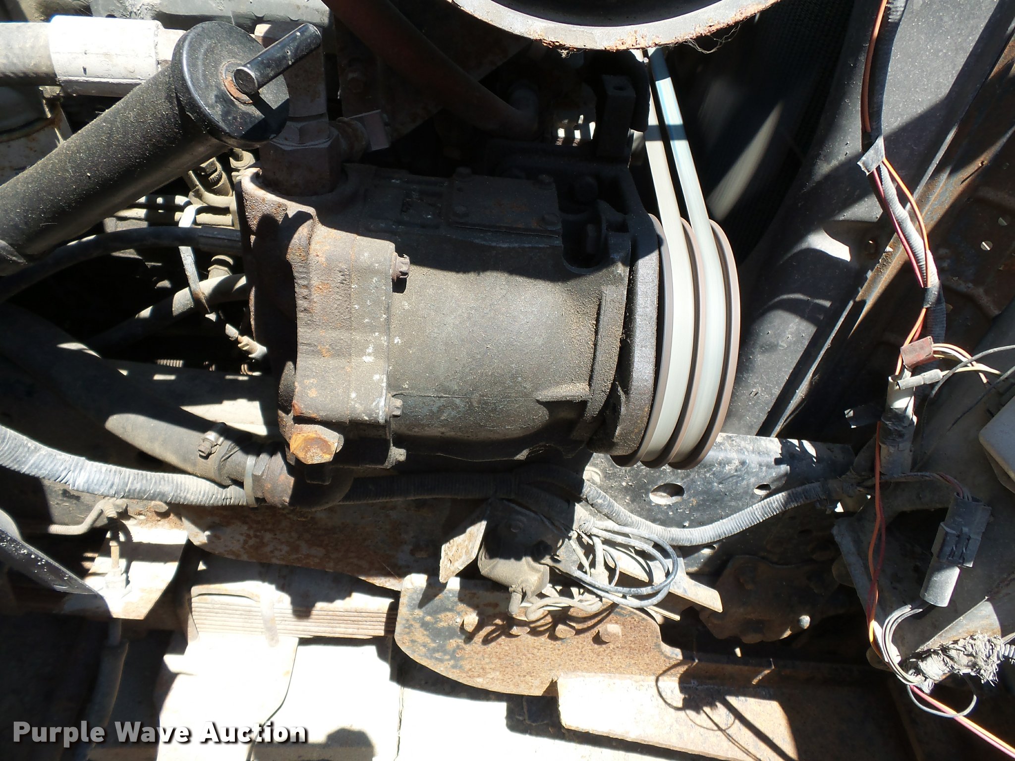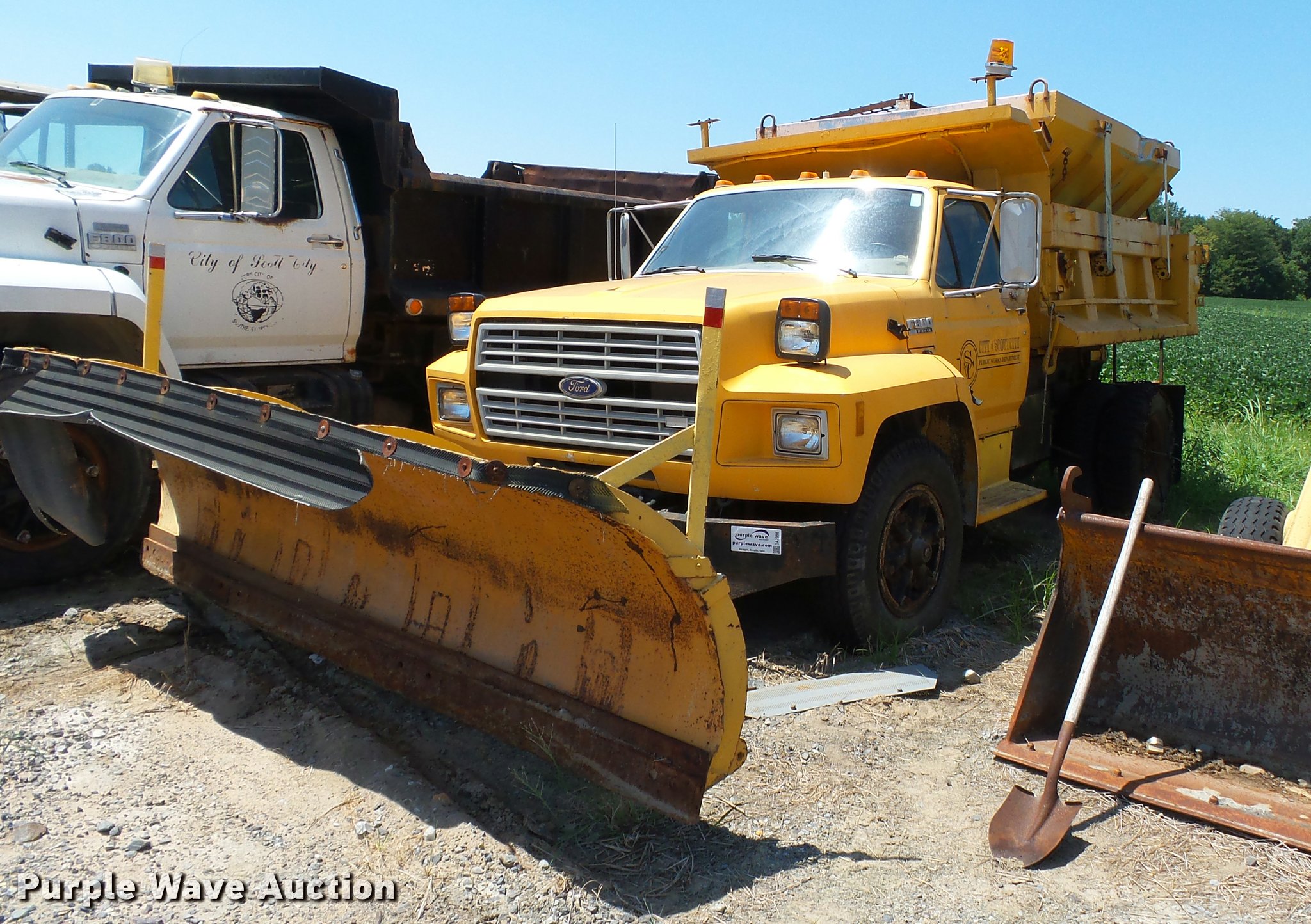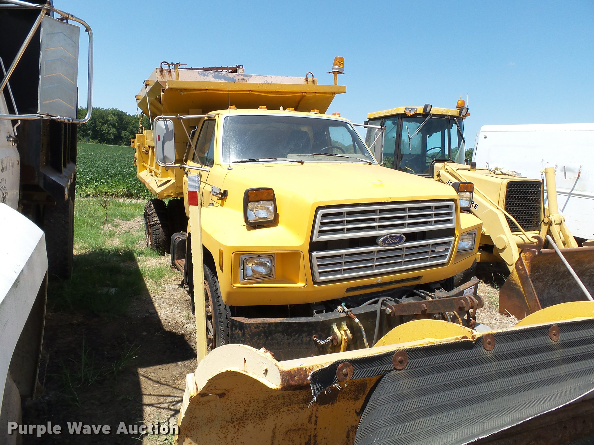 Purple Wave is selling a used Construction Dump Truck in Missouri. This item is a 1989 Ford F800 dump truck with the following: 122,534 miles on odometer, 49 hours on meter, Ford 7.8L L6 turbo diesel engine, 10 speed manual transmission, Single axle, Heat, AM, Suspension seat, PTO, 9'L x 84"W steel dump bed, 27" side height, 6" side board height, Single ram hoist, 11'W plow, Single fuel tank, Pintle hitch, Spring suspension, Air brakes, 140" wheelbase, 9.00-20 tires, Unknown operating condition, Brake light on, Electric motor brake light on