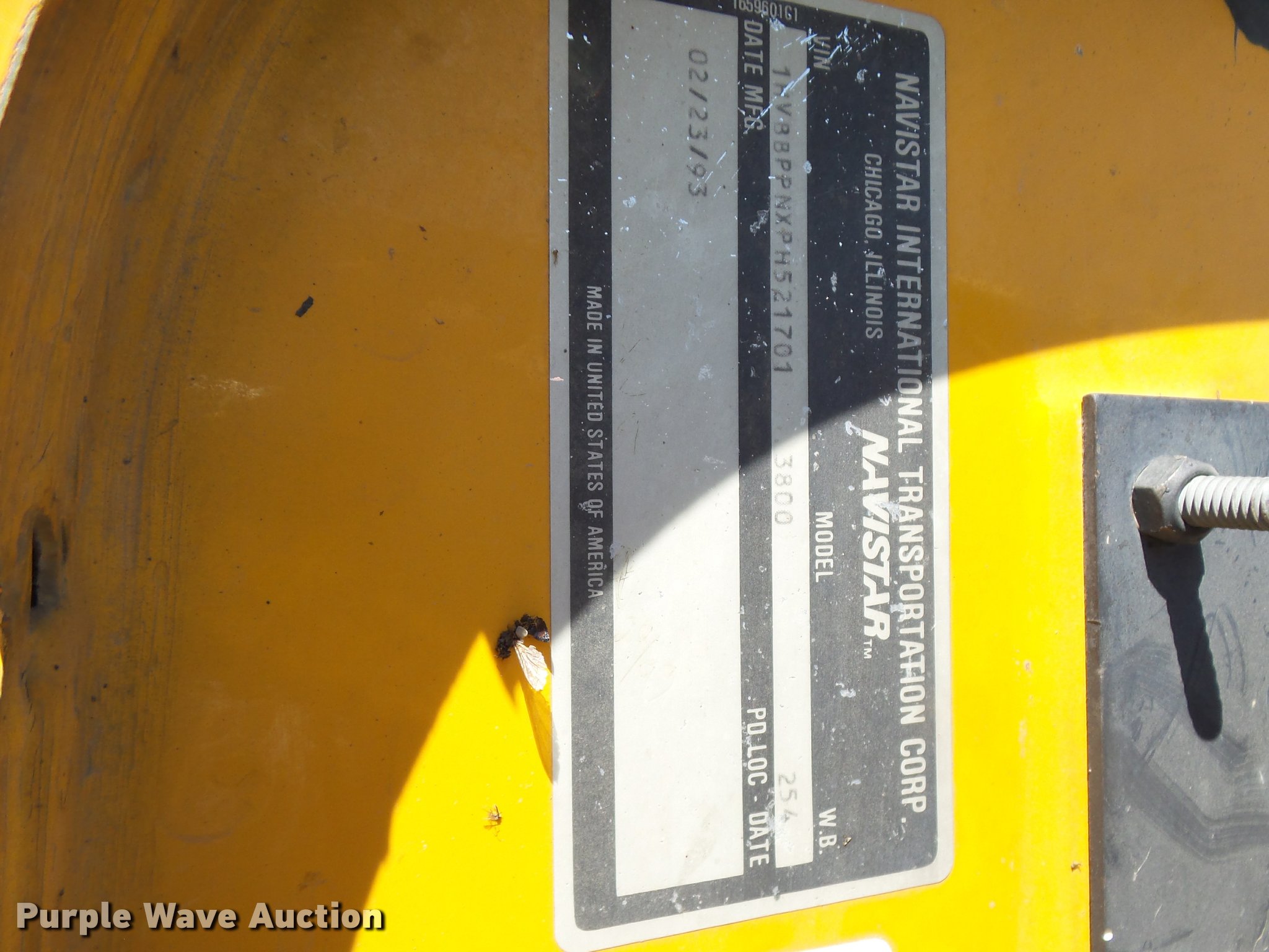 1993 International 3800 school bus. 291,700 miles on odometer, International E210 7.6L L6 turbo diesel engine Serial 1820803C1, Allison MT643 automatic transmission, Single axle, Heat, AM/FM, Electric passenger sliding door, 66 passenger capacity, Ceiling, front, and rear emergency exits, Lighted stop sign, Backup alarm, Front and rear tow hooks, Air suspension, Air brakes, 254" wheelbase, 10R22.5 tires, GVWR 30,000 lbs, Unit# 24. Colorado title. Seller is a government entity who will be assigning and distributing the title. Please contact the seller for distribution questions. 1HVBBPPNXPH521701. Brush School District RE-2J. 527 Industrial Park Rd. Brush, CO 80723