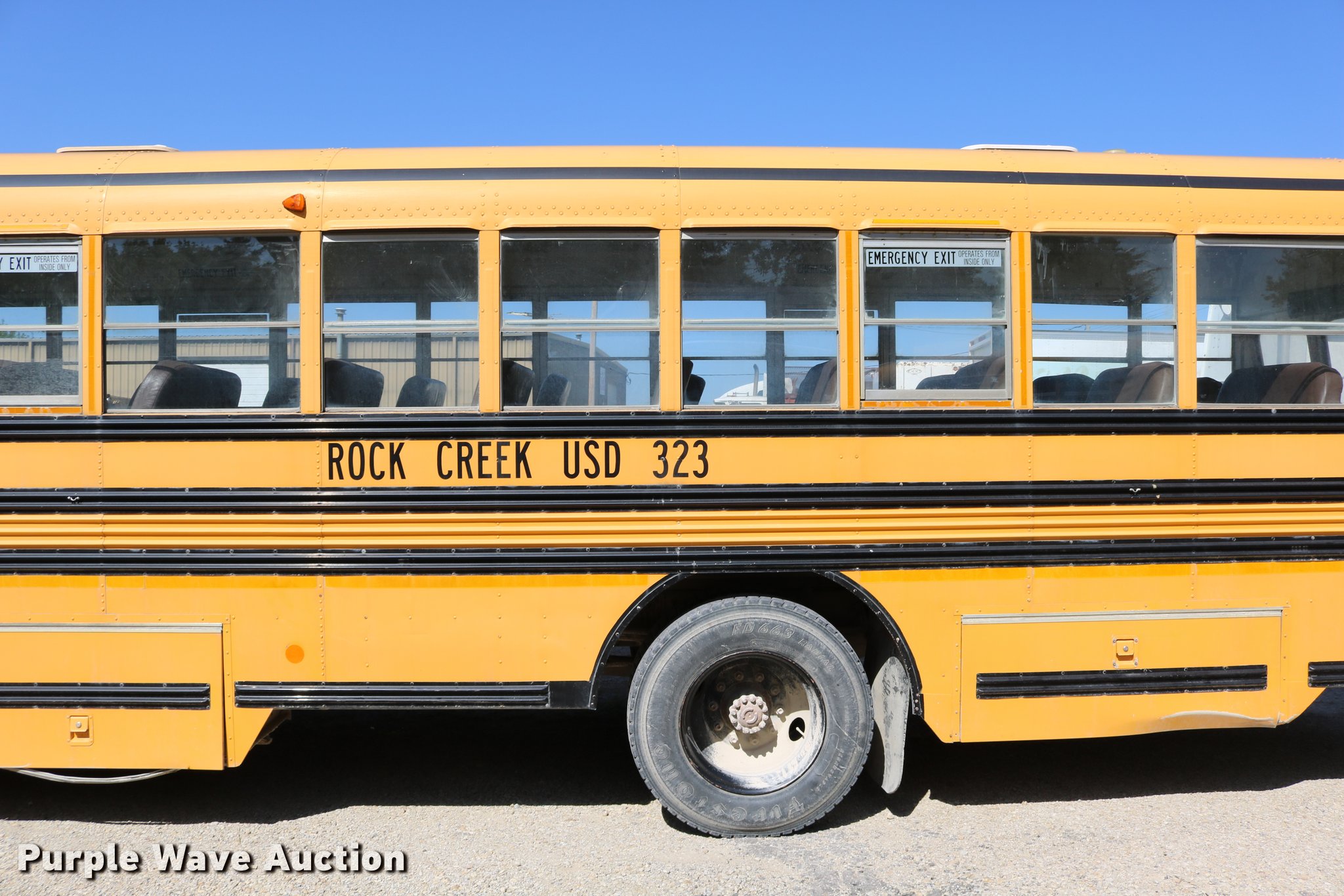 1999 Freightliner FS65 Blue Bird school bus. 214,375 miles on odometer, Cummins ISB 5.9L L6 turbo diesel engine Serial 4031017, Five speed manual transmission, Single axle, Heat, AM/FM, Heated mirrors, 64 passenger capacity, Ceiling, rear, and side emergency exits, Emergency door alarms, Lighted stop sign, Block heater, Backup alarm, Underside luggage storage Doors will not open, Front and rear tow hooks, Spring suspension, Hydraulic brakes, Approx. 251" wheelbase, 10R22.5 tires, GVWR 27,500 lbs, CB not included, Unit# 99-1. Kansas title. 4UZ3CFAA1XCB52178. USD 323 Rock Creek. 200 Blackjack Rd. Saint George, KS 66535