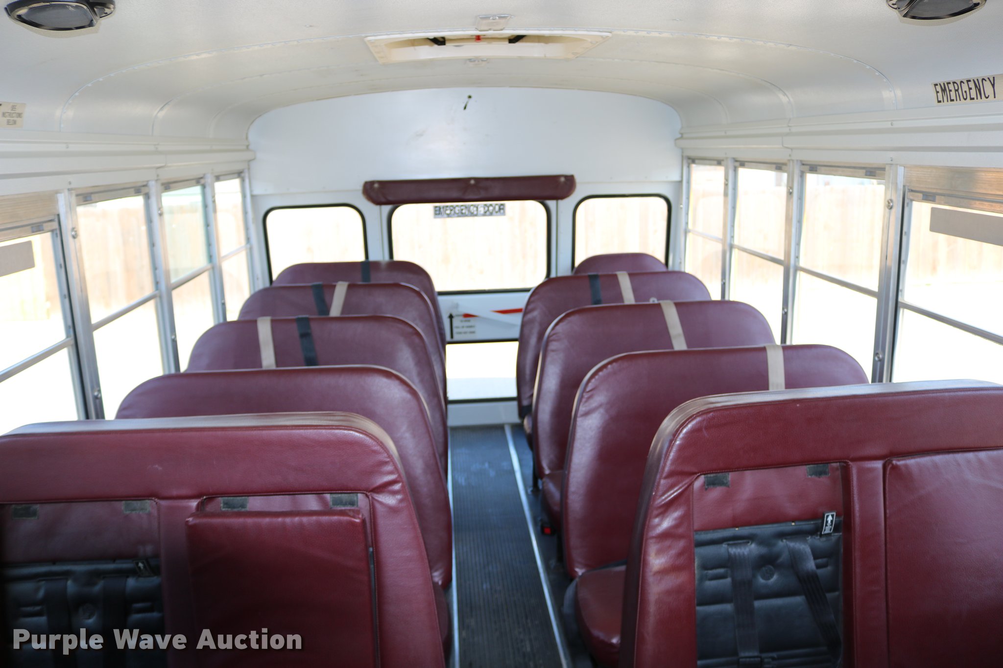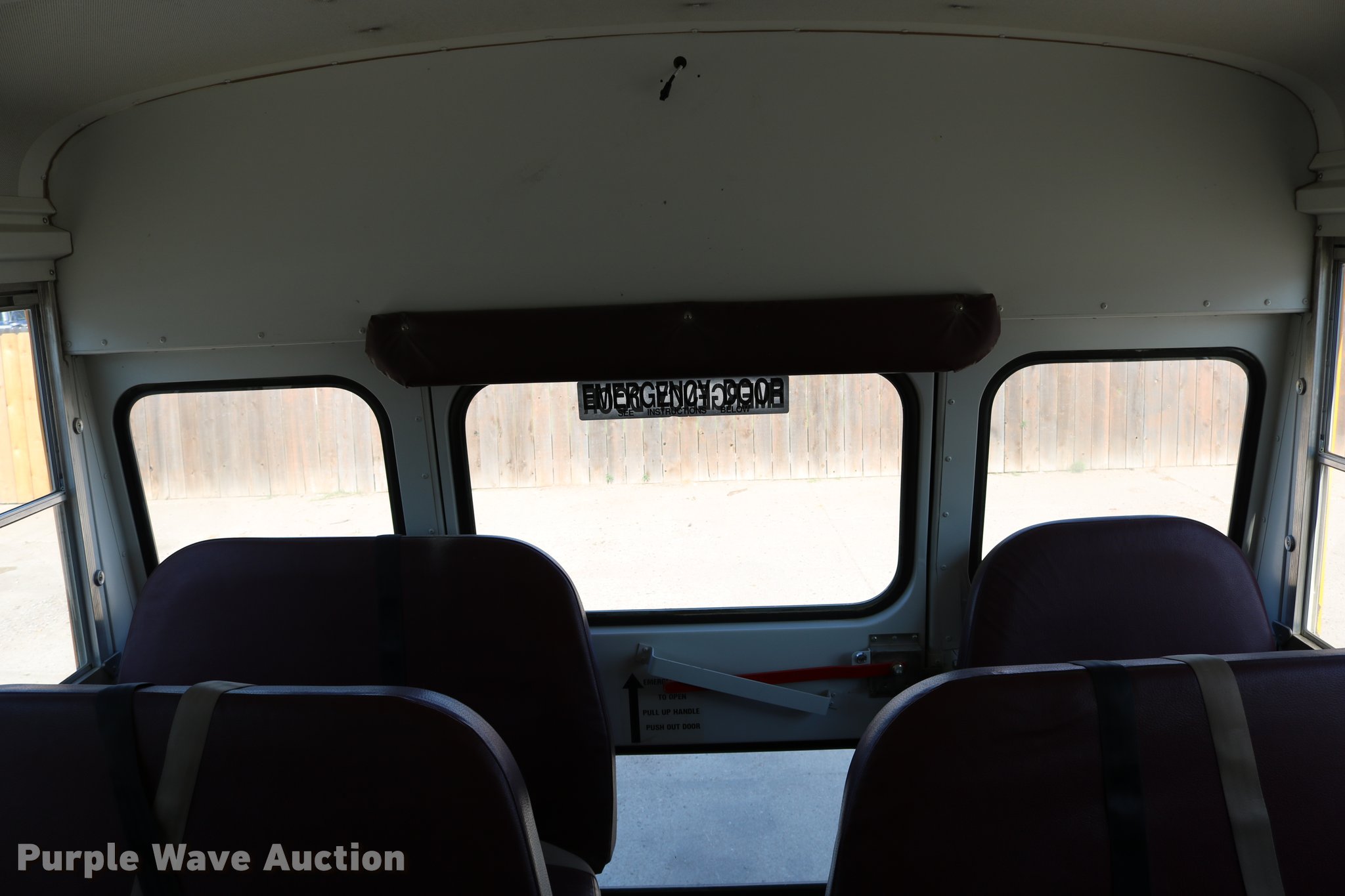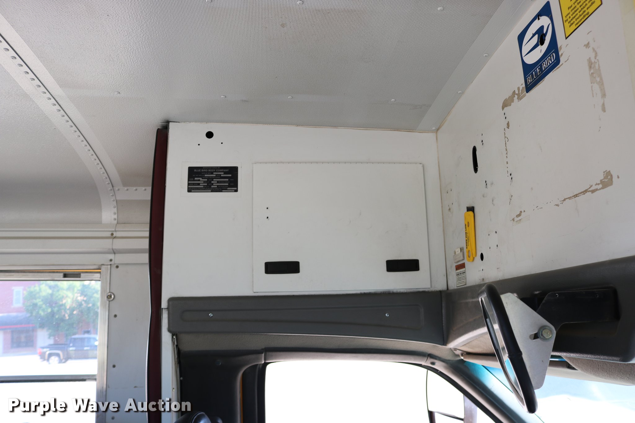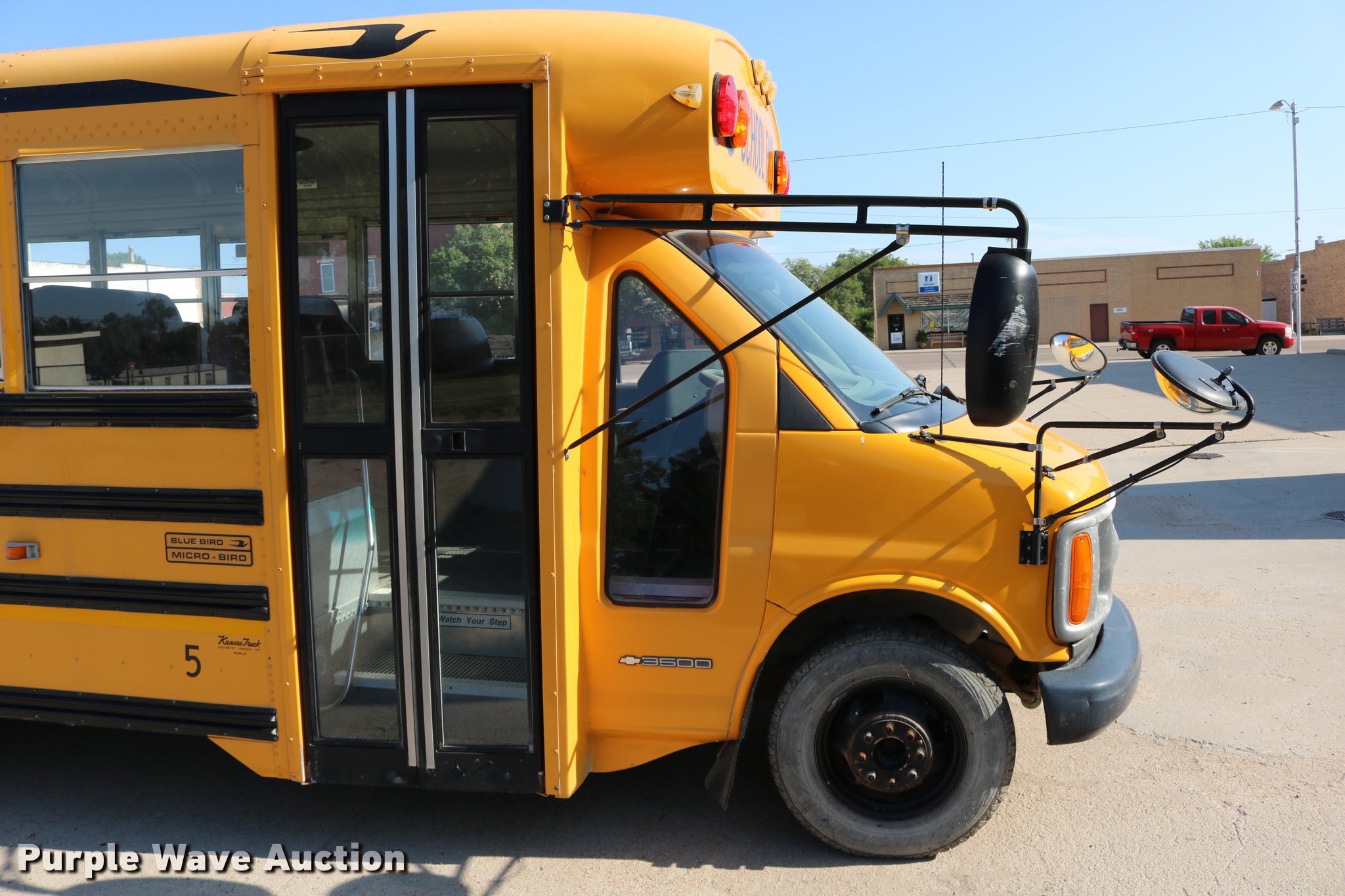 Purple Wave is selling a used Bus in Kansas. This item is a 2002 Chevrolet Express G3500 school bus with the following: 143,745 miles on odometer, 5.7L V8 OHV 16V gas engine, Automatic transmission, Single axle, Heat, AM/FM/CD, Heated mirrors, Blue Bird Miro-Bird body, (29) adult seats, Seat belts, (4) child seats, Ceiling, rear, and side emergency exits, Emergency door alarms, Beacon light, Lighted stop sign, Backup alarm, 160" wheelbase, Hydraulic brakes, 225/75R16 tires, GVWR 12,000 lbs, FAWR 4,300 lbs, RAWR 8,600 lbs