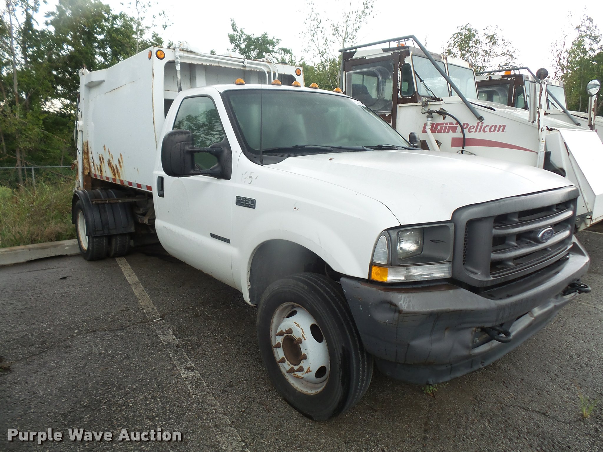 Purple Wave is selling a used Refuse Truck in Kansas. This item is a 2003 Ford F550 refuse truck with the following: 175,034 miles on odometer, 7.3L V8 OHV 16V turbo diesel engine, Automatic transmission, Heat, AM/FM, Manual windows and locks, Vinyl interior, Front tow hooks, PTO, Scranton Mfg. refuse bed, 13.5'L, 225/70R19.5 tires