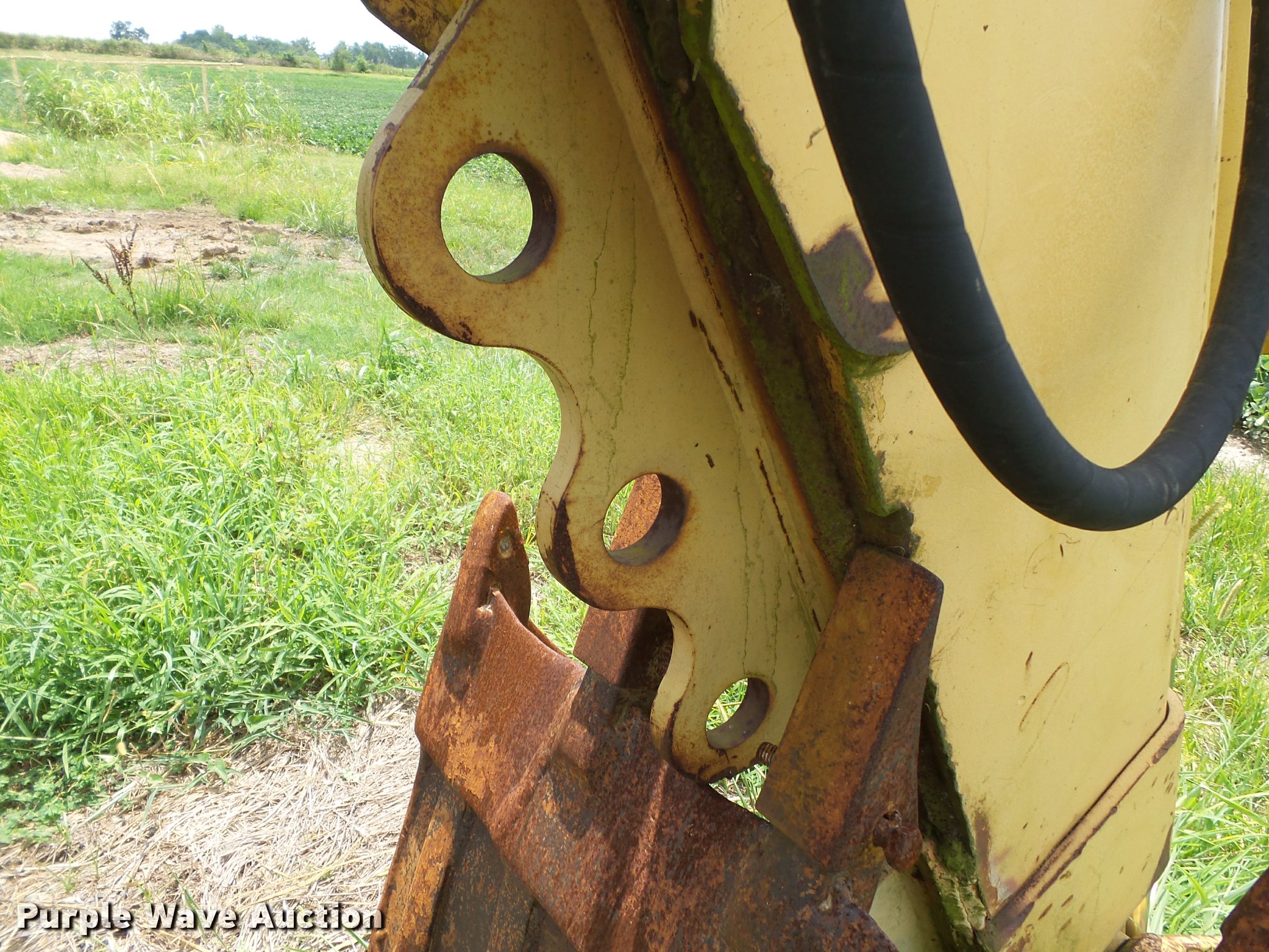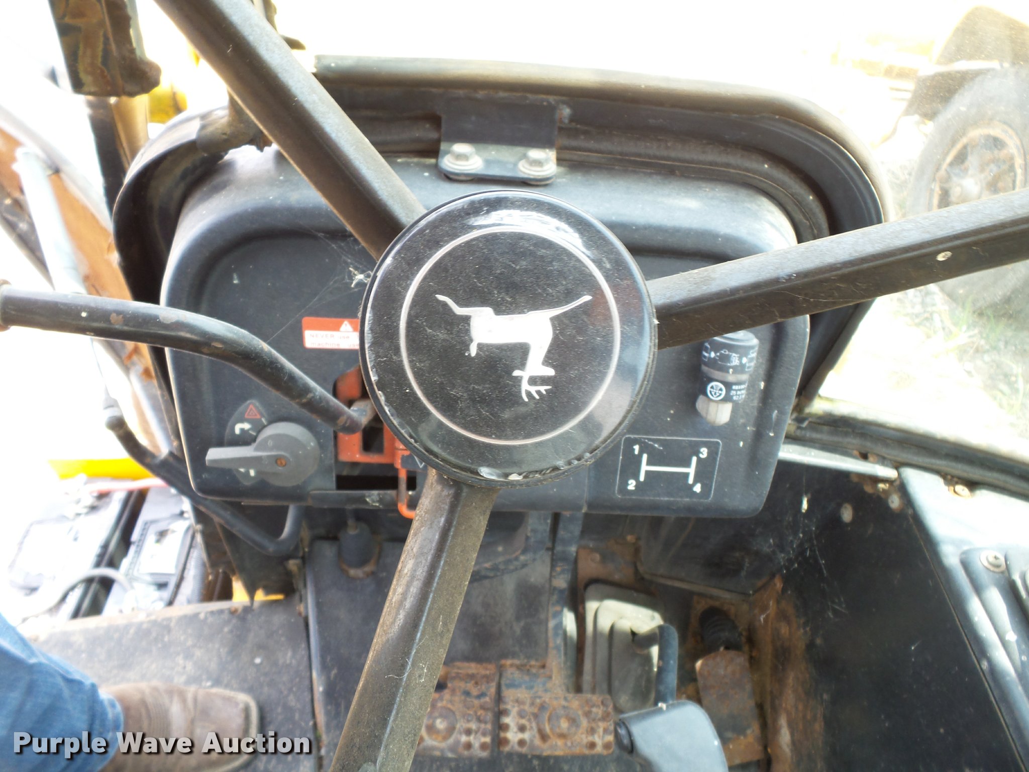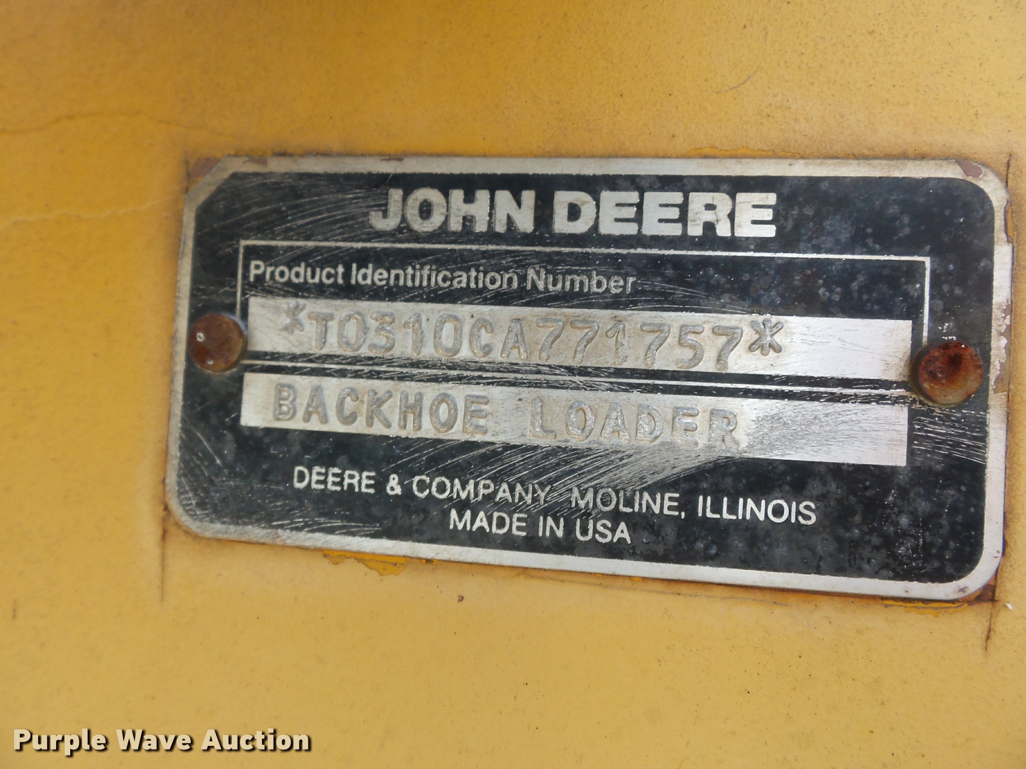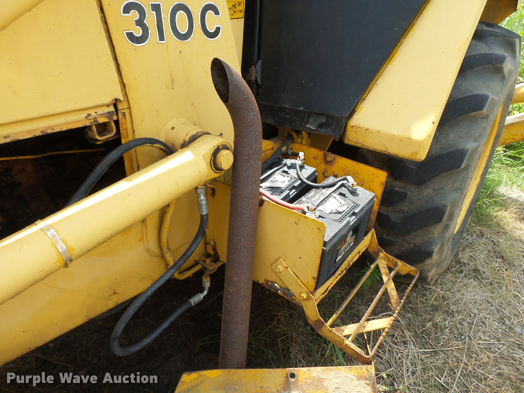 Purple Wave is selling a used Tractor Loader Backhoe in Missouri. This item is a 1990 John Deere 310C backhoe with the following: 9,720 hours on meter, John Deere four cylinder diesel engine, Shuttle shift transmission, 4F-4R gears, Differential lock, Enclosed cab, Heat, Wobble stick backhoe controls, Foot backhoe control, Suspension seat, Front work lights, Wipers, 92"W loader bucket, Bolt-on cutting edge, E-stick, 24"W backhoe bucket, (4) teeth, Thumb mount, 11L-16 front tires, 16.9-24 rear tires, Left window missing, Unknown operating condition, Serial T0310CA771757