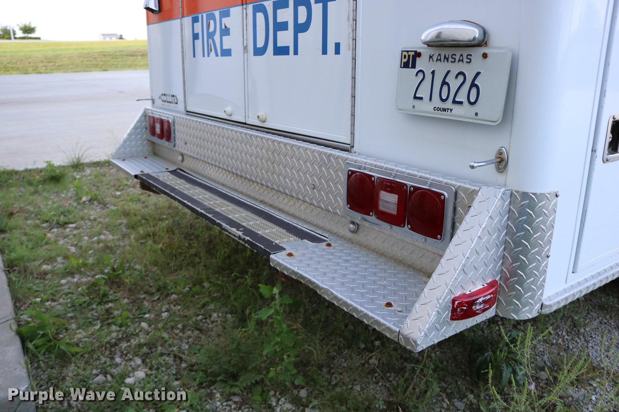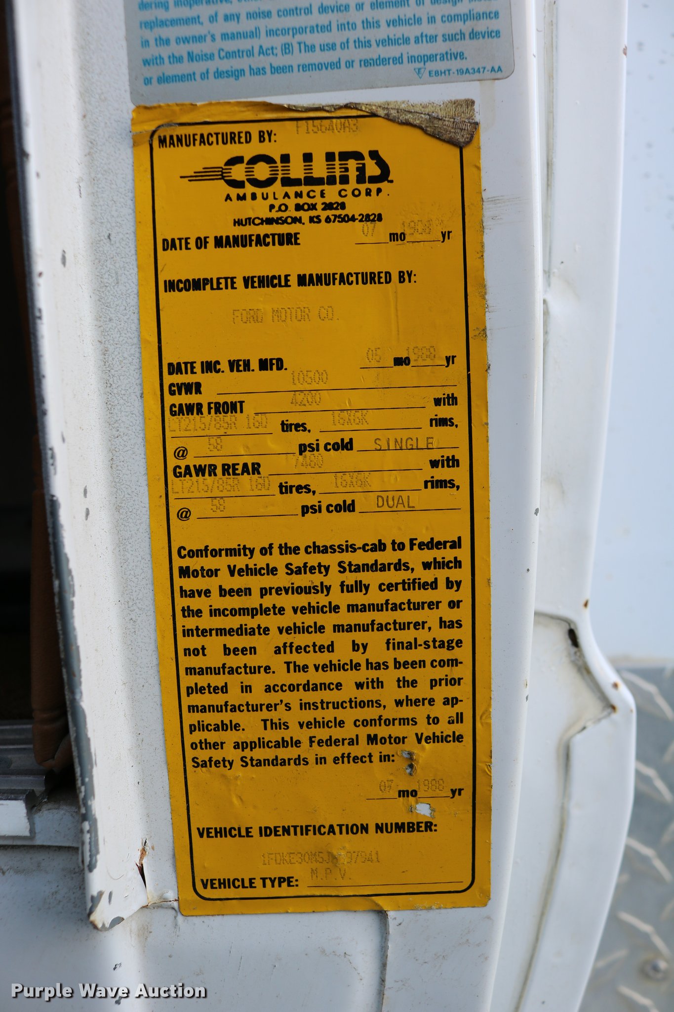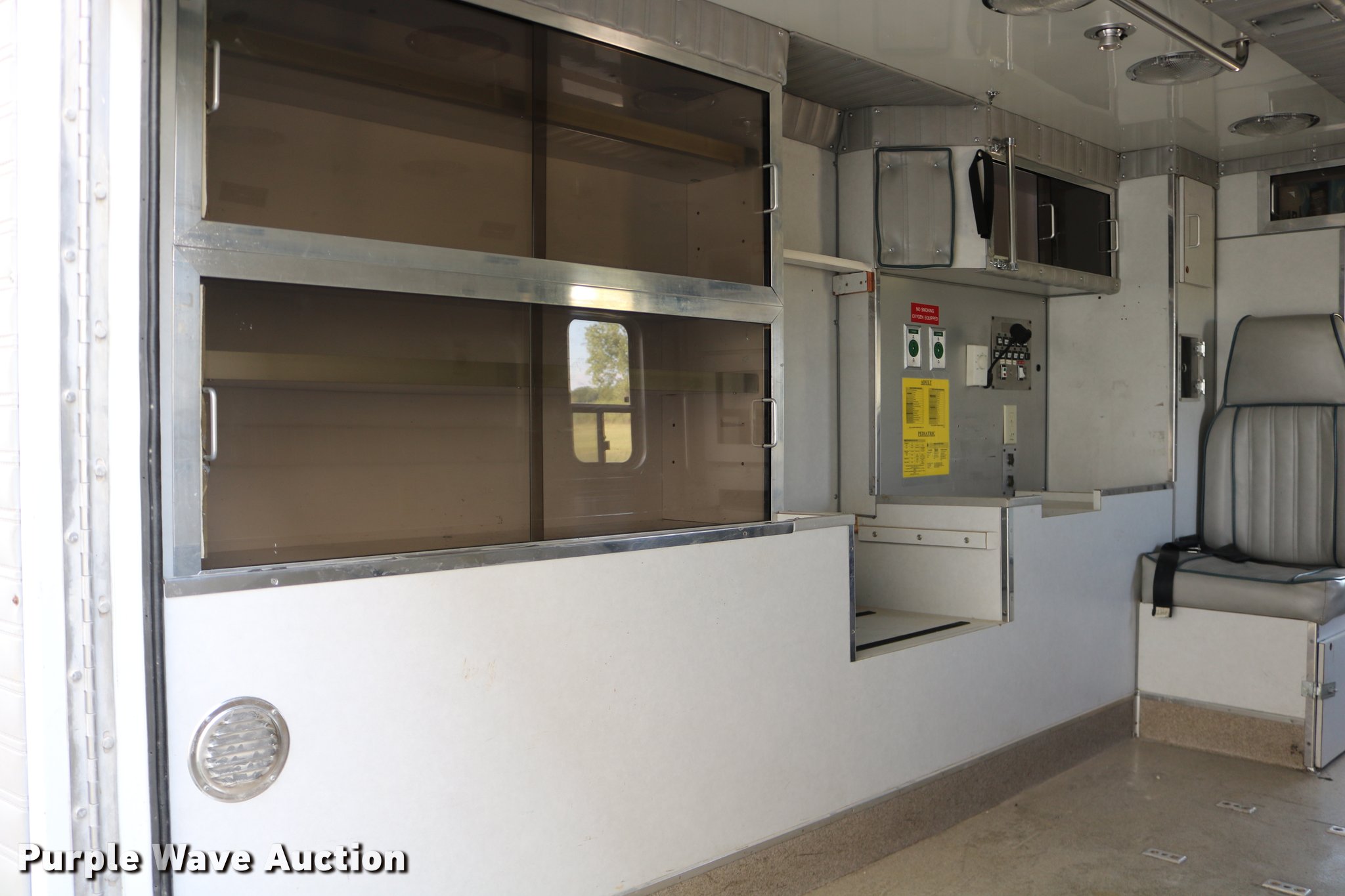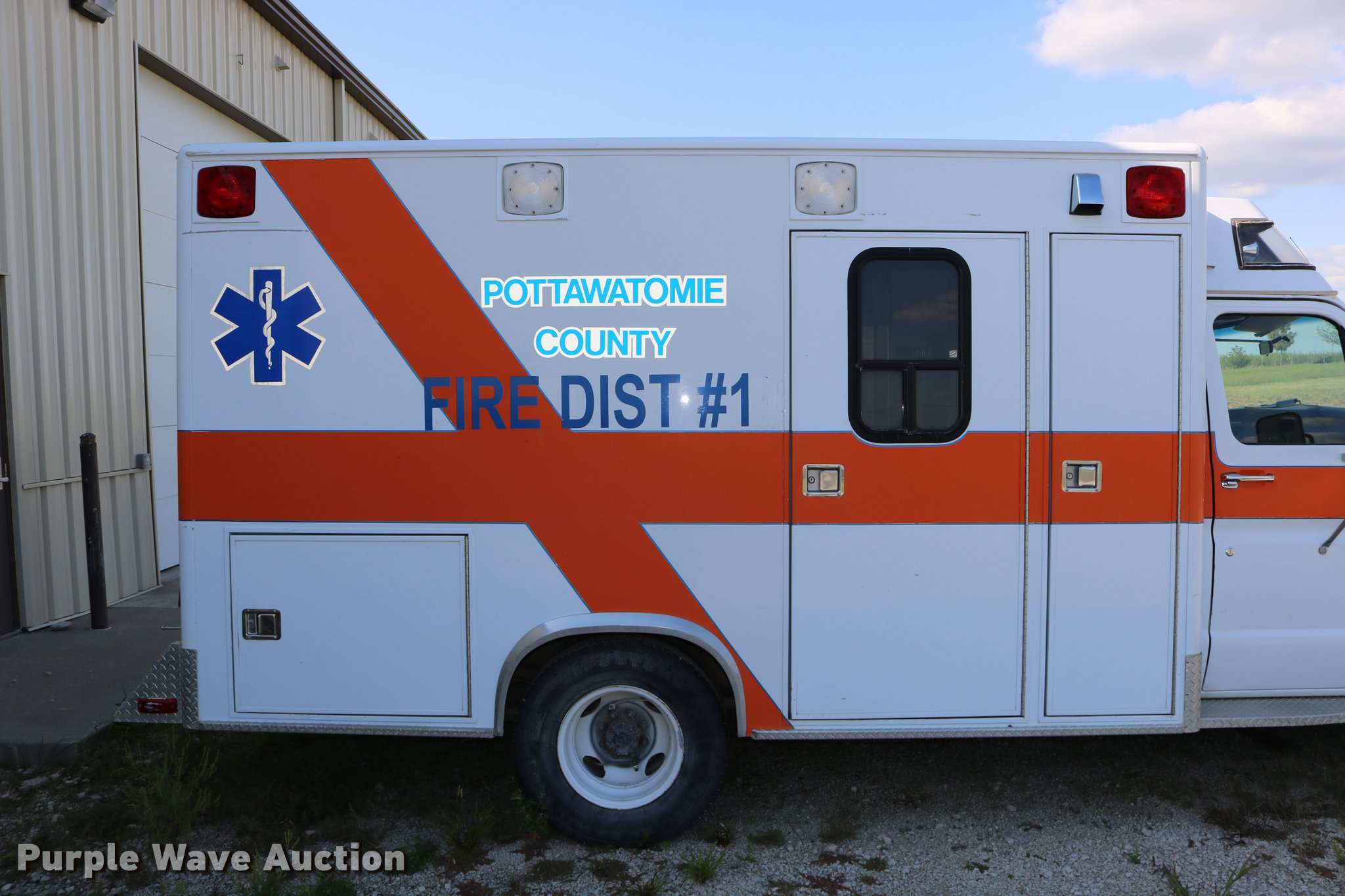 Purple Wave is selling a used Fire Truck or Emergency Vehicle in Kansas. This item is a 1988 Ford Econoline E350 ambulance with the following: 15,999 miles on odometer, 7.3L V8 OHV 16V diesel engine, Automatic transmission, Single axle, AC and heat, AM/FM, Emergency lights and sirens, Block heater, Collins ambulance body, (3) oxygen hookups, 138" wheelbase, 215/85R16 tires, GVWR 10,500 lbs, Bad valve on driver rear duals, Weak battery, Will not start, Unknown operating condition