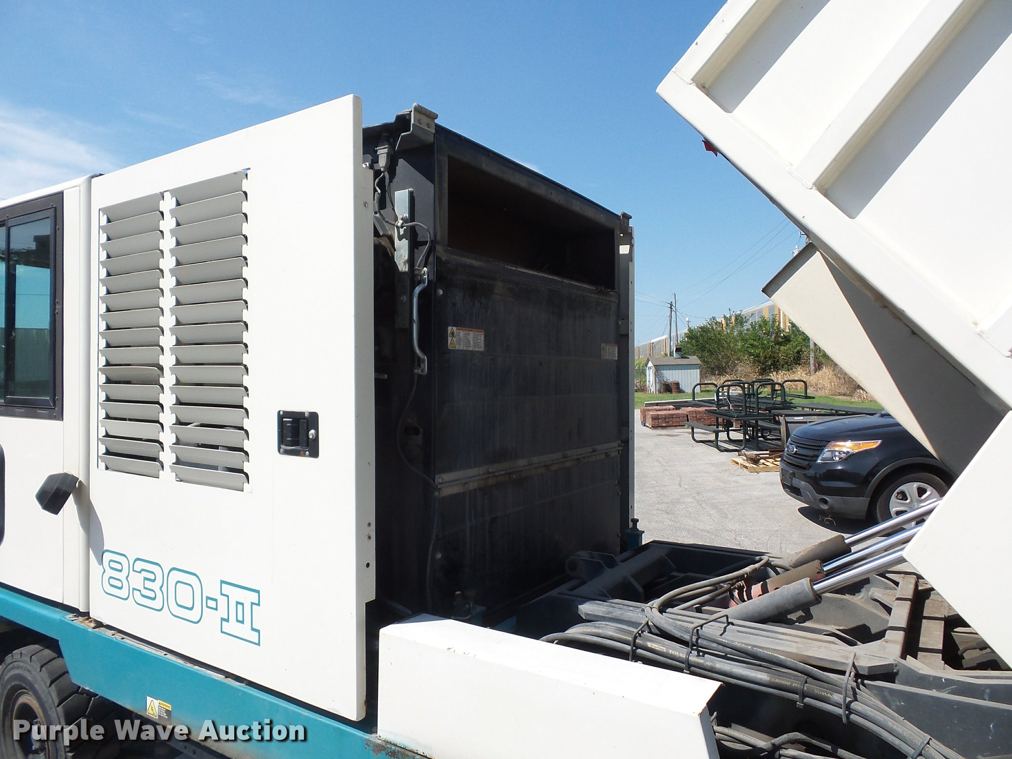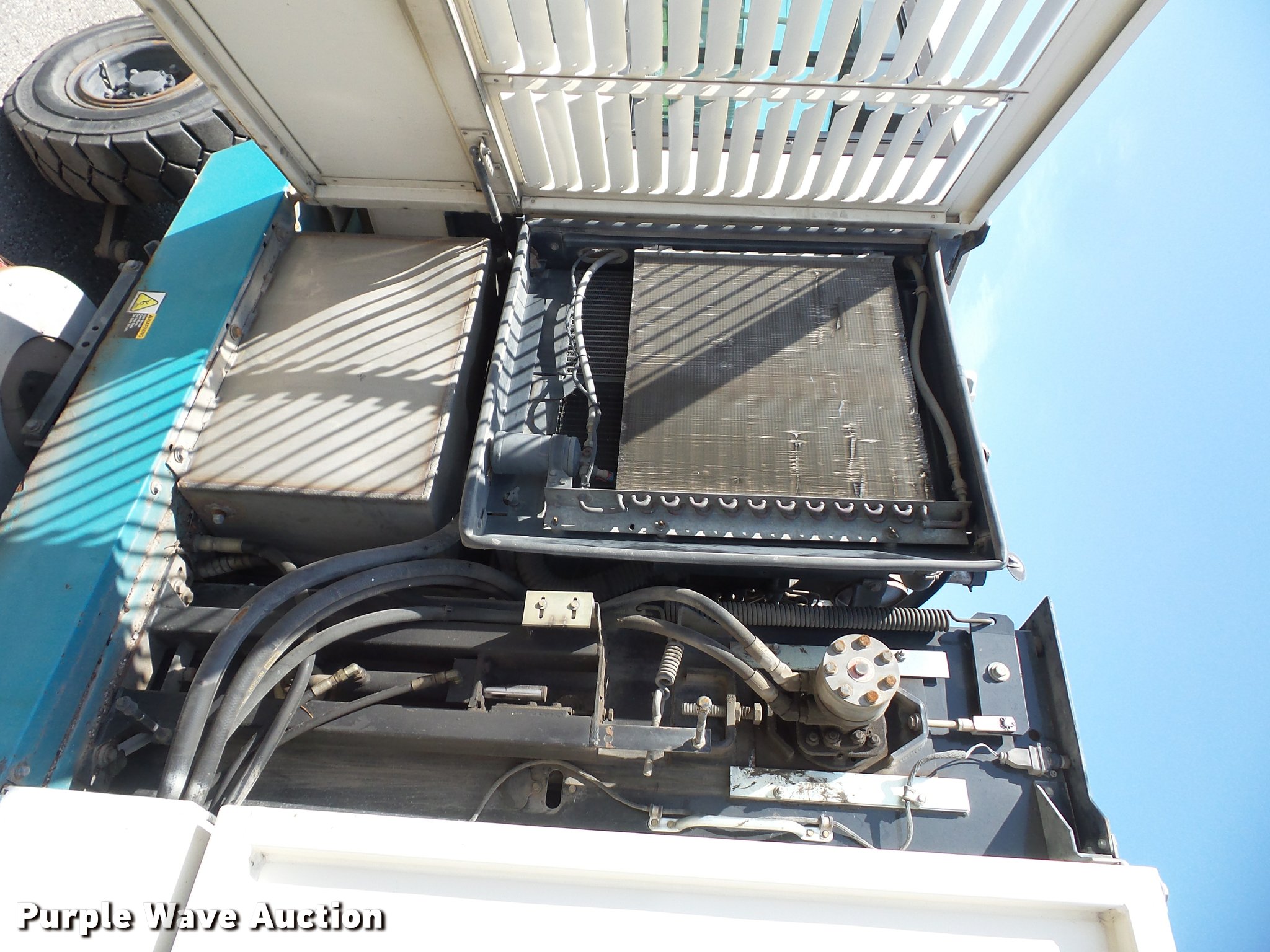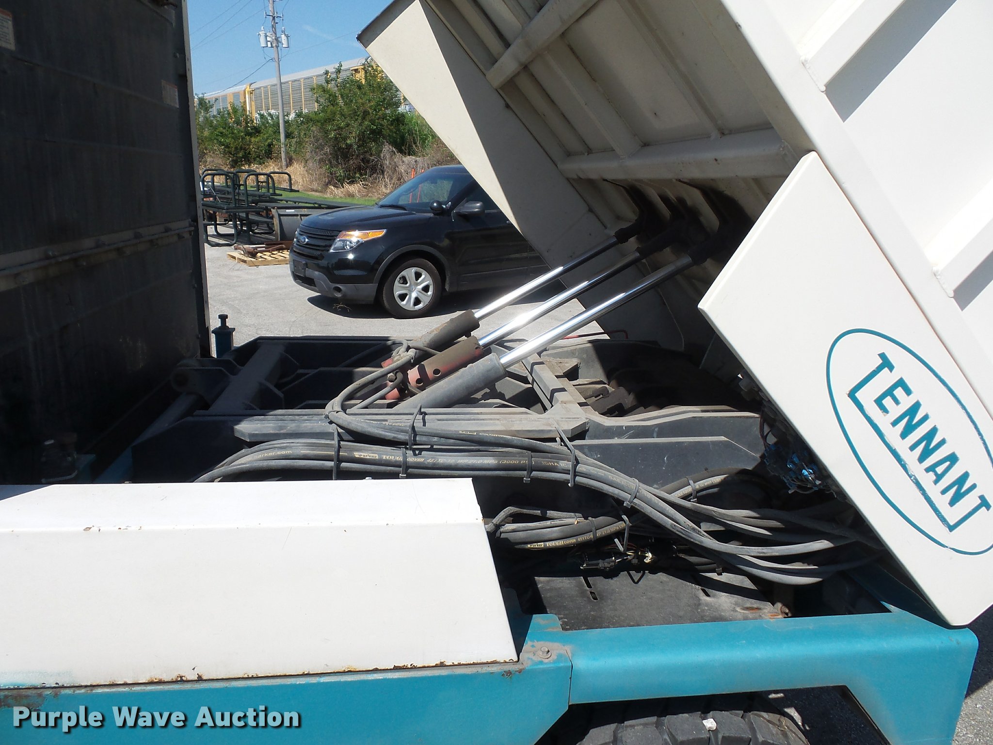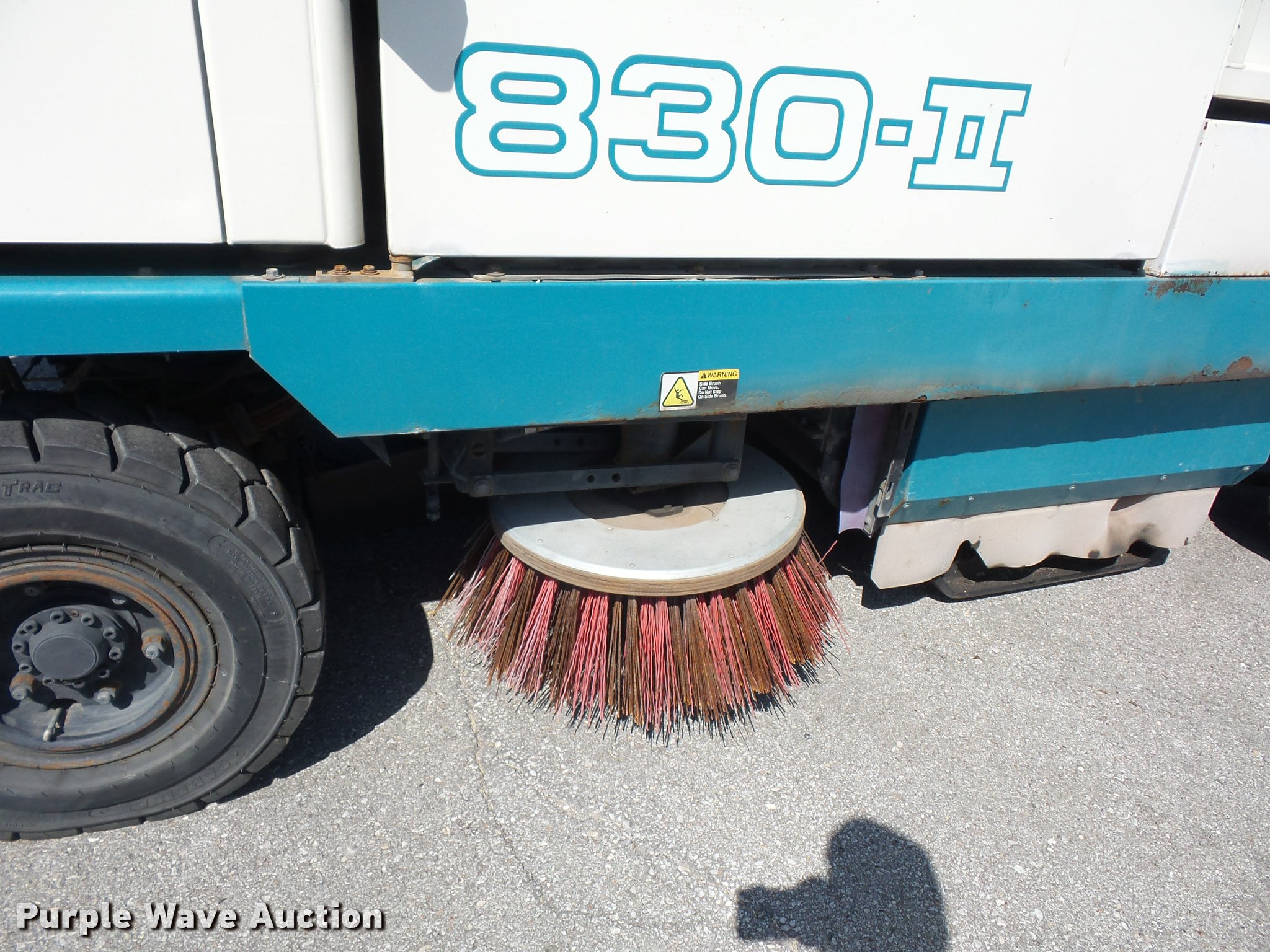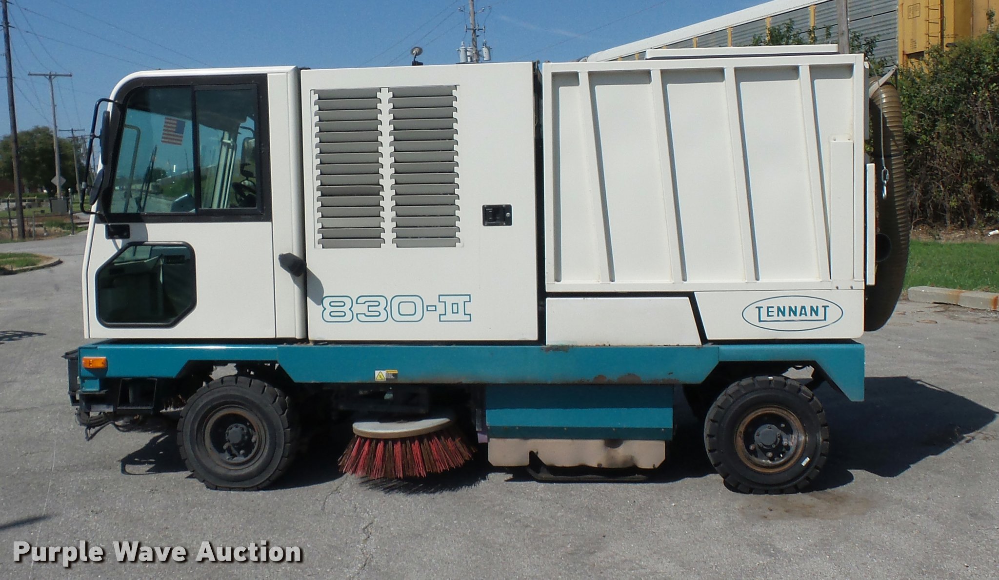 Tennant 830 Series II street sweeper. 24,704 miles on odometer, 5,029 hours on meter, Diesel engine, Hydrostatic transmission, AC and heat, AM/FM, Hydraulic dump, 7-12 tires, GVW 20,000 lbs, Serial 830II-4618. City of North Kansas City. 2010 Howell St. North Kansas City, MO 64116