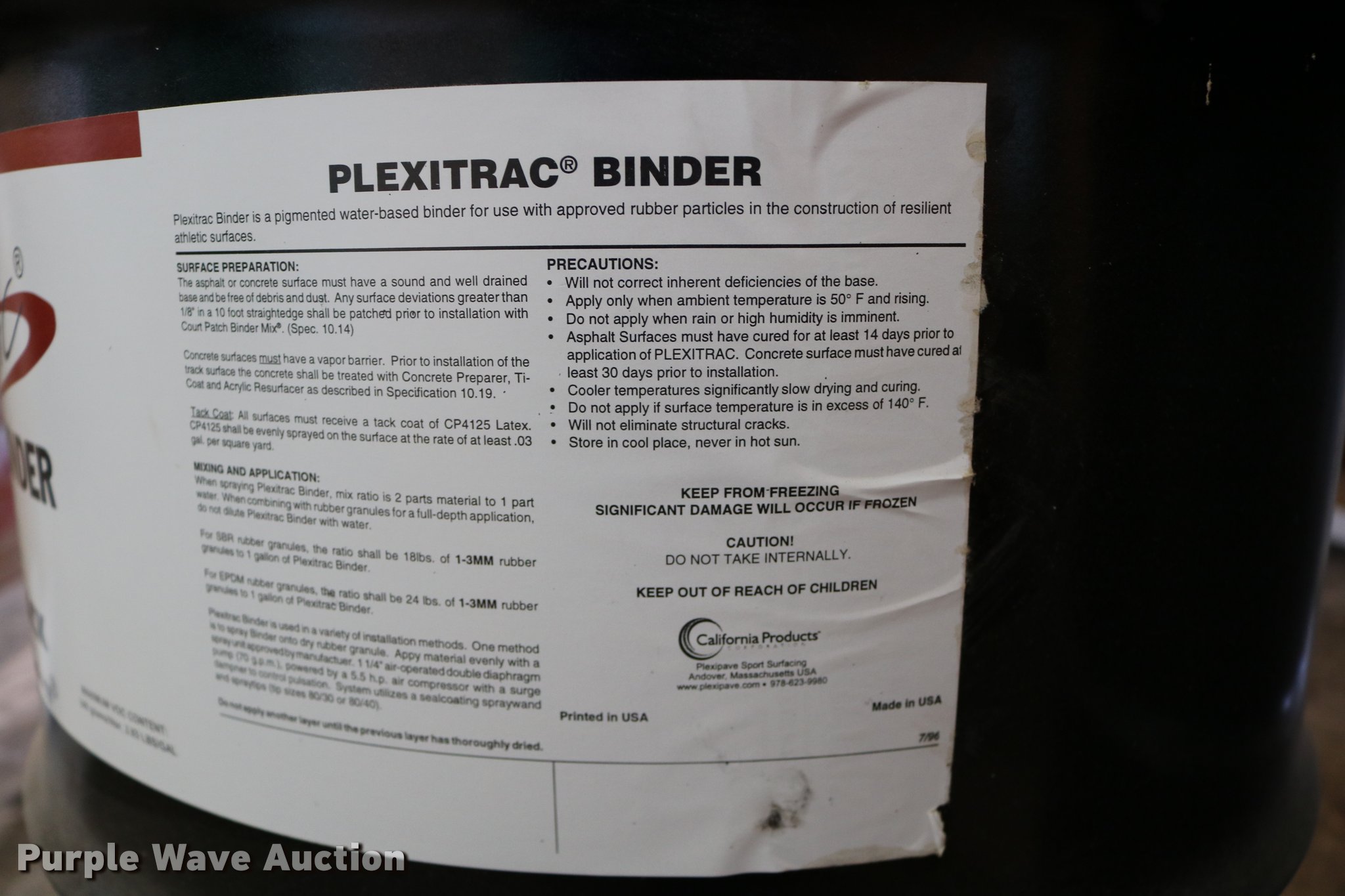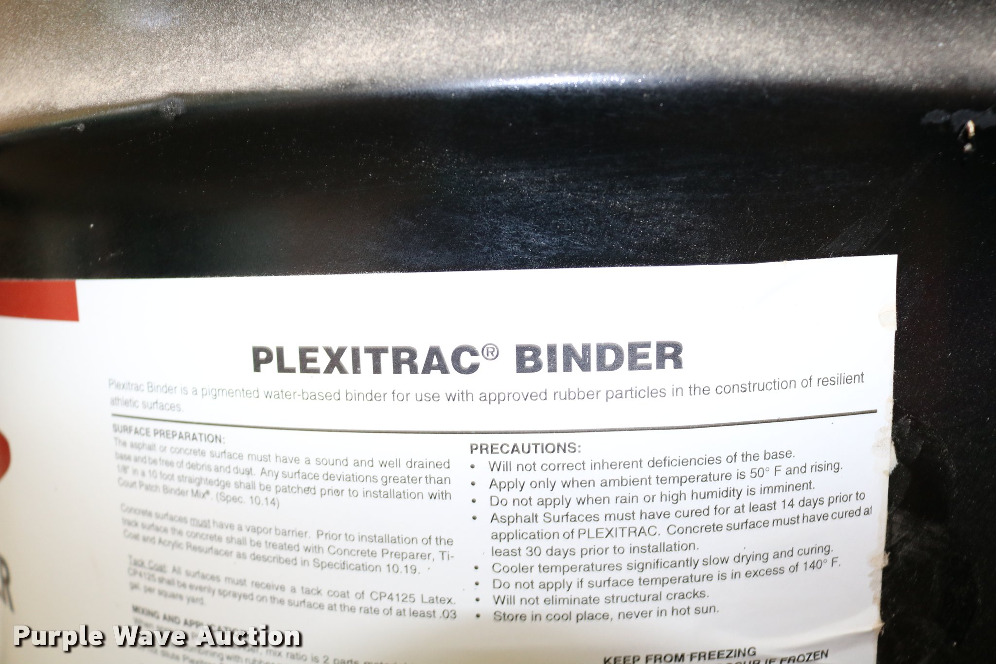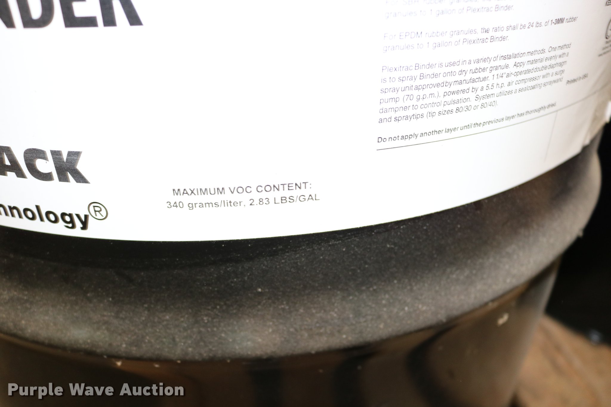 Purple Wave is selling a used Tools in Kansas. This item is a (2) barrels of Plexitrac binders with the following: 55 gallon capacities, 8417 black, Batch no. 09243001-17, Has never been frozen, Unused