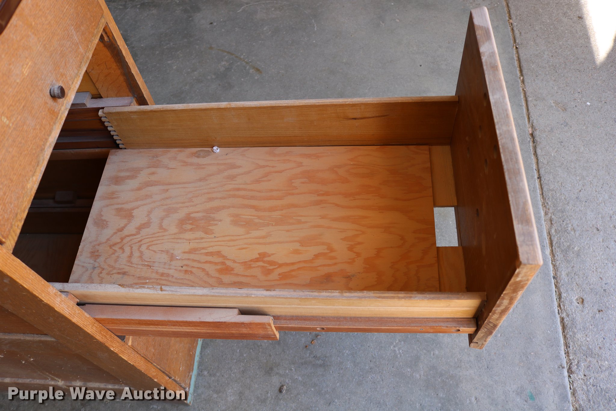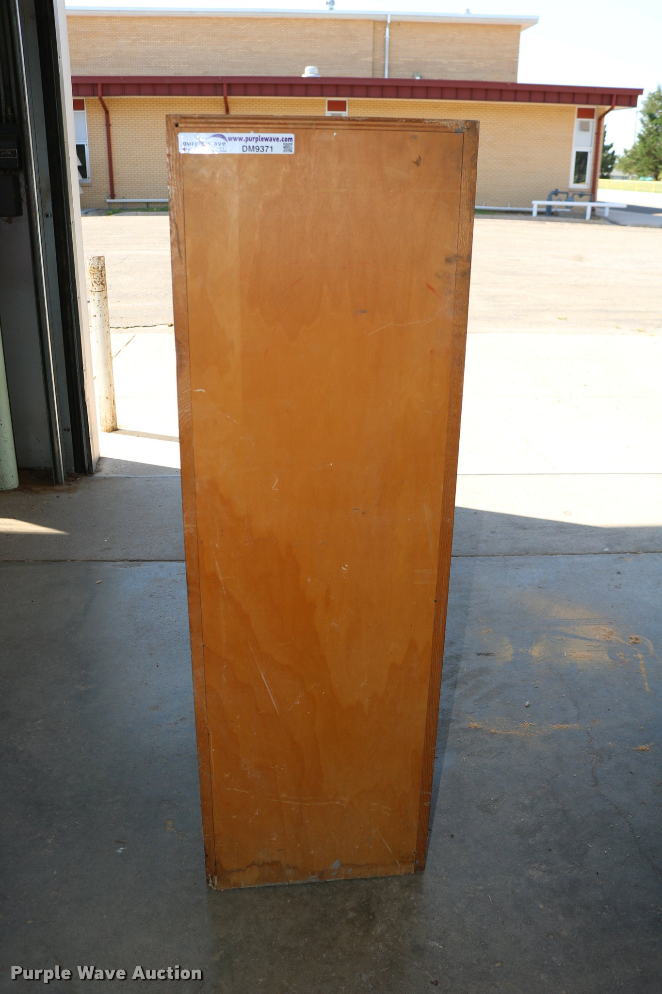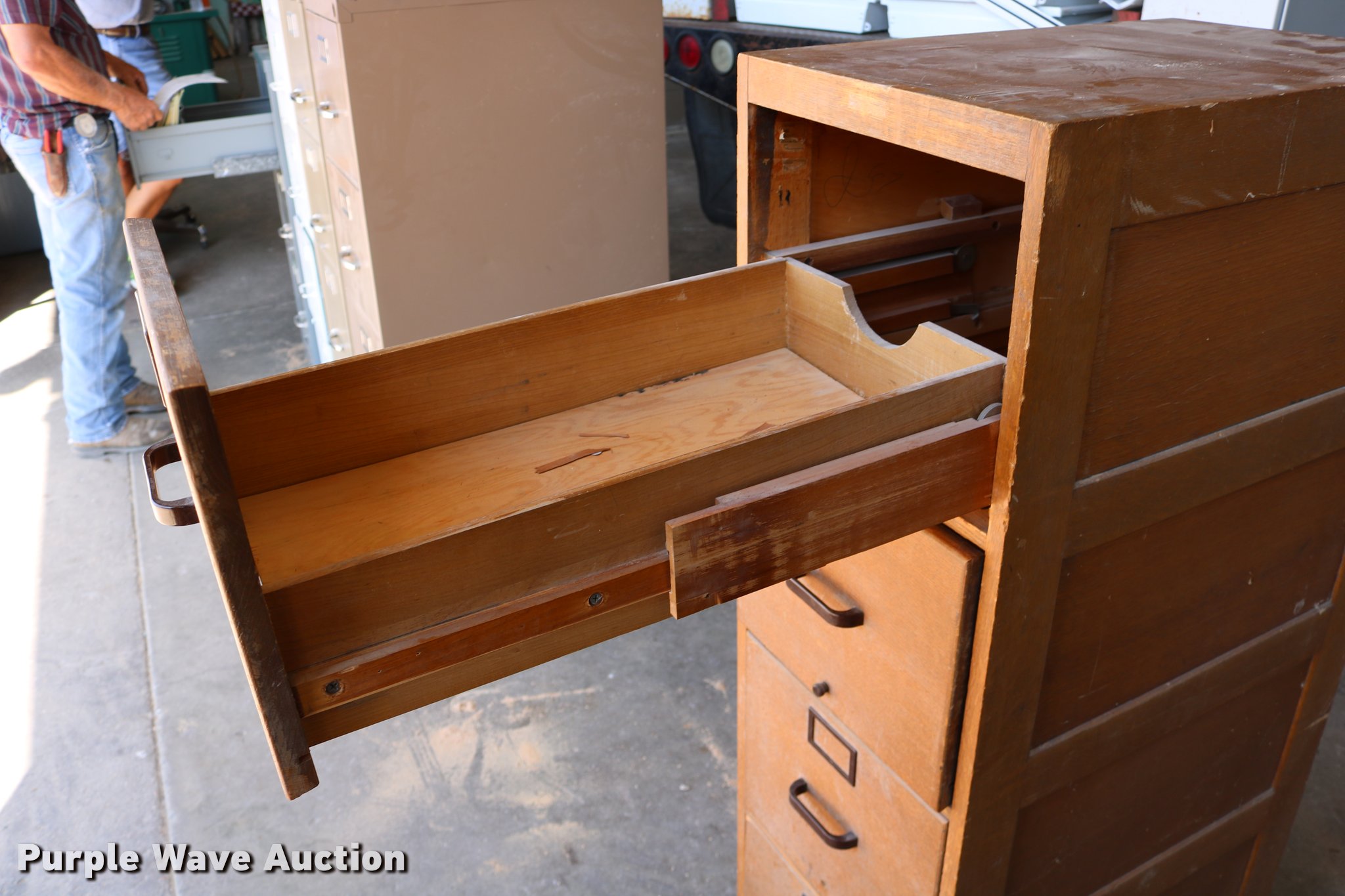 Purple Wave is selling a used Office Supplies and Equip. in Kansas. This item is a Glode Wernicke four drawer wood filing cabinet with the following: 16"W x 25"D x 52.5"H