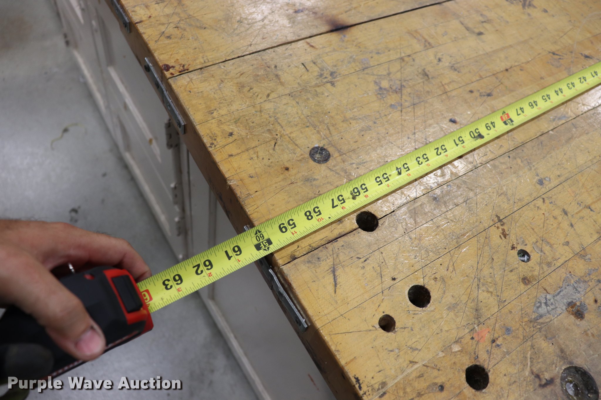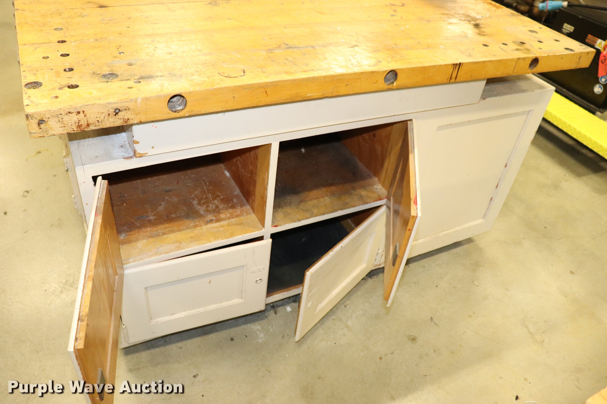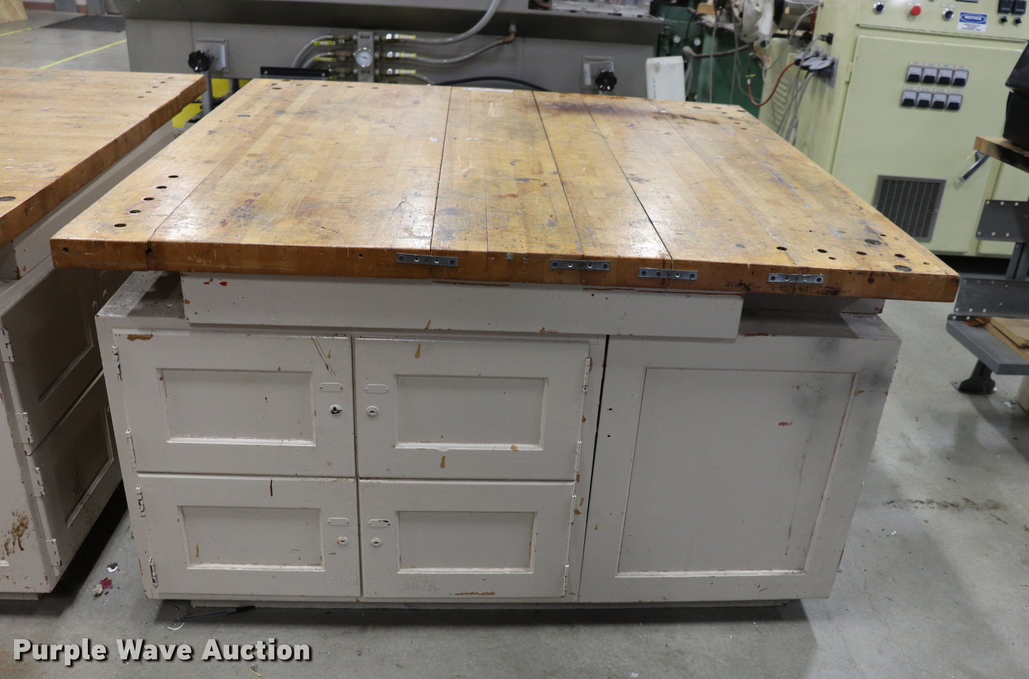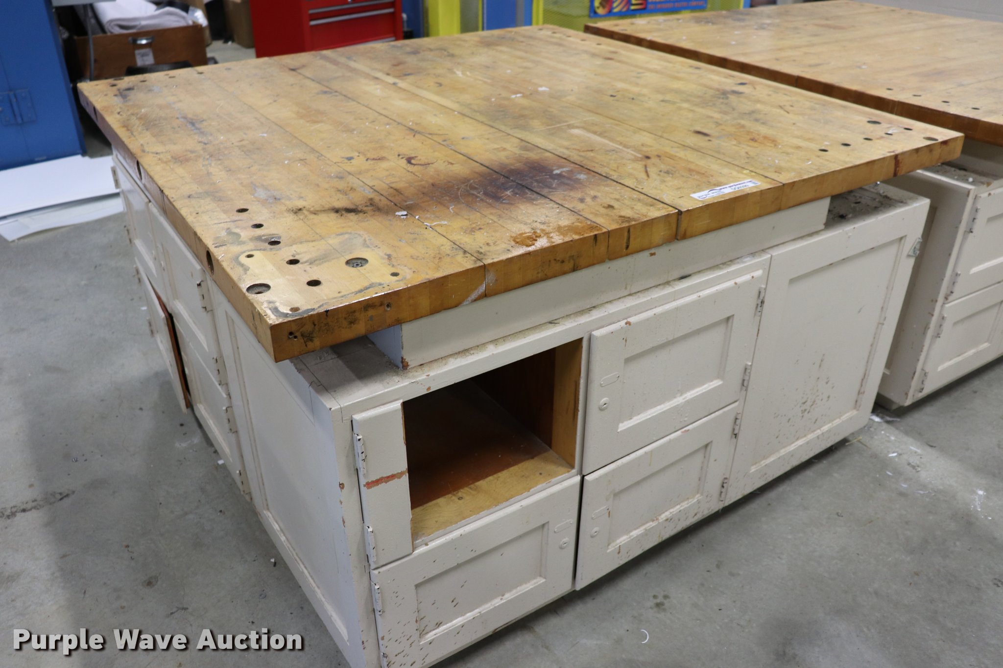 Purple Wave is selling a used Furniture in Kansas. This item is a Wood work table with the following: 60" x 60" x 2" thick, 34"H, (16) storage bins with doors, Unit is bolted together