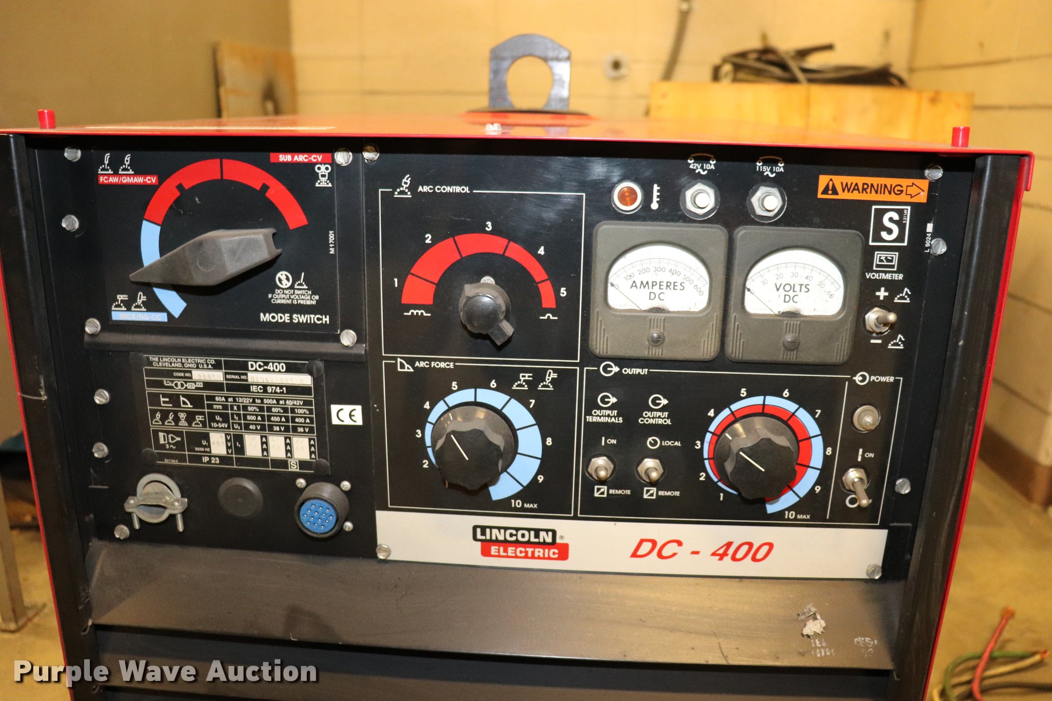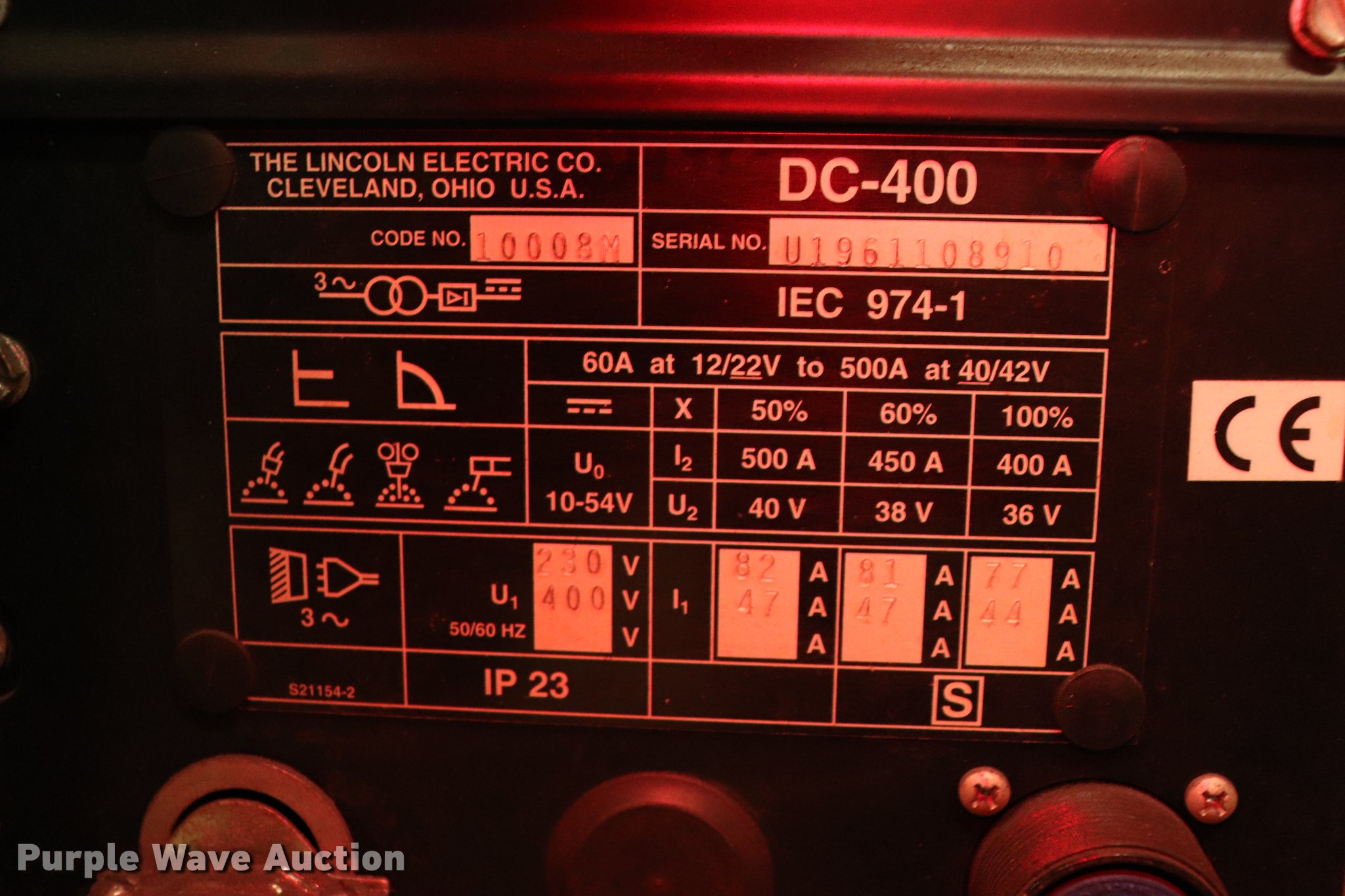 Purple Wave is selling a used Welder (Manual) in Kansas. This item is a Lincoln DC-400 welder with the following: 33"L x 22"W x 27"H, Multi-process source, Mig, tig, and stick capable, 500 amp max, Power lead, Three phase, Top lift point, Serial U1961108910