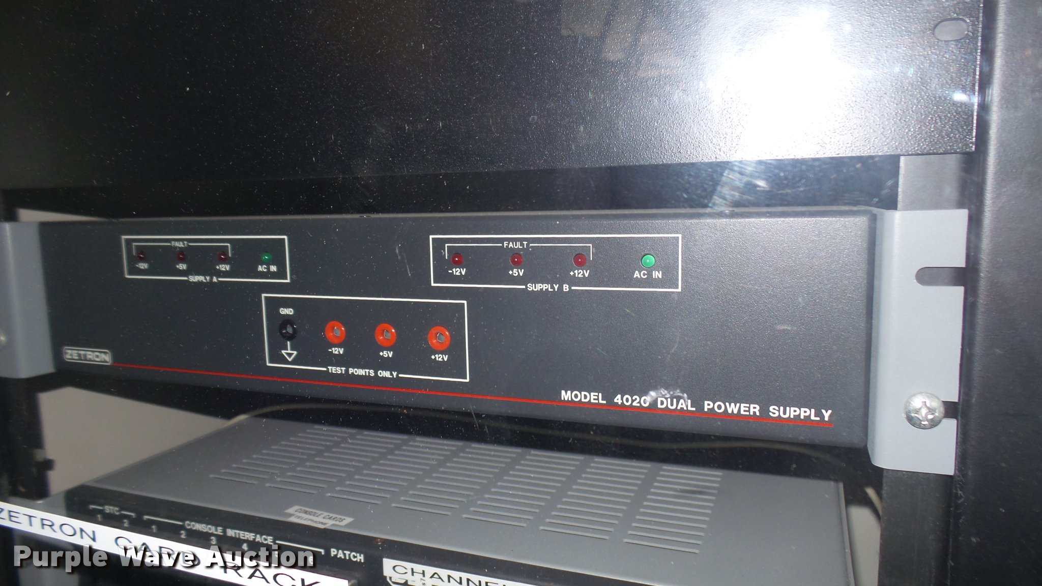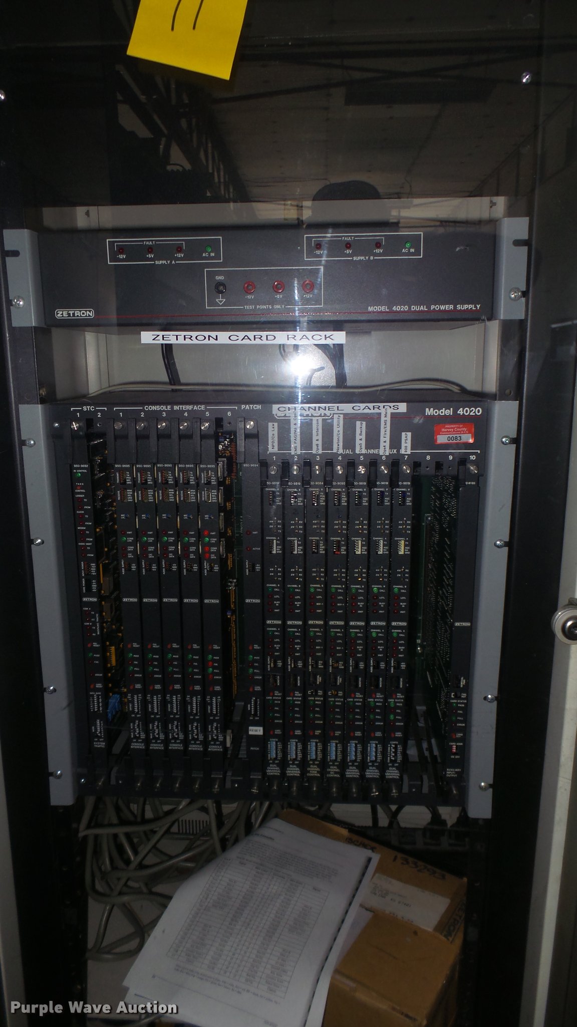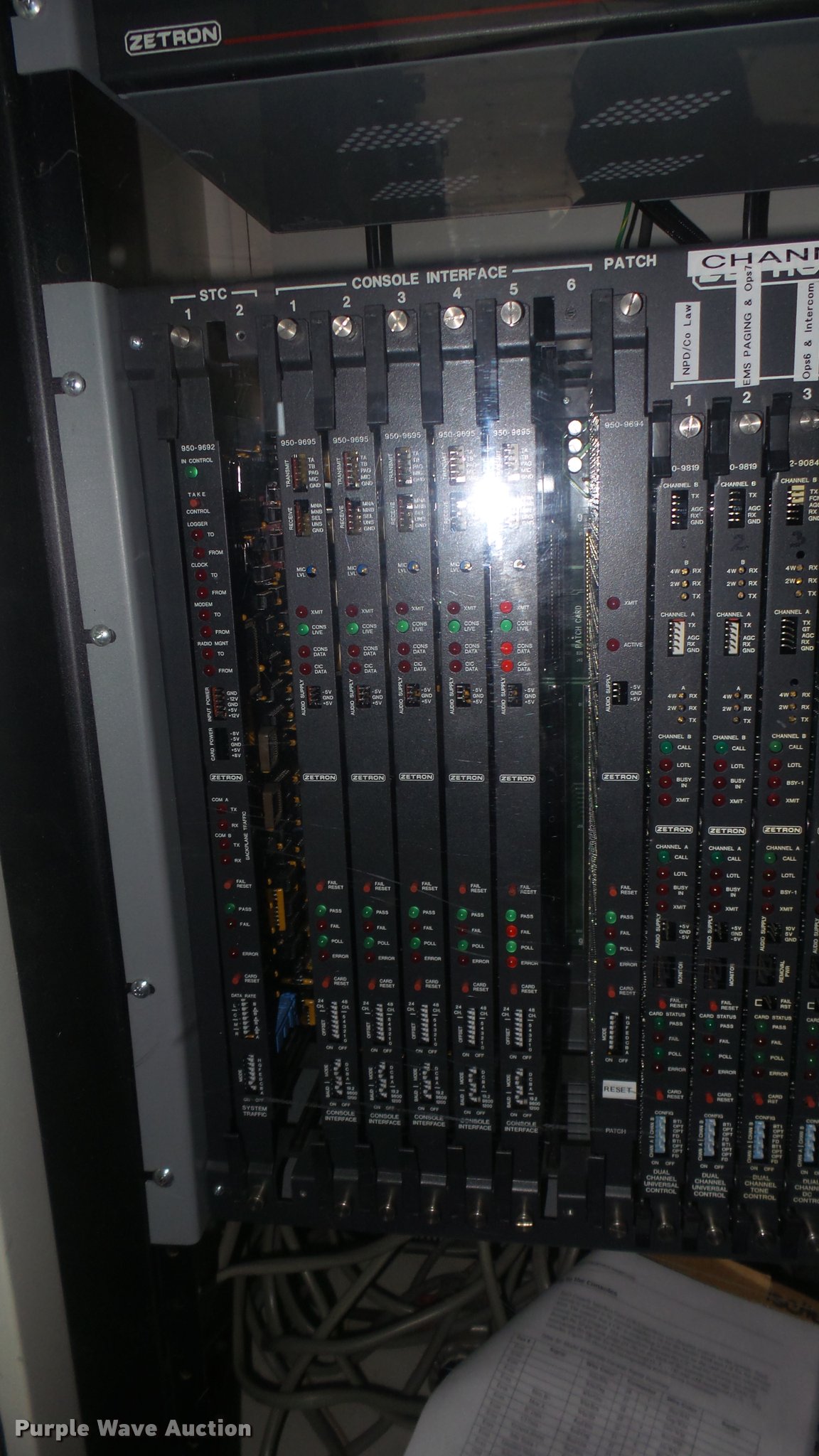 Purple Wave is selling a used Electronics in Kansas. This item is a Communication equipment with the following: 1997 Zetron Model 4020 Console CEB, (5) console cards, (5) 9819 universal cards, Tone card, DC card, (5) console audio panels, Empty cabinet