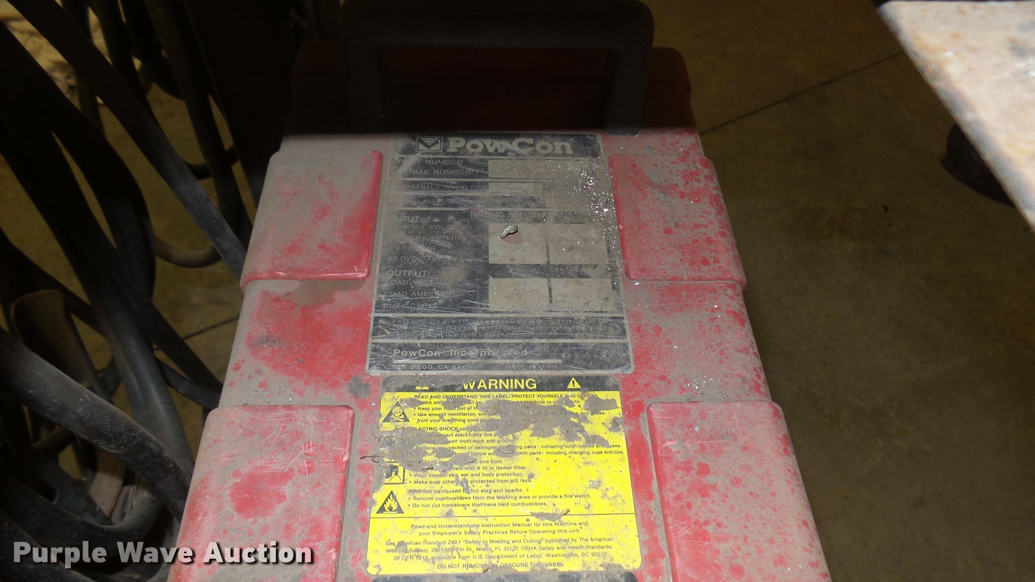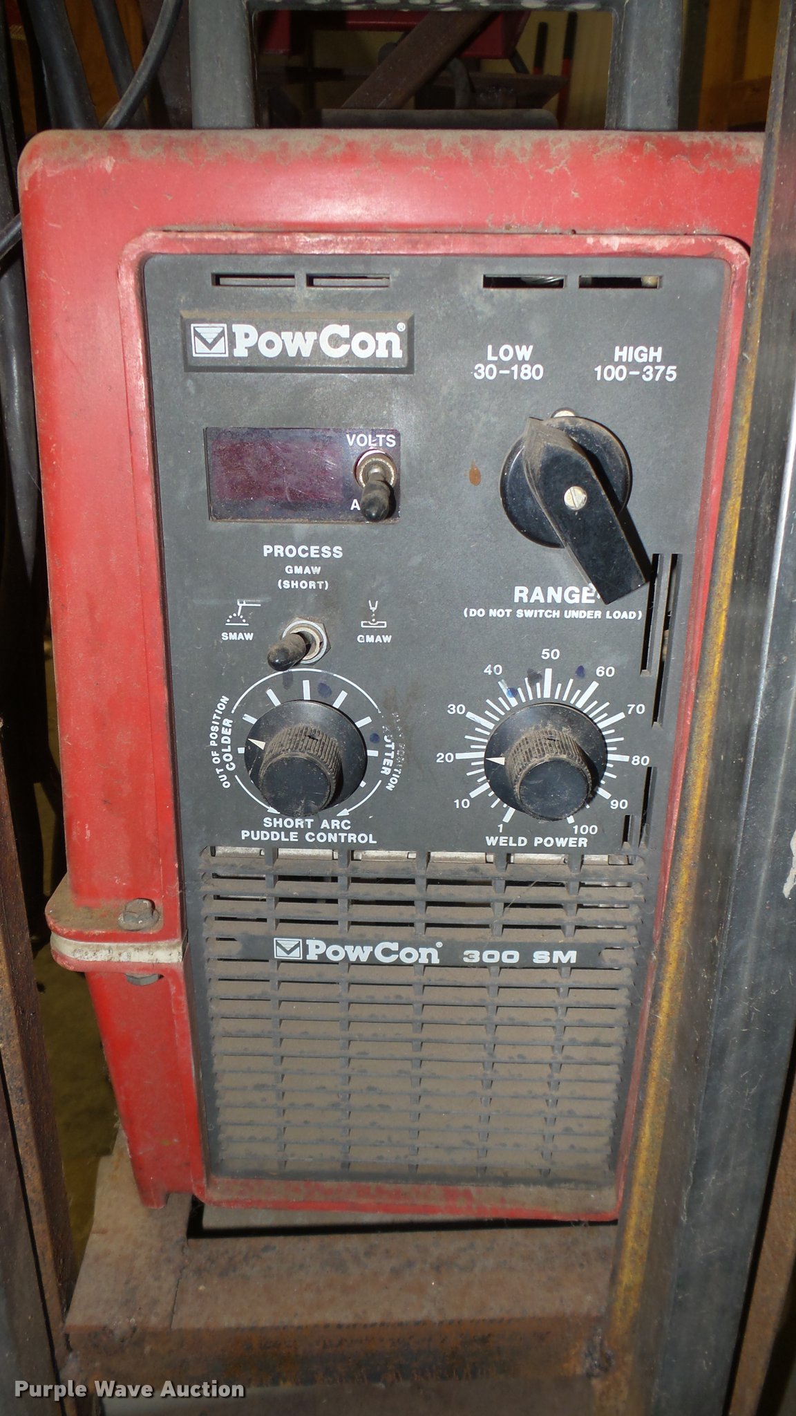 Purple Wave is selling a used Welder (Manual) in Kansas. This item is a PowCon 300SM welder with the following: Wire, Leads, Cart, 30-180 low, 100-375 high