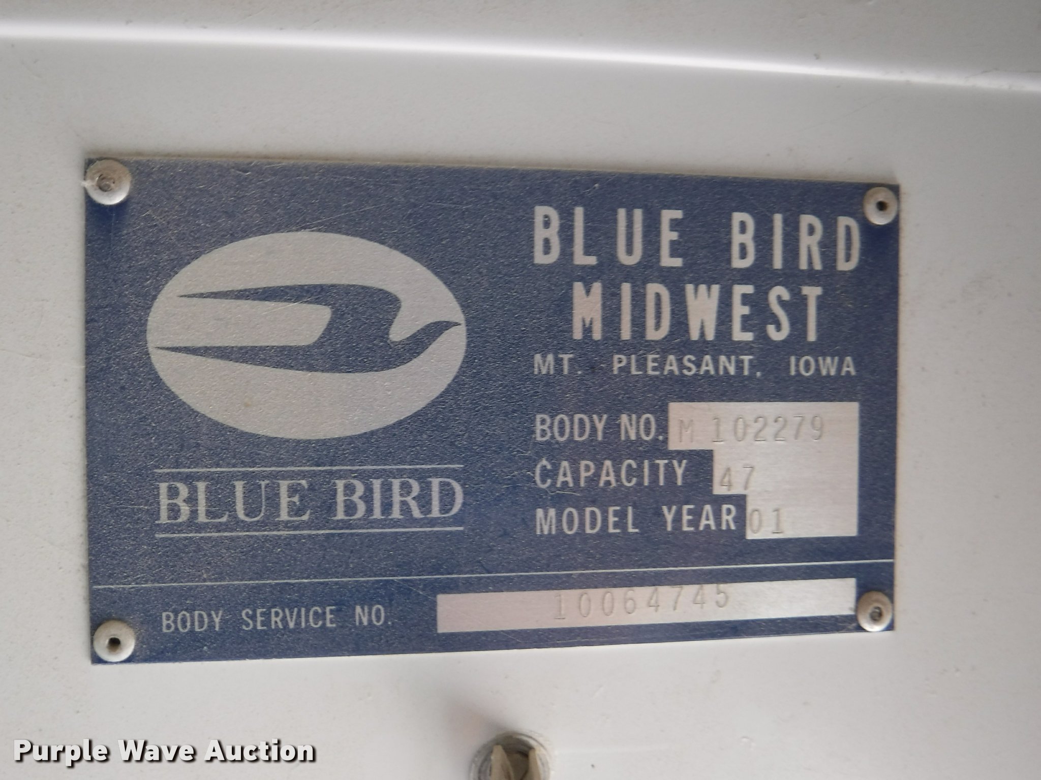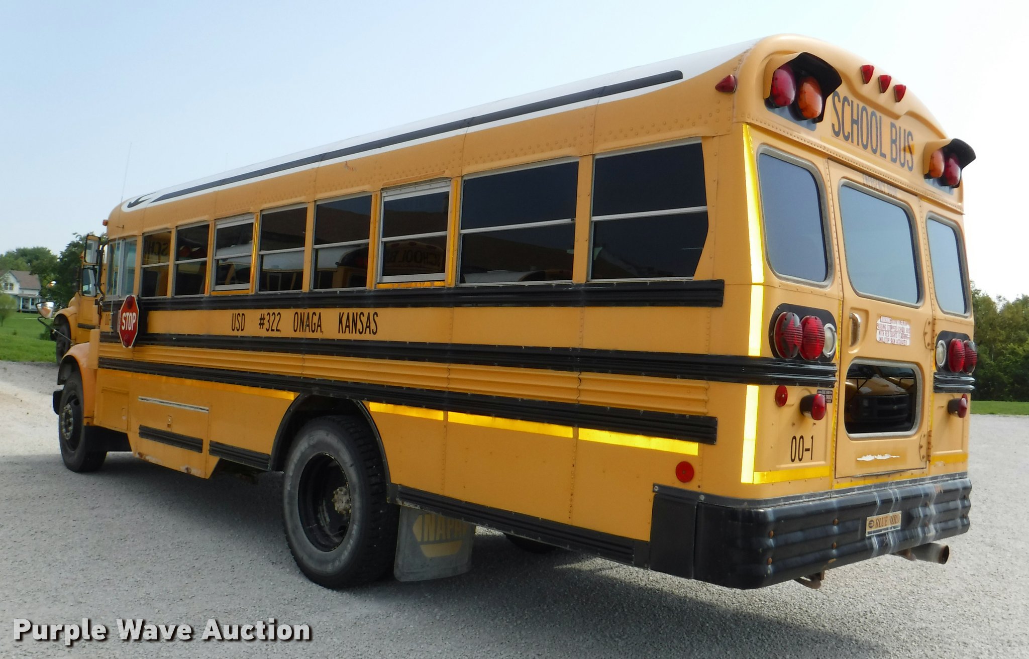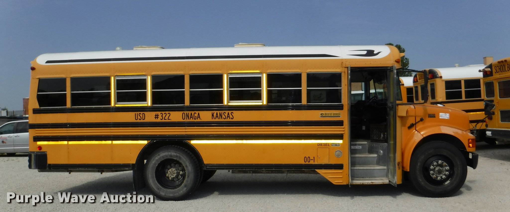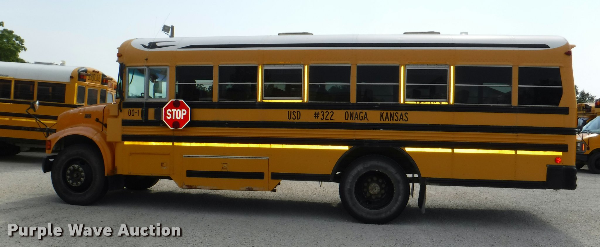 Purple Wave is selling a used Bus in Kansas. This item is a 2001 International 3800 Blue Bird school bus with the following: 174,271 miles on odometer, 5,867 hours on meter, International DT466E 7.6L L6 turbo diesel engine, Automatic transmission, Single axle, Heat, Cruise, AM/FM/cassette, Vinyl interior, 47 passenger capacity, Ceiling, rear, and side emergency exits, Lighted stop sign, Backup alarm, Block heater, Underside luggage storage, Rear tow hooks, Spring suspension, Hydraulic brakes, 194" wheelbase, 11R22.5 tires, GVWR 25,500 lbs, Decals will be painted over, Unit# 00-1