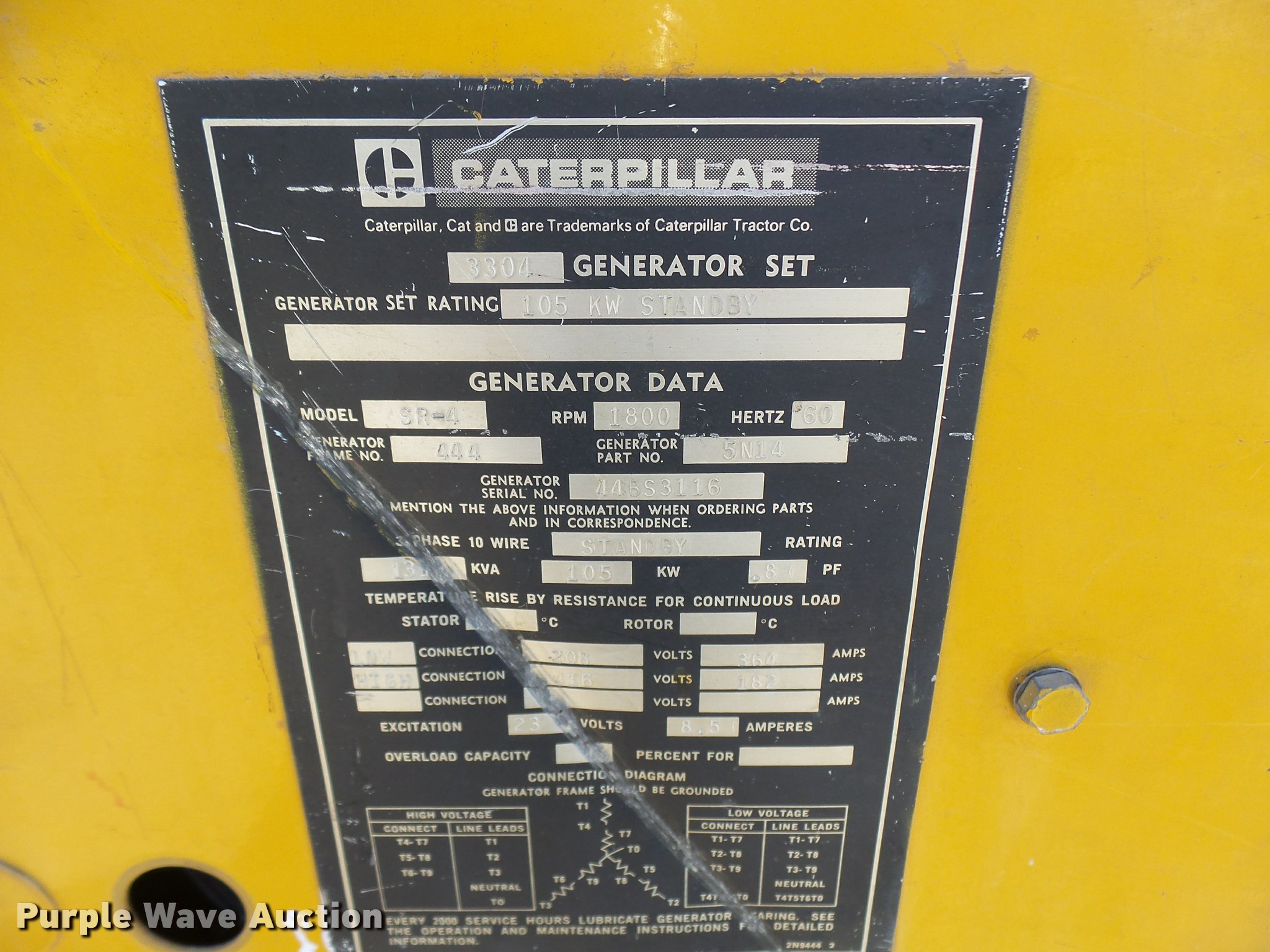 Purple Wave is selling a used Generator Set in Missouri. This item is a Caterpillar generator with the following: Model 105KWSR4, Caterpillar 3304PC four cylinder turbo diesel engine, Serial 4B15422, 105 kW, Radiator, Control panel, Electric start, Fuel tank, Single/three phase, Approx. 100 gallon fuel tank, Skid mounted, Stored inside, Serial 44B53116
