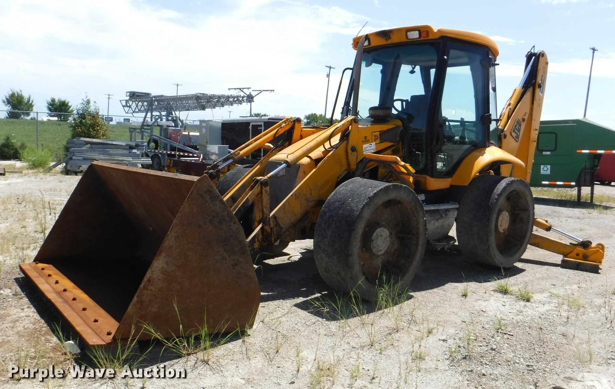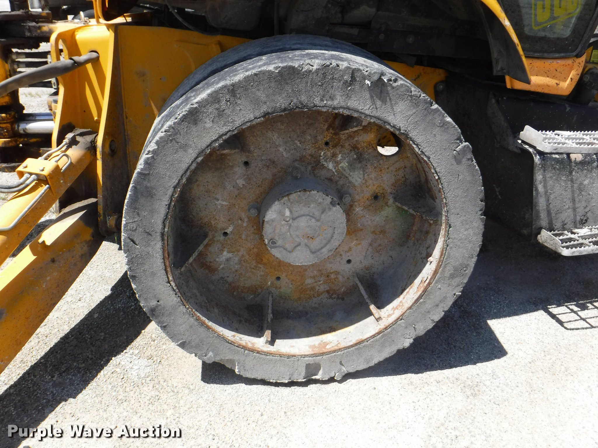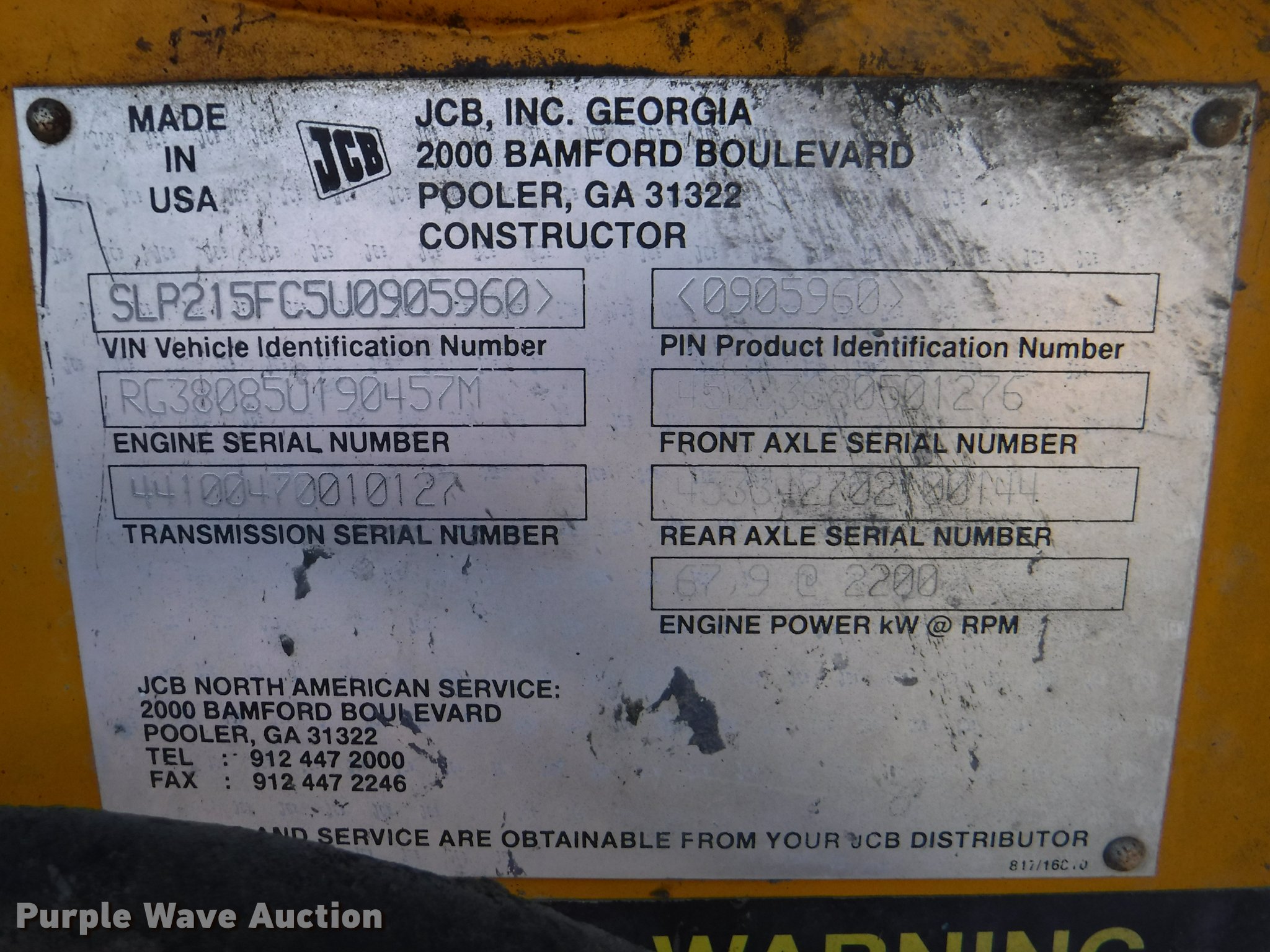 Purple Wave is selling a used Tractor Loader Backhoe in Kansas. This item is a JCB 215S backhoe with the following: Diesel engine, 67.9 kW, Serial RG38085U190457M, Hydraulic speed control, Four wheel drive, EROPS, AC and heat, AM/FM/cassette, Suspension seat, Wobble stick backhoe controls, Front and rear work lights, Front and rear wipers, Loader bucket, 95" x 4' x 42", Bolt-on cutting edge, E-stick, 15.5' retracted length, 19' extended length, Rear stabilizer pads, 18"W solid tires, AC needs charged, Serial 0905960