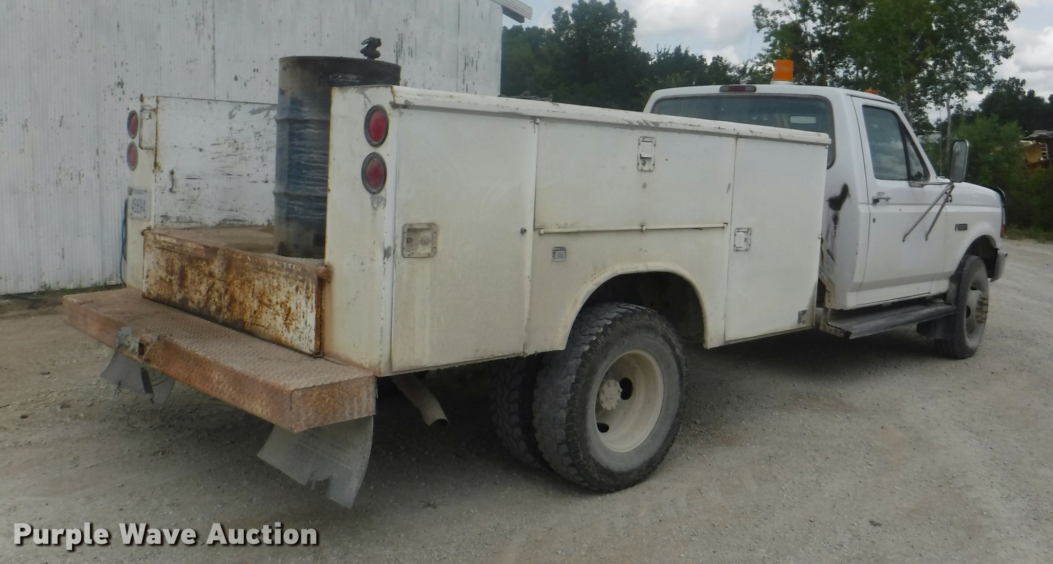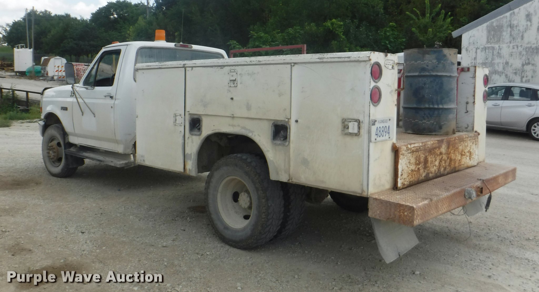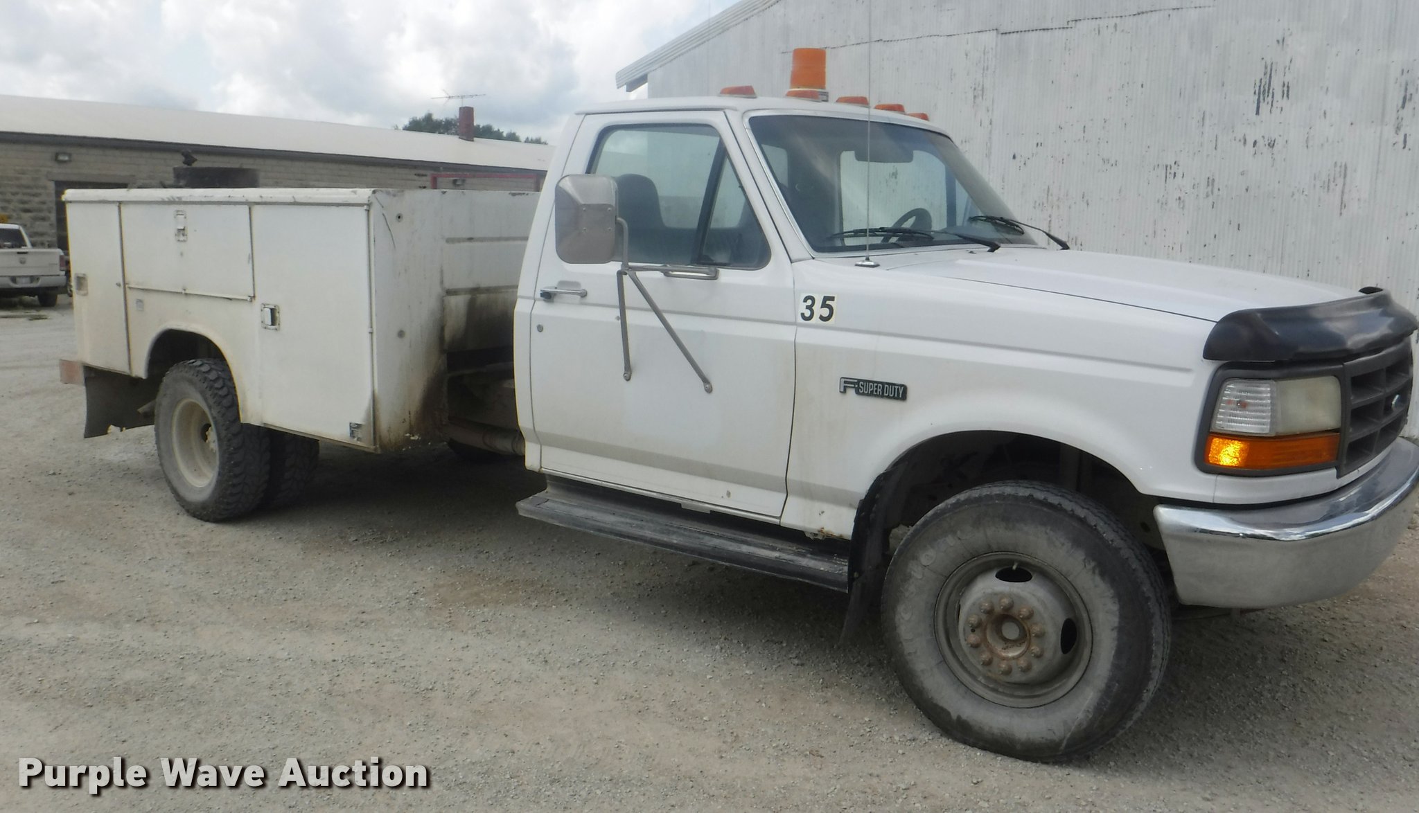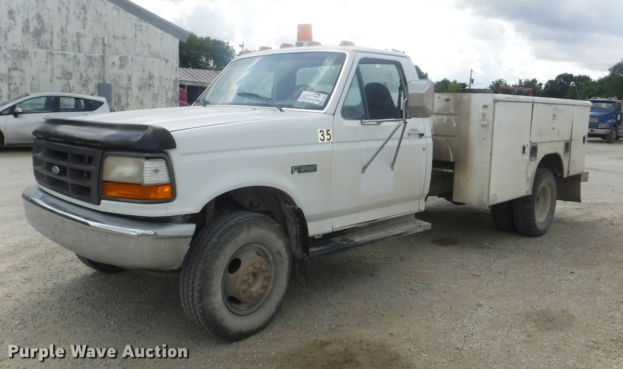 Purple Wave is selling a used Service Truck in Kansas. This item is a 1997 Ford F450 Super Duty XL utility truck with the following: 159,869 miles on odometer, 7.5L V8 gas engine, Five speed manual transmission, AC and heat, AM/FM, Manual windows and locks, Vinyl interior, Running boards, Strobe light, Reading 1086DADW utility bed, (6) compartments, Seven pin outlet, Welder ground, Dual fuel tanks, Receiver hitch, Trailer wiring, 235/85R16 tires, Barrel not included, Unit# 35