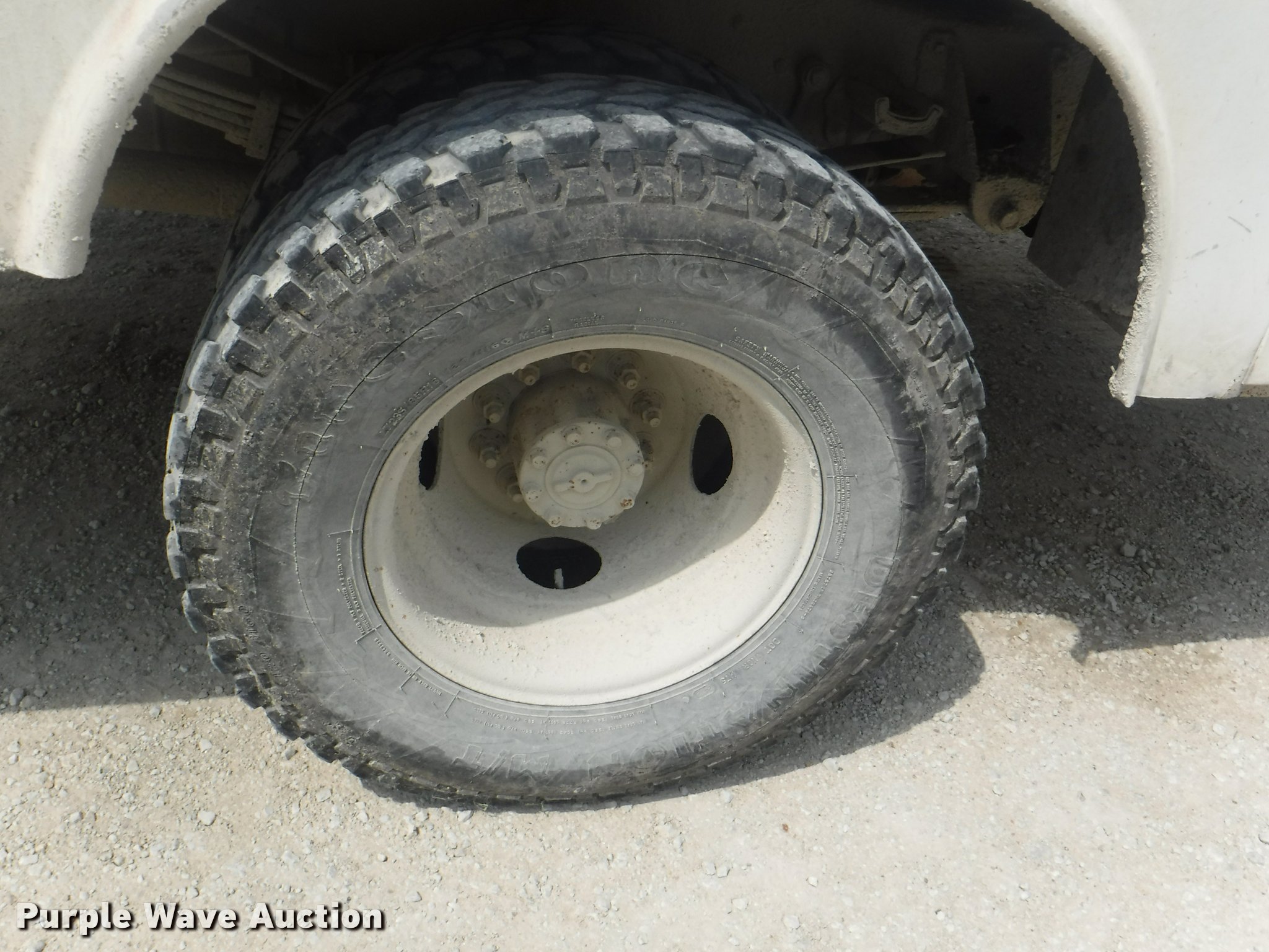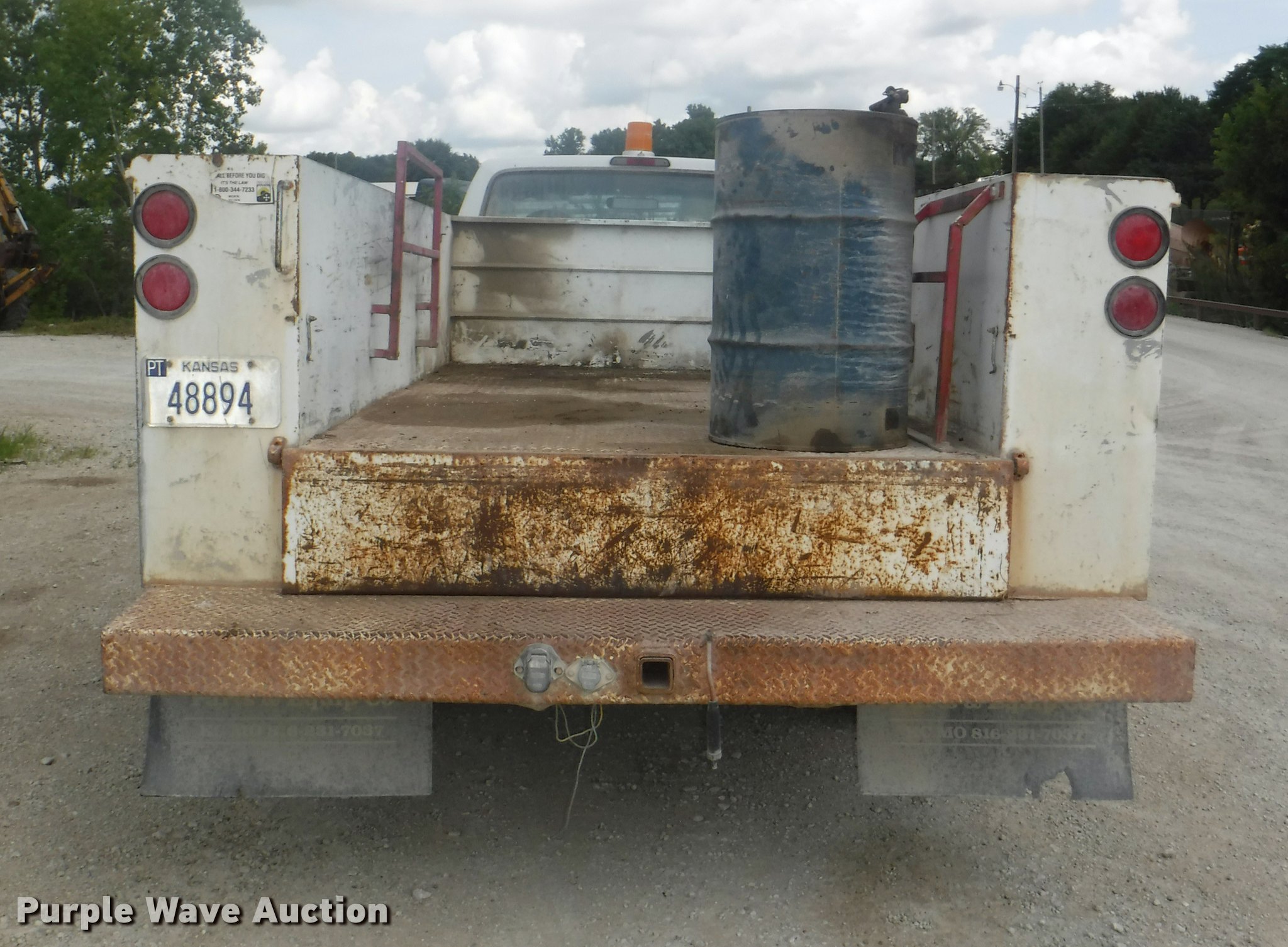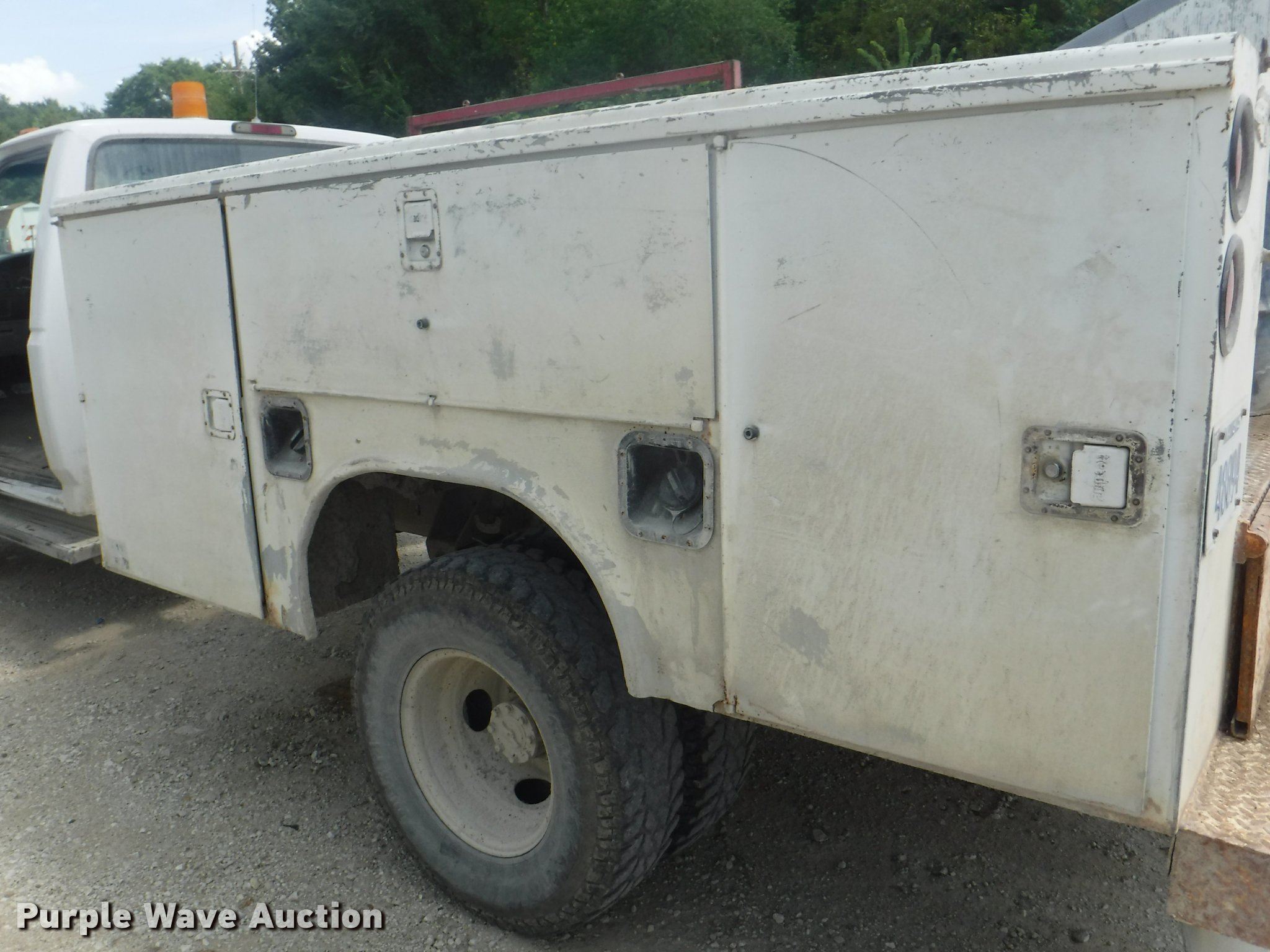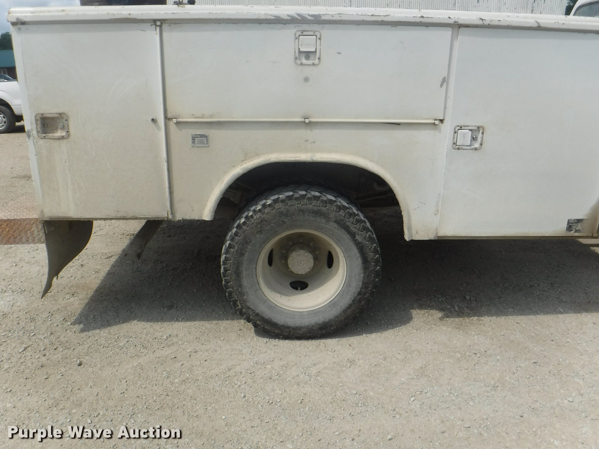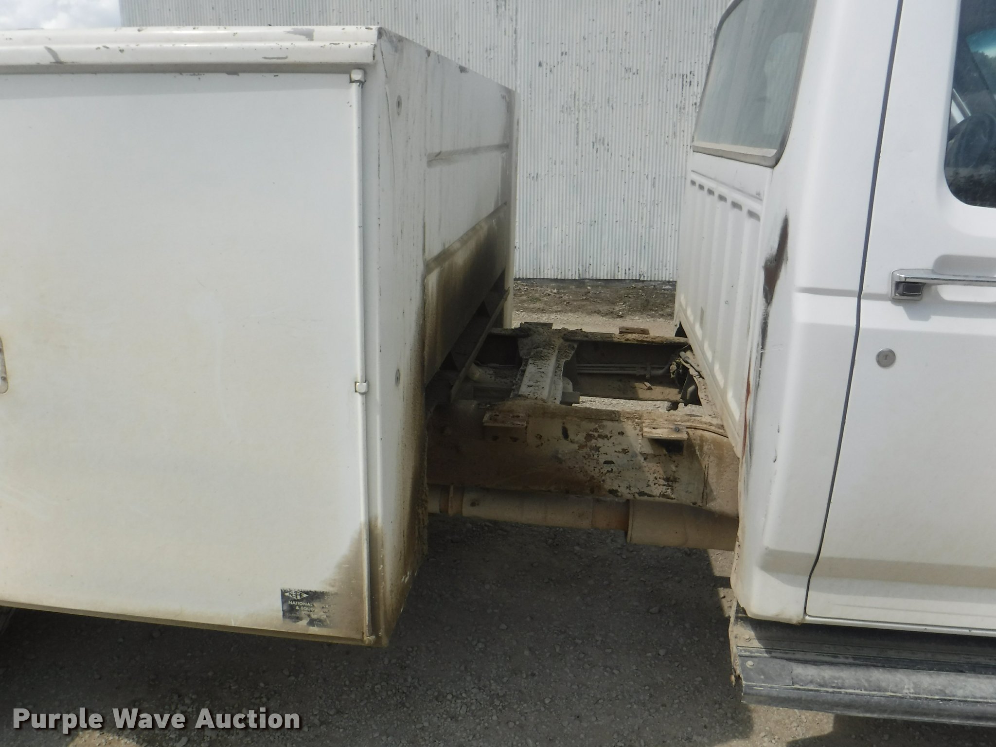 Purple Wave is selling a used Service Truck in Kansas. This item is a 1997 Ford F450 Super Duty XL utility truck with the following: 159,869 miles on odometer, 7.5L V8 gas engine, Five speed manual transmission, AC and heat, AM/FM, Manual windows and locks, Vinyl interior, Running boards, Strobe light, Reading 1086DADW utility bed, (6) compartments, Seven pin outlet, Welder ground, Dual fuel tanks, Receiver hitch, Trailer wiring, 235/85R16 tires, Barrel not included, Unit# 35