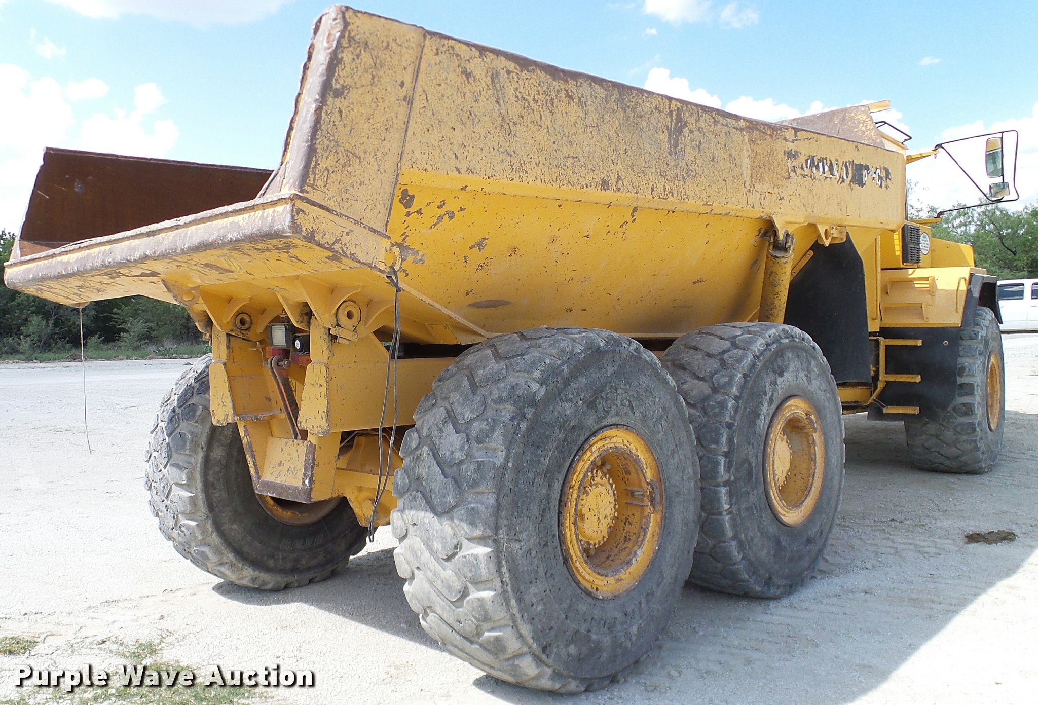 Purple Wave is selling a used Off Road Haul Truck in Texas. This item is a 1999 Volvo A35C haul truck with the following: 20,348 hours on meter, Volvo TD122K7E 12.0L six cylinder turbo diesel engine, Automatic transmission, Six wheel drive, Heat, 73 degree dump angle, 17'2" wheelbase, Hydraulic brakes, 26.5R25 tires, Windshield cracked, No fuel cap, Serial A35CV5585