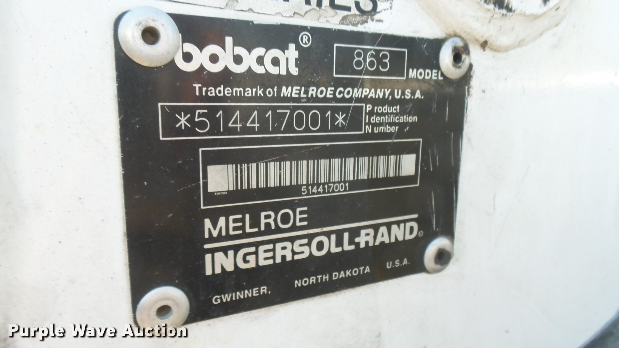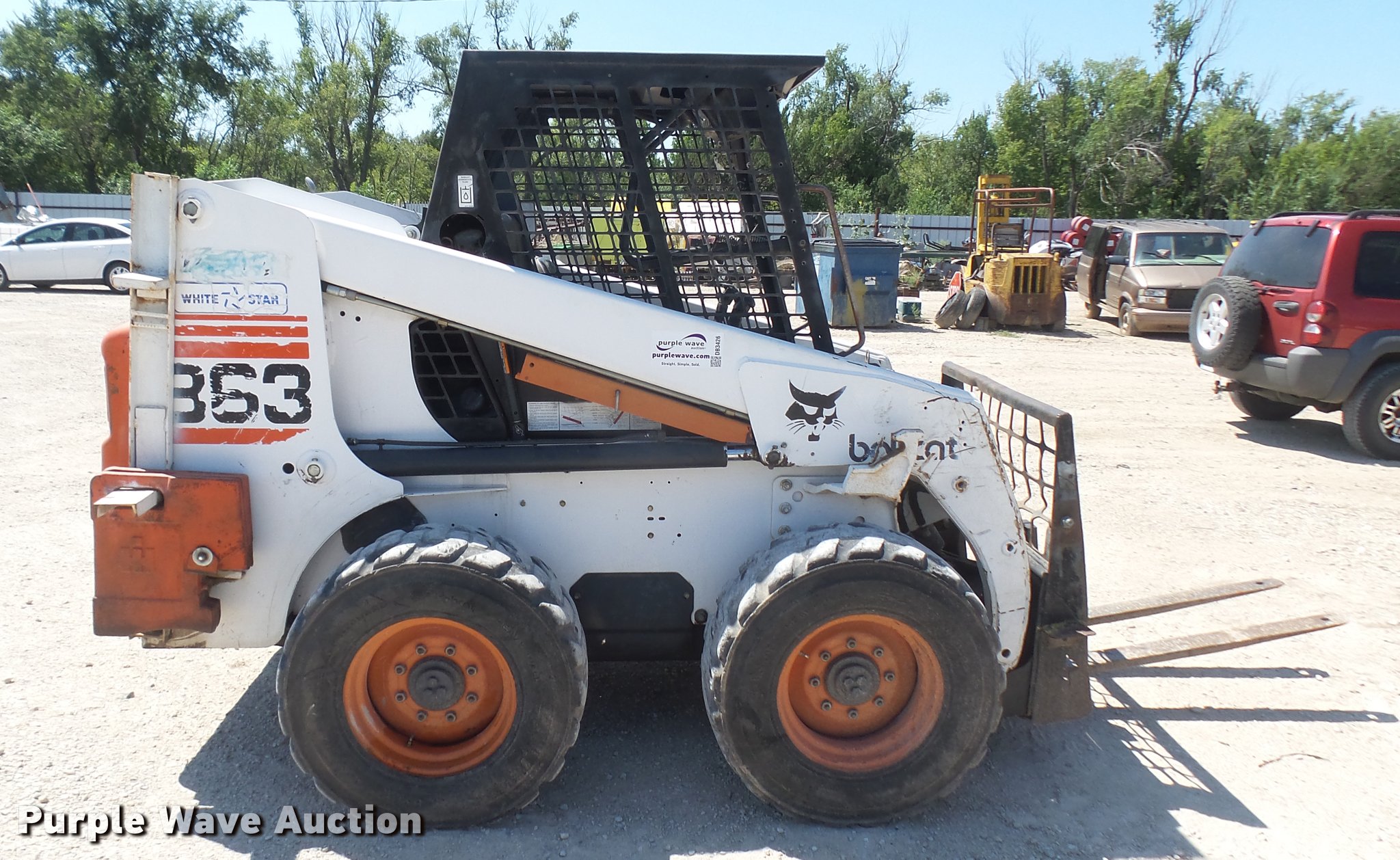 Purple Wave is selling a used Skid Steer Loader in Kansas. This item is a Bobcat 863 skid steer with the following: 3,257 hours on meter, Four cylinder turbo diesel engine, Hydrostatic transmission, Hand and foot controls, Front and rear work lights, Manual quick coupler, High Flow auxiliary hydraulics, Counter weights, 42"L pallet forks, 12-16.5 tires, Serial 51441700