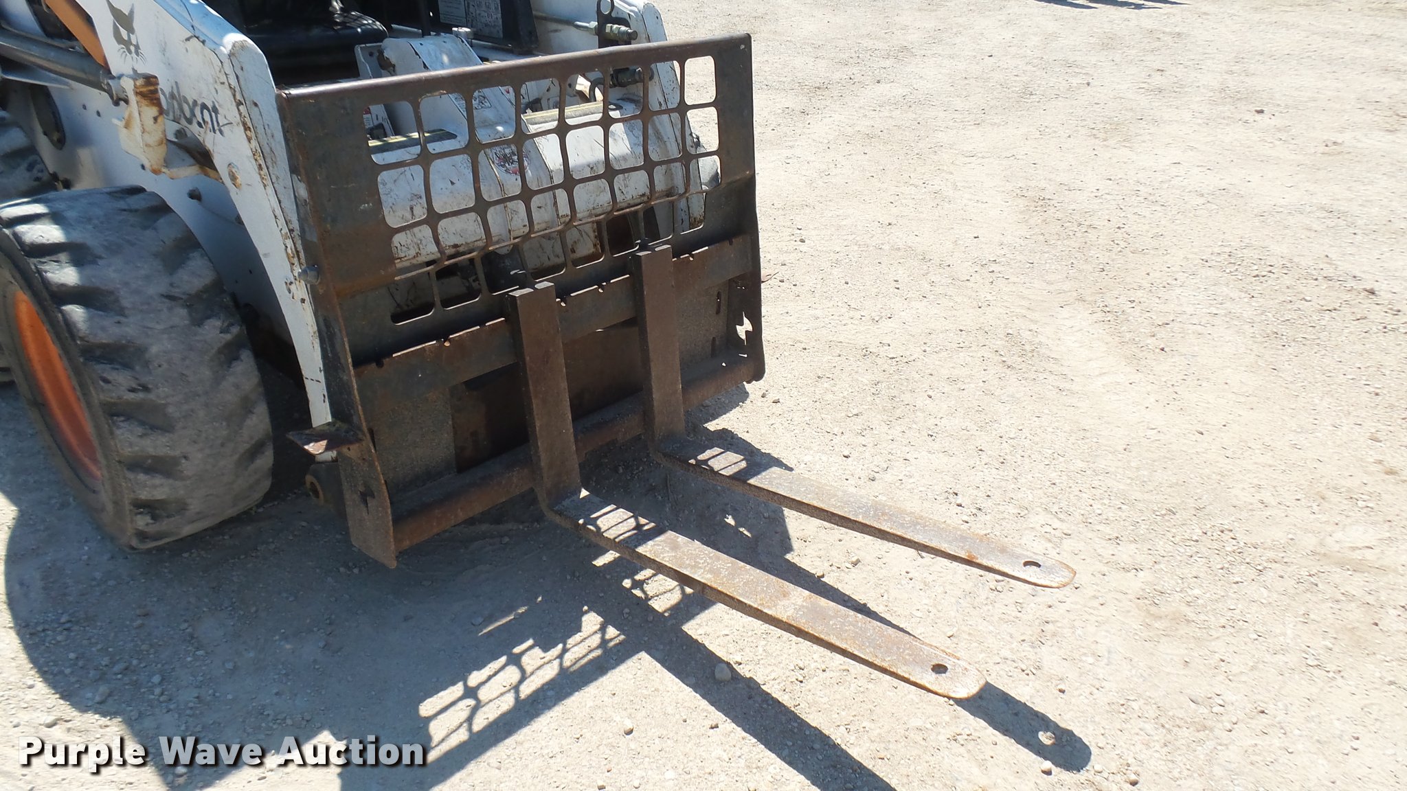Bobcat 863 skid steer. 3,257 hours on meter, Four cylinder turbo diesel engine, Hydrostatic transmission, Hand and foot controls, Front and rear work lights, Manual quick coupler, High Flow auxiliary hydraulics, Counter weights, 42"L pallet forks, 12-16.5 tires, Serial 51441700. 1313 E HWY 56. Lyons, KS 67554