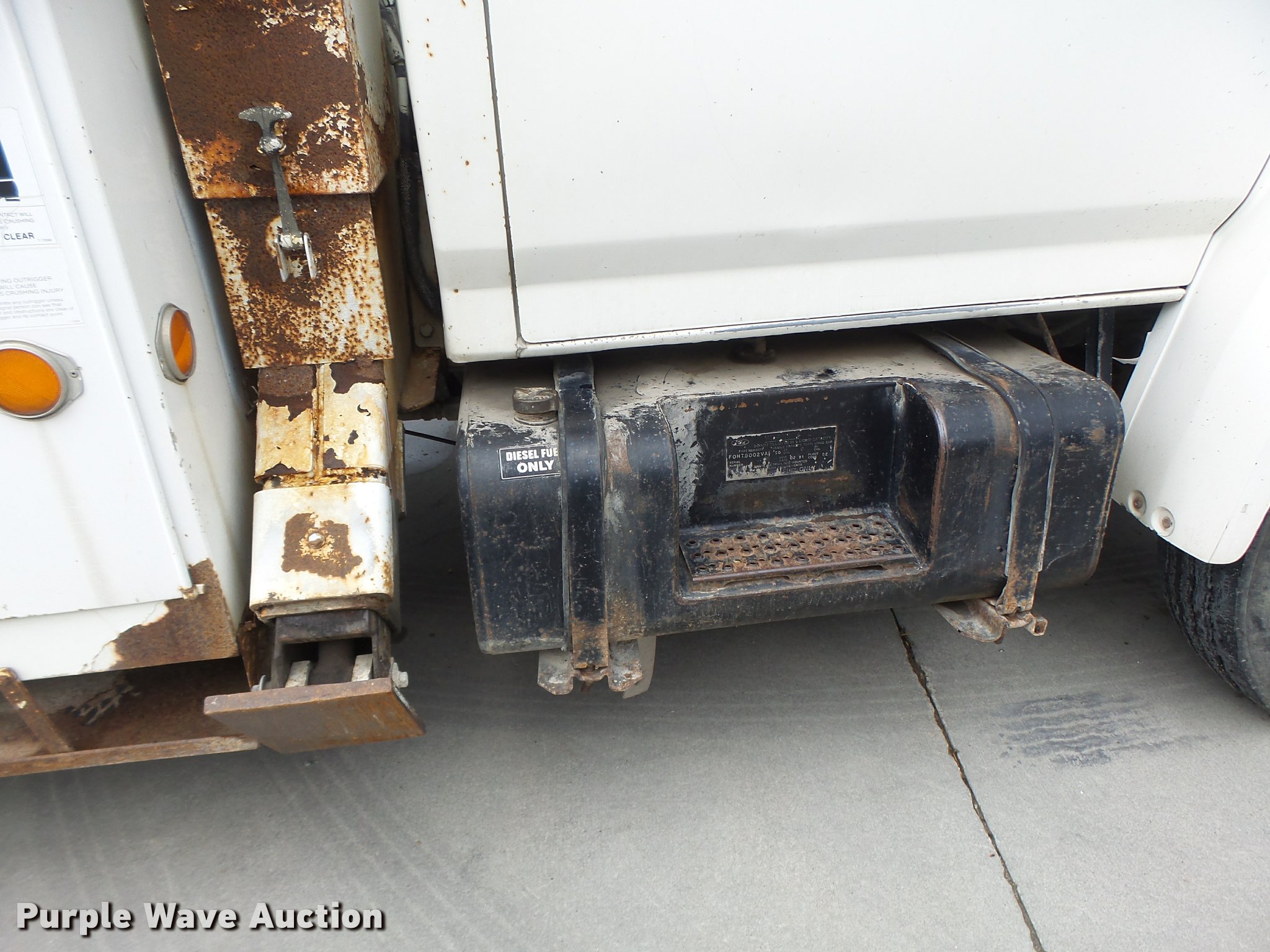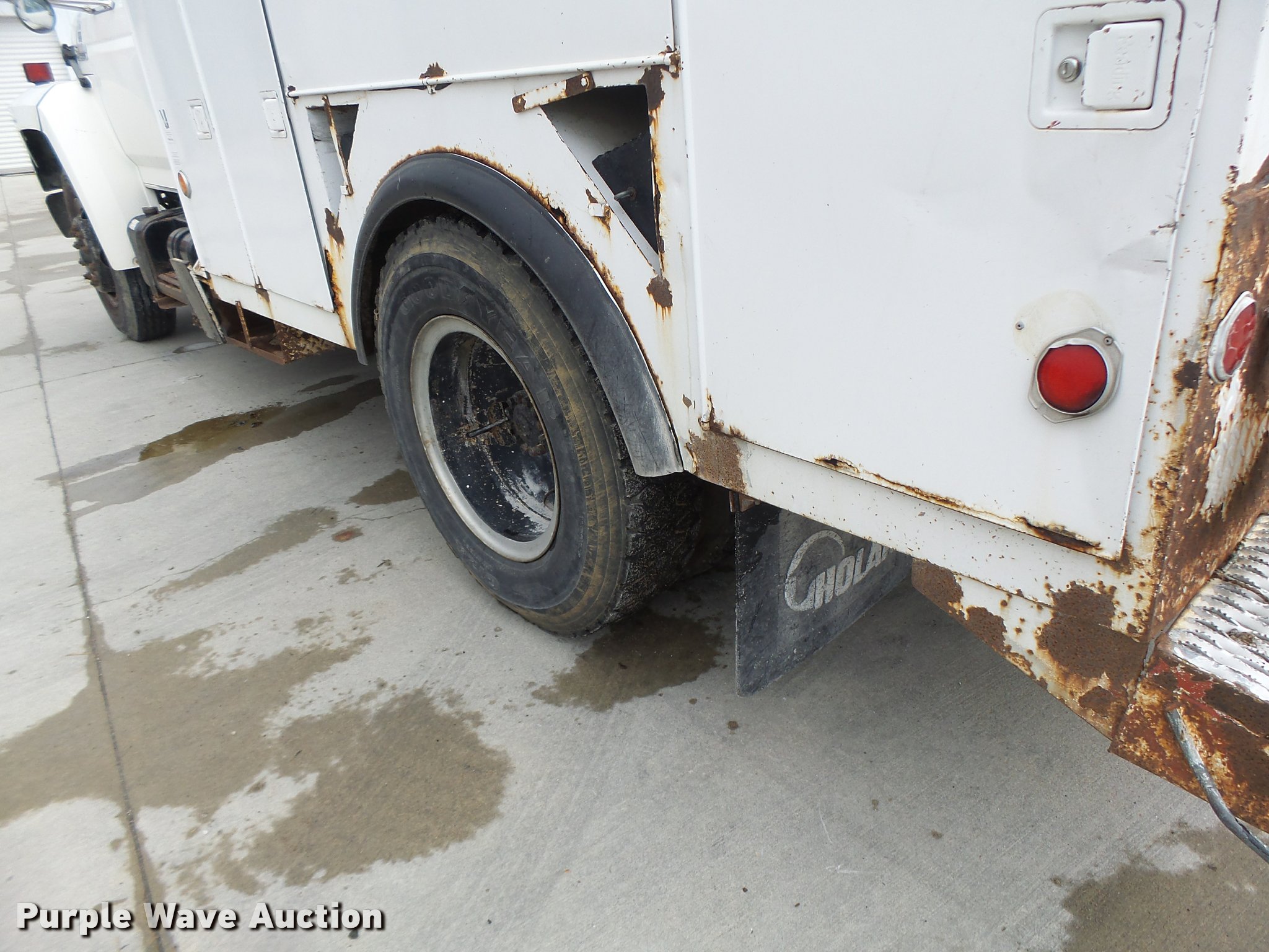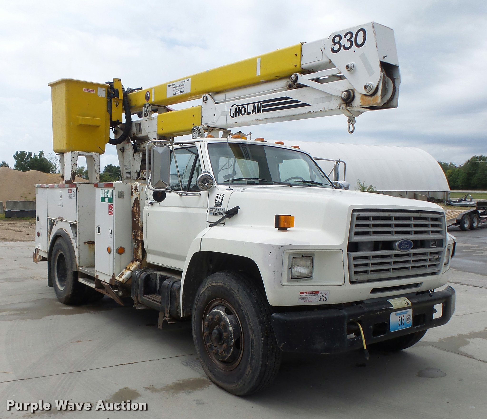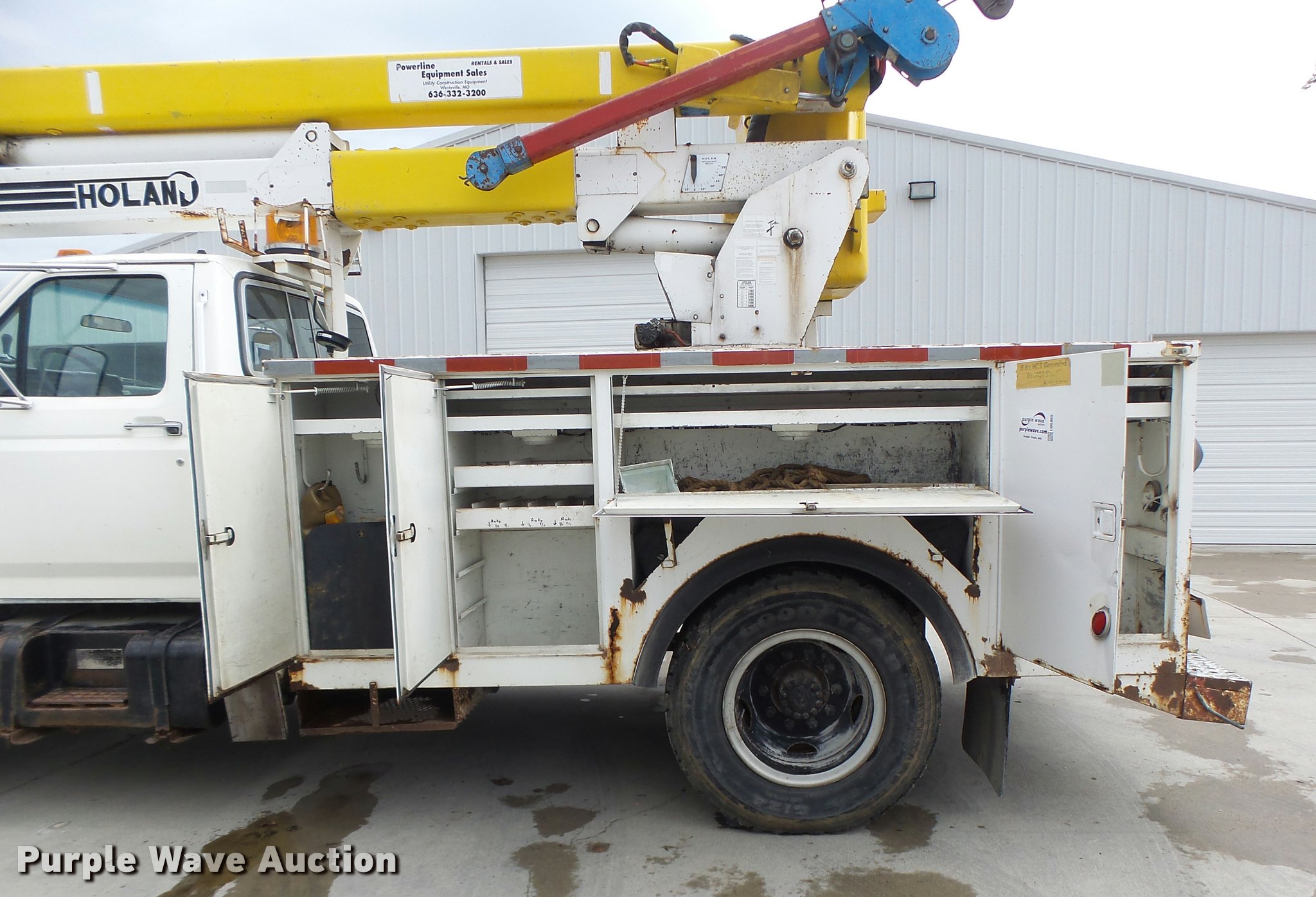 Purple Wave is selling a used Bucket Truck in Missouri. This item is a 1991 Ford F700 bucket truck with the following: 177,628 miles on odometer, 6.6L six cylinder turbo diesel engine, Five speed manual transmission, Two speed rear end, Tandem axle, AC and heat, AM/FM, Suspension set, PTO, Reading ZAT162 service bed, 11'L, Shelving, Compartment lights, Serial B224356, Holan Bronco 830 boom, 300 lbs maximum lift capacity, Man basket, Ground and platform controls, Articulating, insulated boom, (2) outriggers, Serial 91830052G, Dual fuel tanks, Pintle hitch, Trailer wiring, Front tow hooks, Spring suspension, Hydraulic brakes, 9.00R20 tires, Outrigger leaking fluid