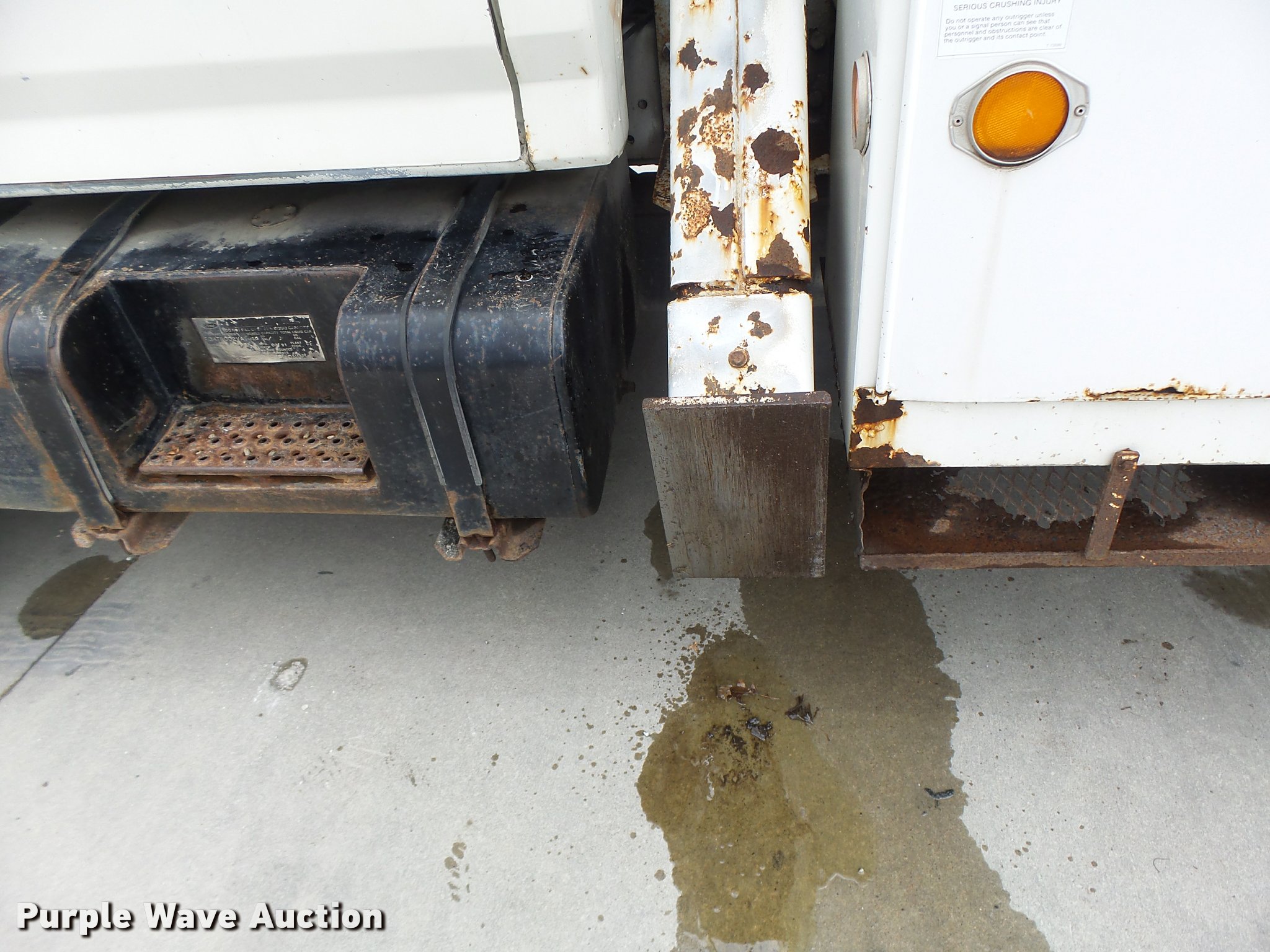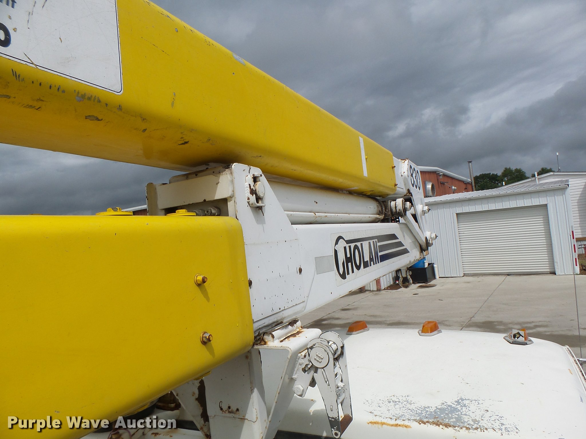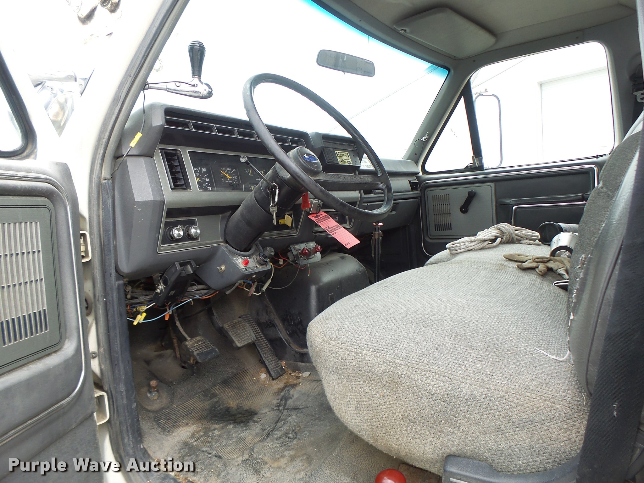 Purple Wave is selling a used Bucket Truck in Missouri. This item is a 1991 Ford F700 bucket truck with the following: 177,628 miles on odometer, 6.6L six cylinder turbo diesel engine, Five speed manual transmission, Two speed rear end, Tandem axle, AC and heat, AM/FM, Suspension set, PTO, Reading ZAT162 service bed, 11'L, Shelving, Compartment lights, Serial B224356, Holan Bronco 830 boom, 300 lbs maximum lift capacity, Man basket, Ground and platform controls, Articulating, insulated boom, (2) outriggers, Serial 91830052G, Dual fuel tanks, Pintle hitch, Trailer wiring, Front tow hooks, Spring suspension, Hydraulic brakes, 9.00R20 tires, Outrigger leaking fluid