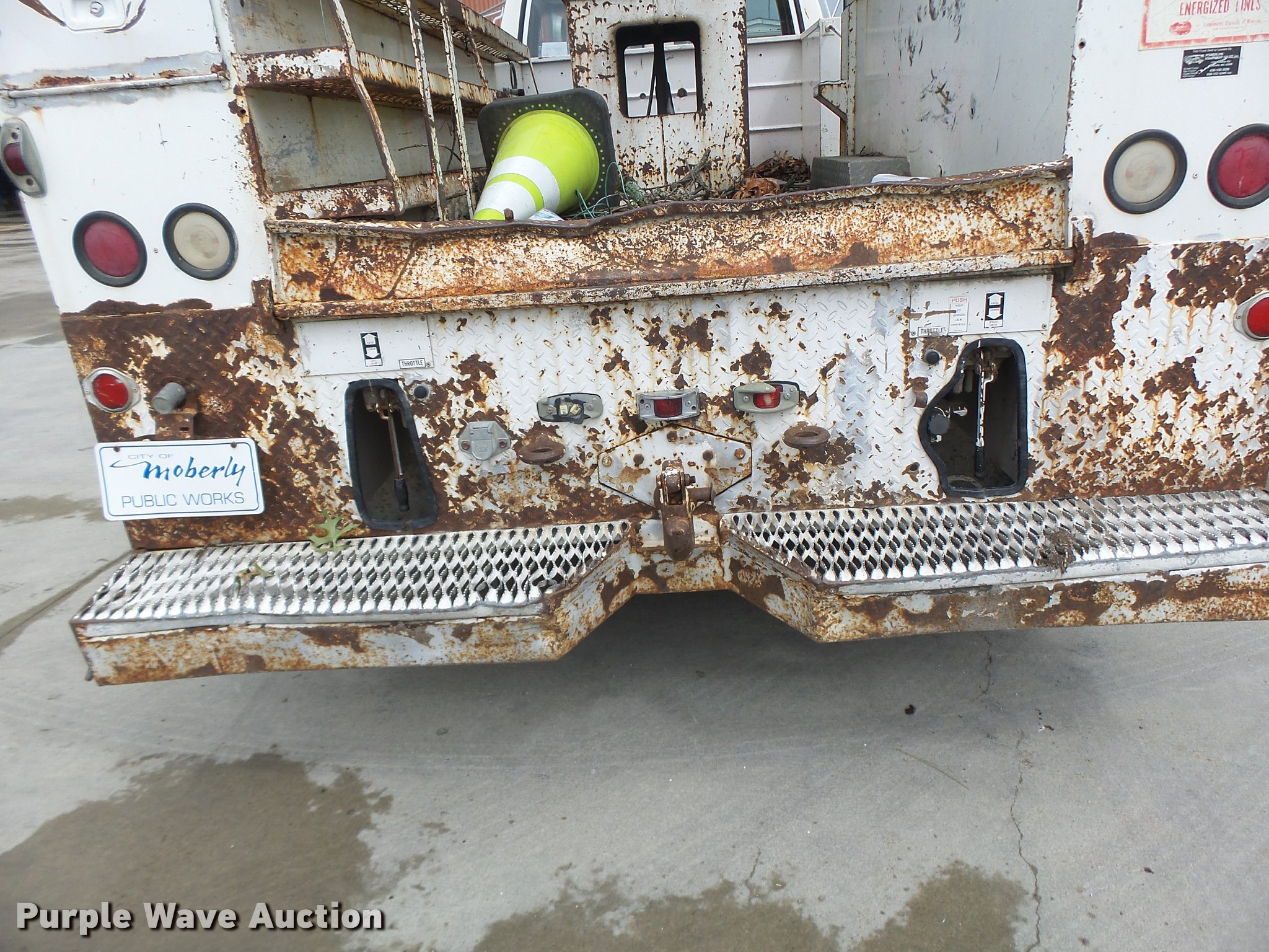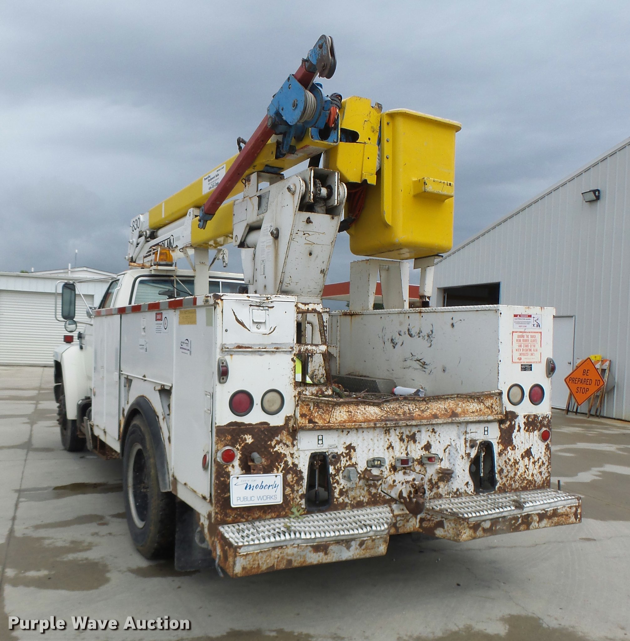 1991 Ford F700 bucket truck. 177,628 miles on odometer, 6.6L six cylinder turbo diesel engine, Five speed manual transmission Two speed rear end, Tandem axle, AC and heat, AM/FM, Suspension set, PTO, Reading ZAT162 service bed 11'L, Shelving, Compartment lights, Serial B224356, Holan Bronco 830 boom 300 lbs maximum lift capacity, Man basket Ground and platform controls, Articulating, insulated boom, (2) outriggers, Serial 91830052G, Dual fuel tanks, Pintle hitch, Trailer wiring, Front tow hooks , Spring suspension, Hydraulic brakes, 9.00R20 tires, Outrigger leaking fluid. Seller is a government entity who will be assigning and distributing the title. Please contact the seller for distribution questions. 1FDPK74PXMVA28191. City of Moberly. 2300 N Morley St. Moberly, MO 65270