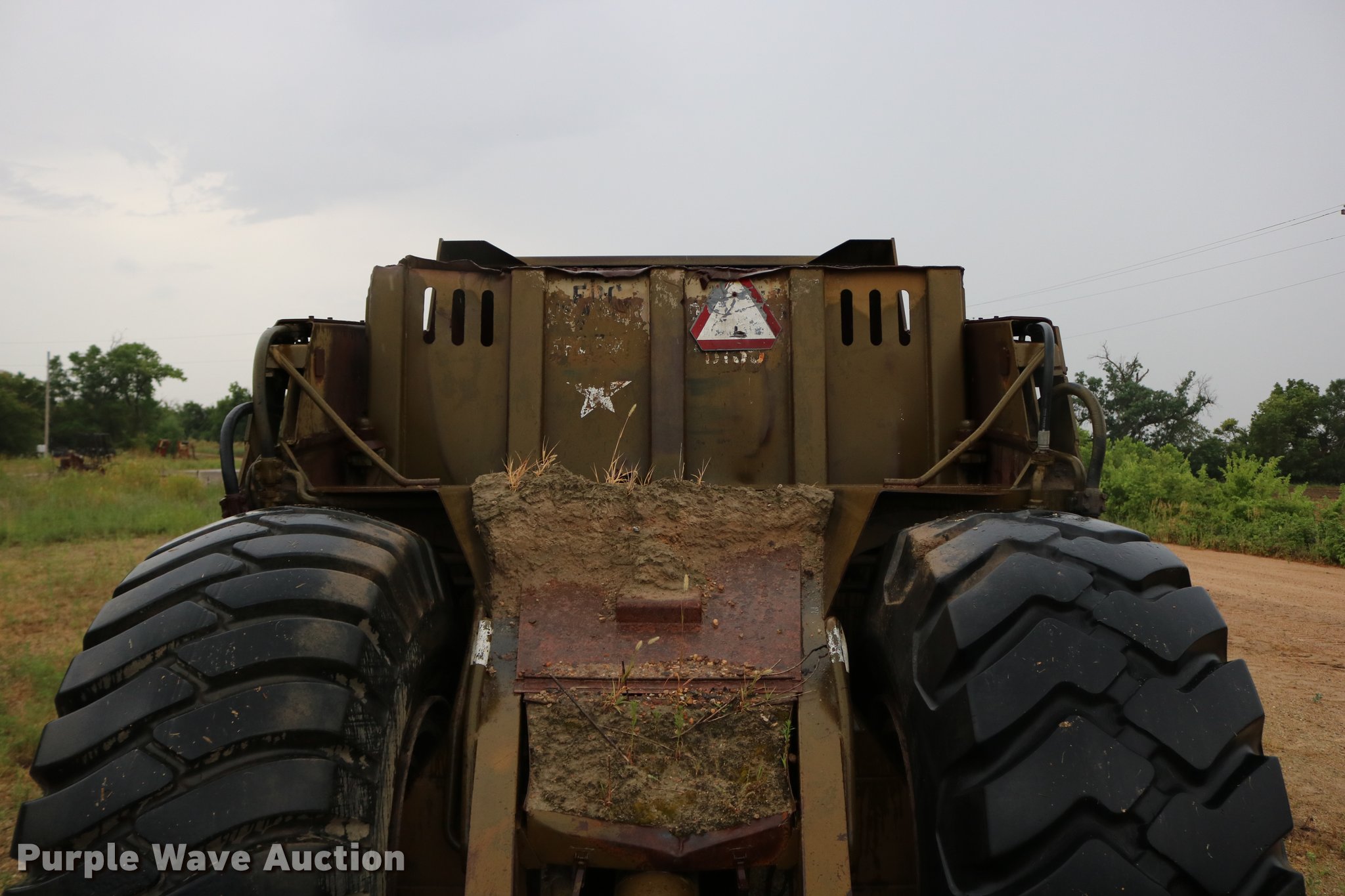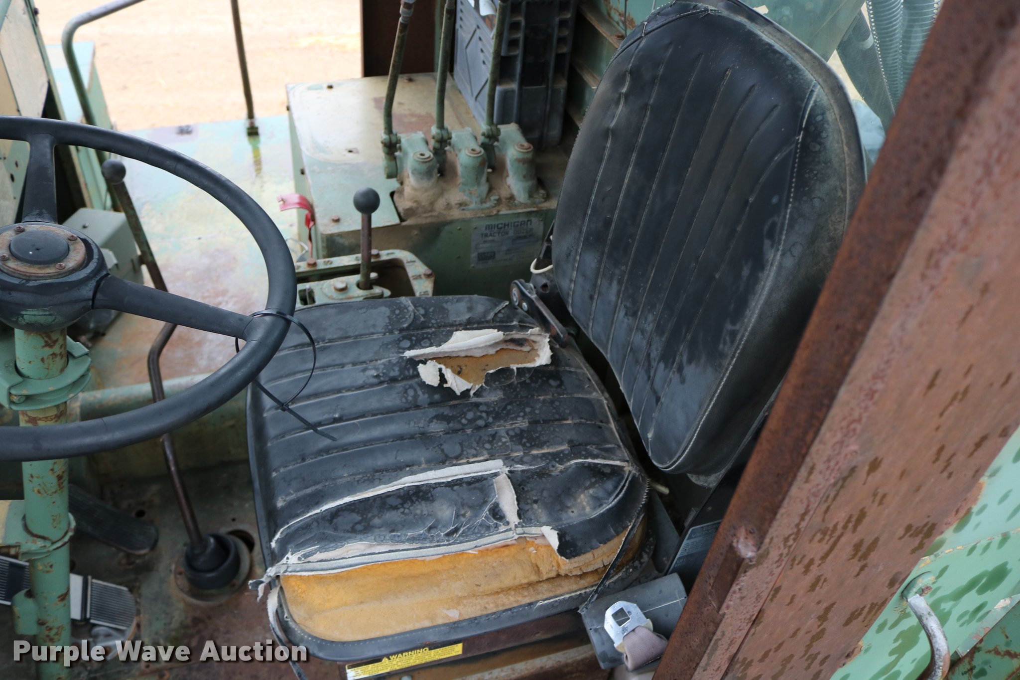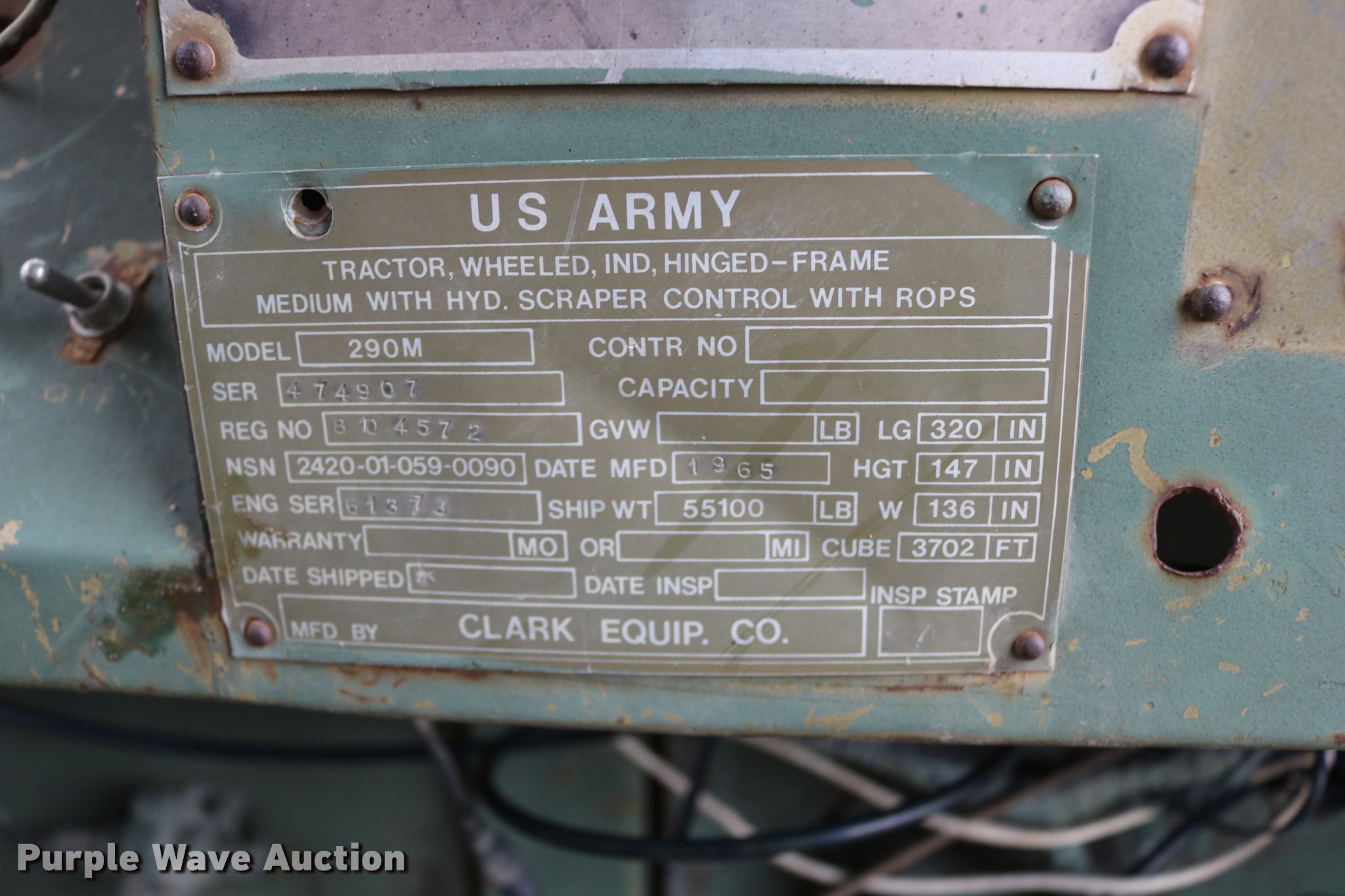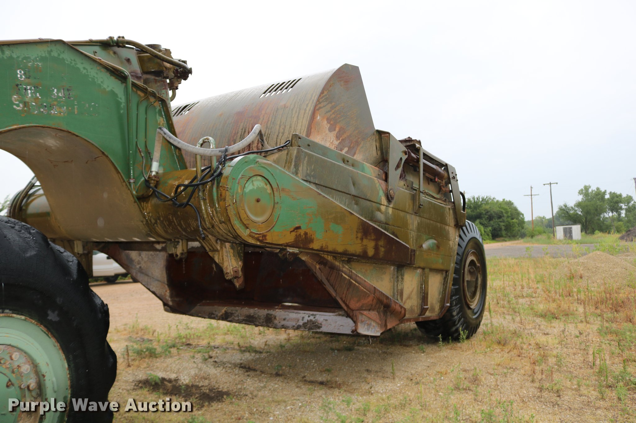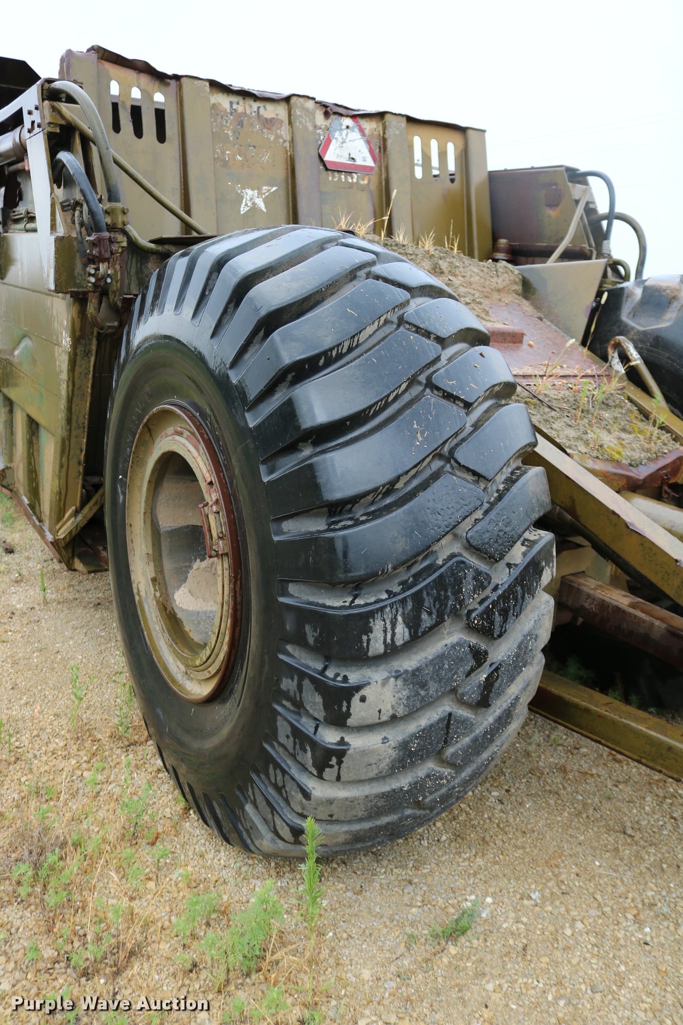 Purple Wave is selling a used Conventional Scraper in Kansas. This item is a Clark 290M conventional scraper with the following: 3,017 hours on meter, Hour meter replaced, Approximately 2,005 hours on replaced meter, Cummins 360 six cylinder turbo diesel engine, Manual transmission, 4F-2R gears, Four wheel drive, Enclosed cab, Heat, Suspension seat, Wipers, Backup alarm, Model CT4 bowl, 9' bowl width, 18 cu.yd. bowl capacity, Hydraulic lift, Serial S-64588-CT4, Three lever controls, 136"W blade, Bolt-on cutting edge, Rear push block, Air brakes, 29.5-29 tires, Serial 61373