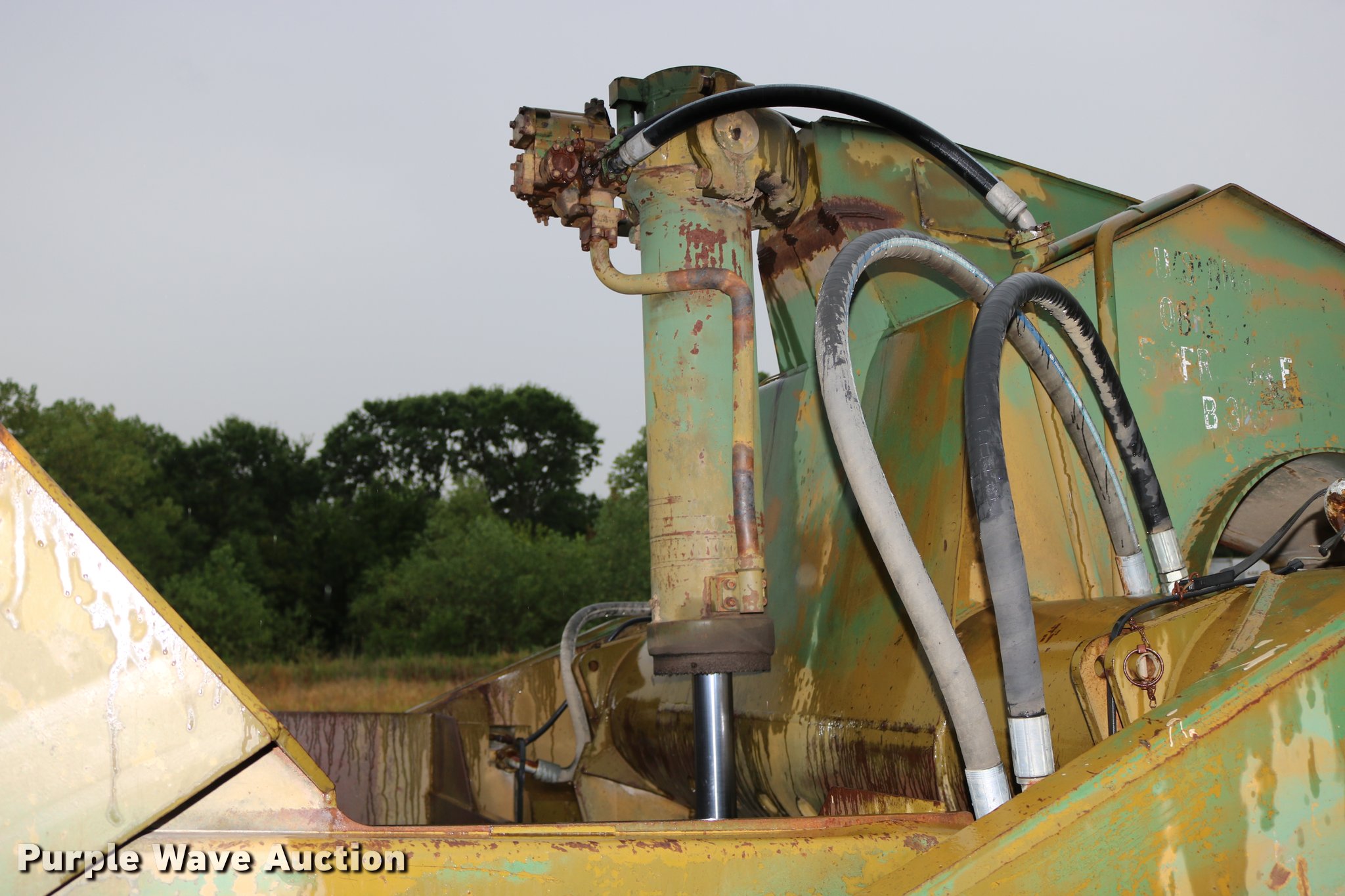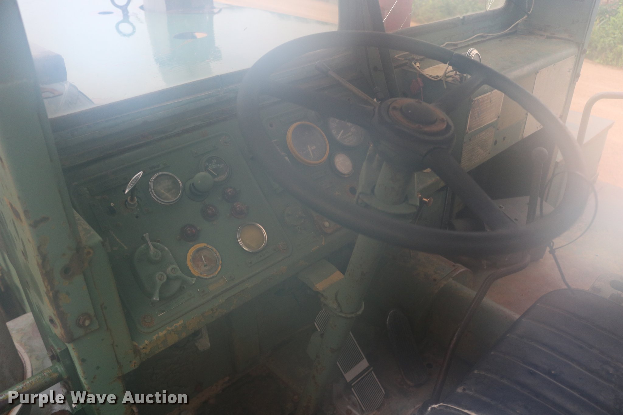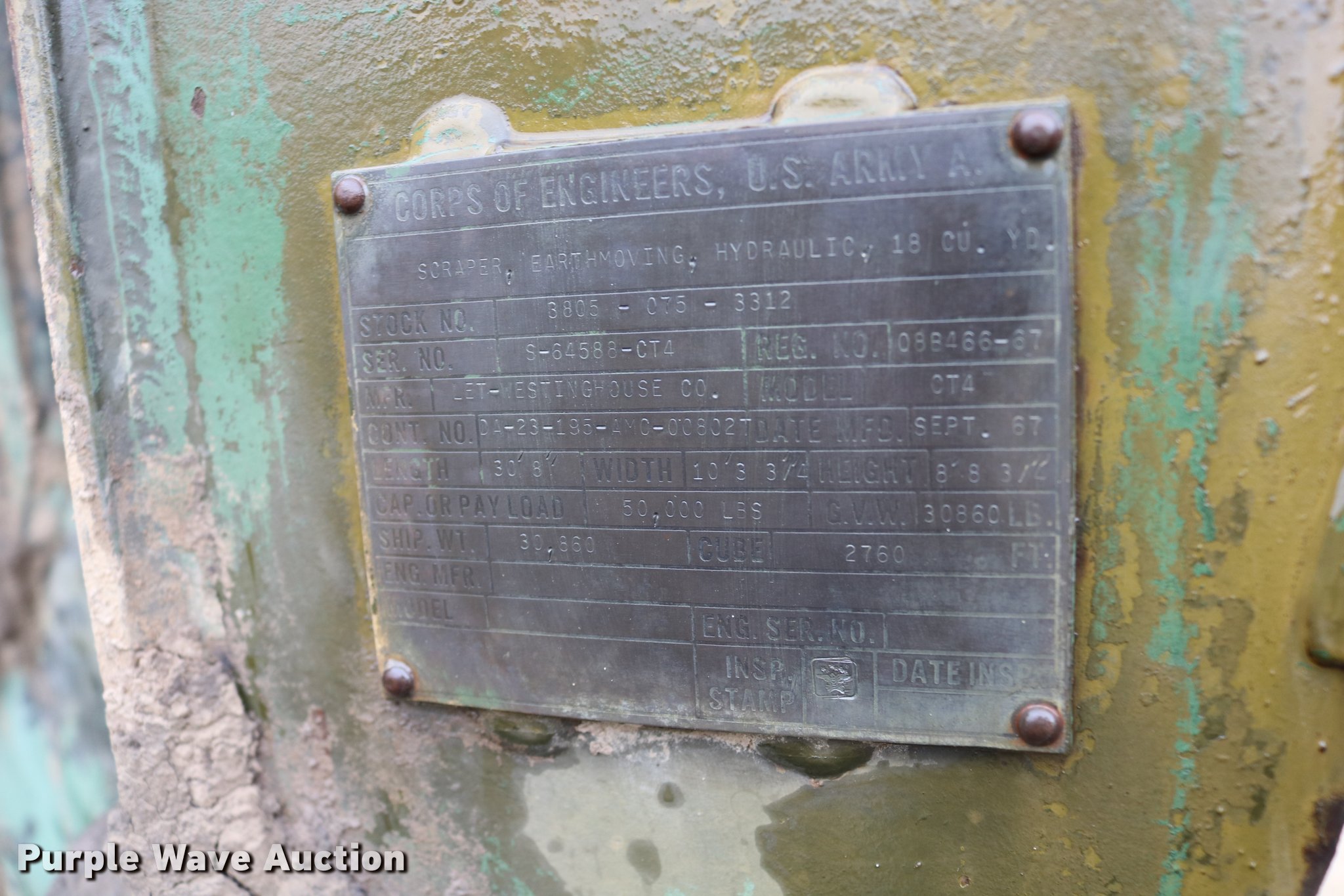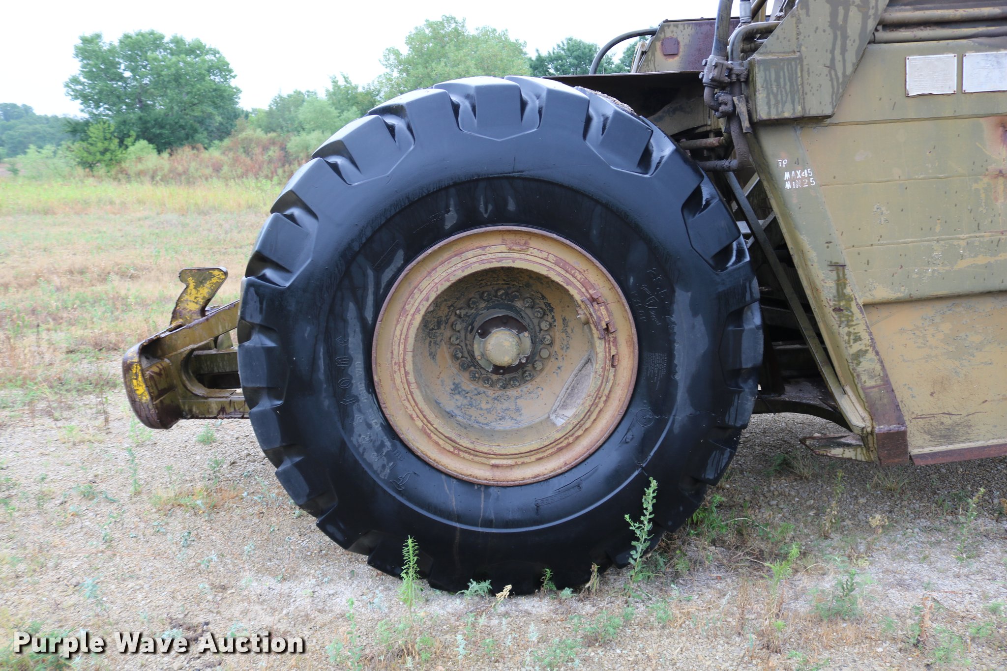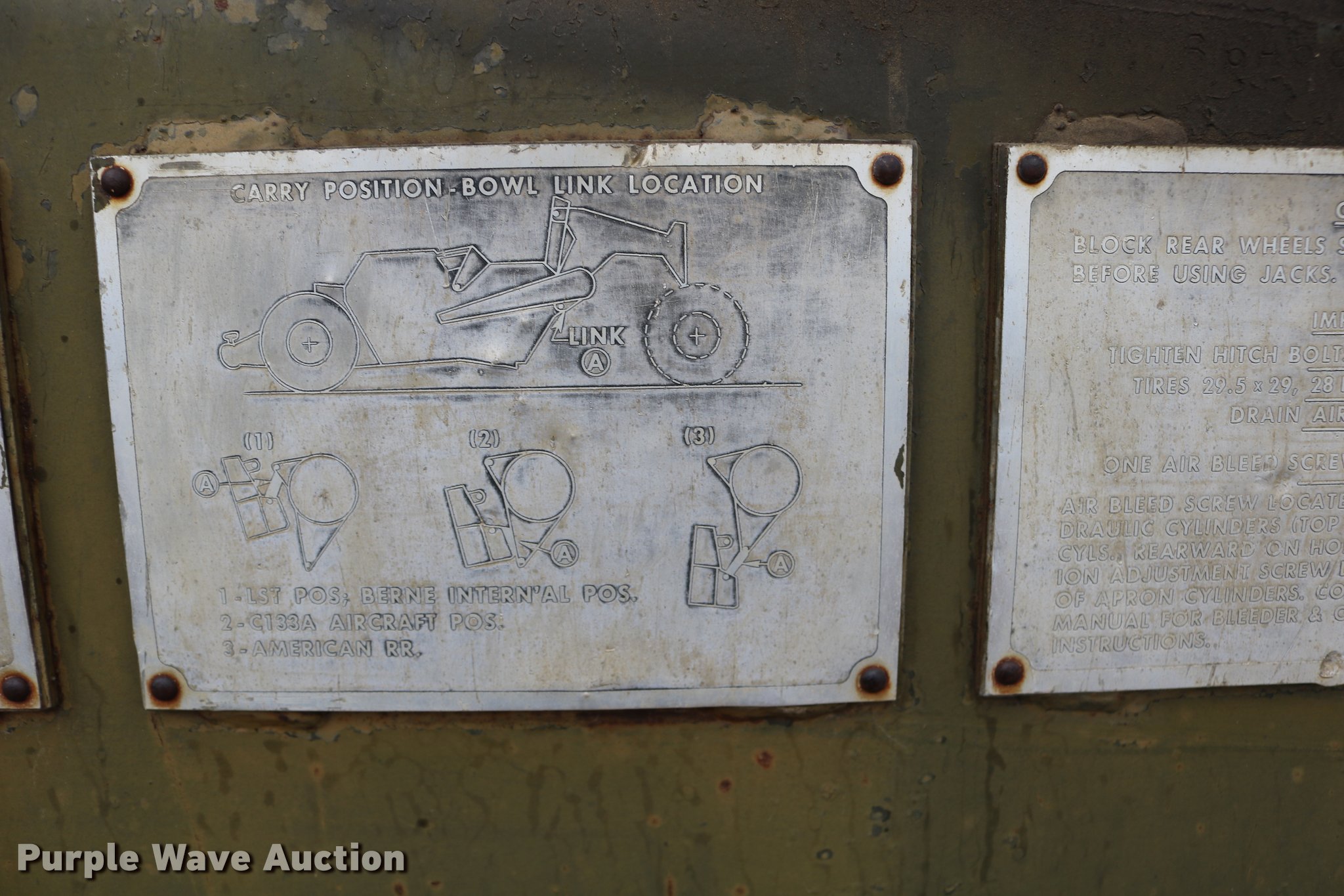 Purple Wave is selling a used Conventional Scraper in Kansas. This item is a Clark 290M conventional scraper with the following: 3,017 hours on meter, Hour meter replaced, Approximately 2,005 hours on replaced meter, Cummins 360 six cylinder turbo diesel engine, Manual transmission, 4F-2R gears, Four wheel drive, Enclosed cab, Heat, Suspension seat, Wipers, Backup alarm, Model CT4 bowl, 9' bowl width, 18 cu.yd. bowl capacity, Hydraulic lift, Serial S-64588-CT4, Three lever controls, 136"W blade, Bolt-on cutting edge, Rear push block, Air brakes, 29.5-29 tires, Serial 61373