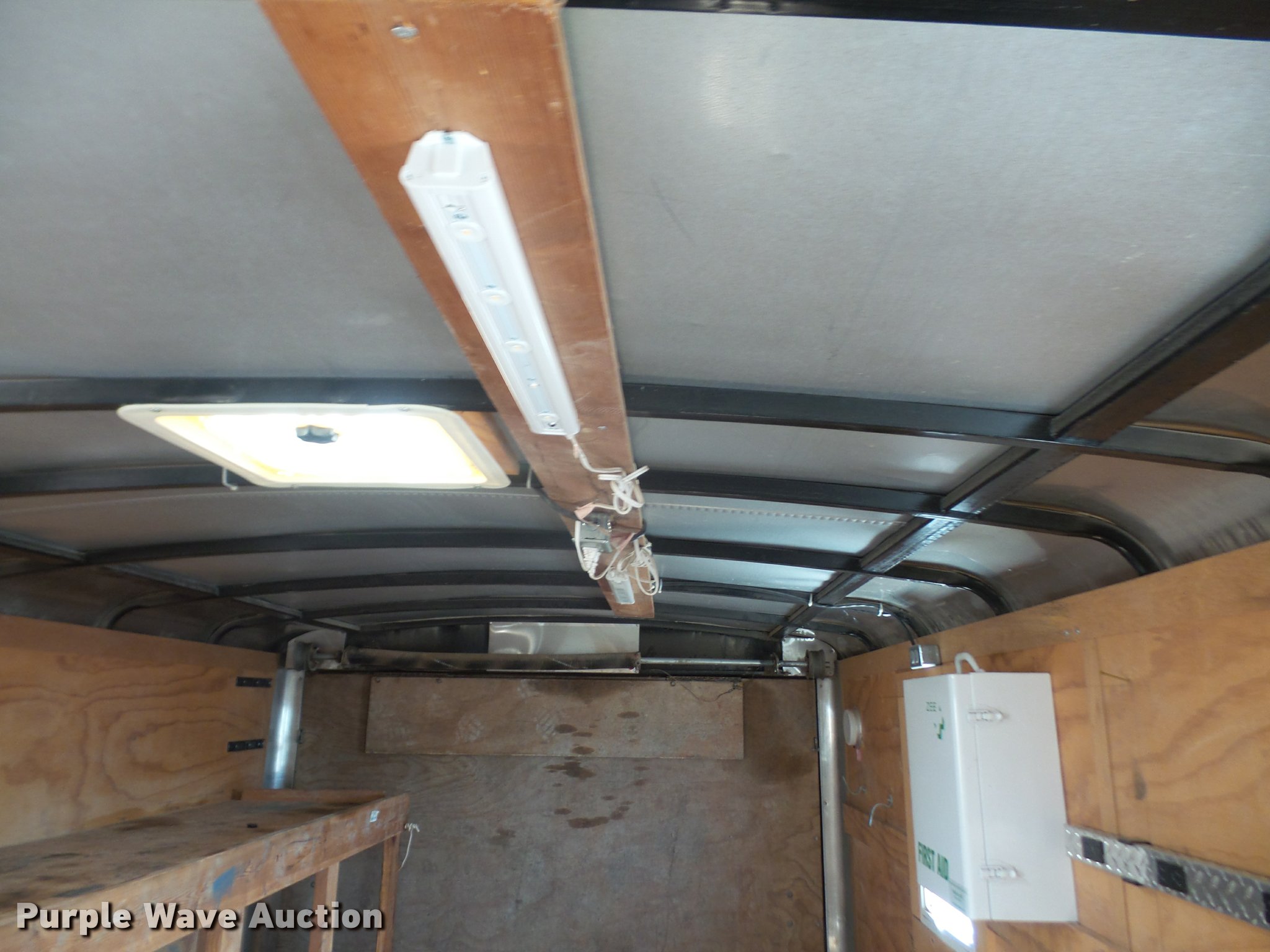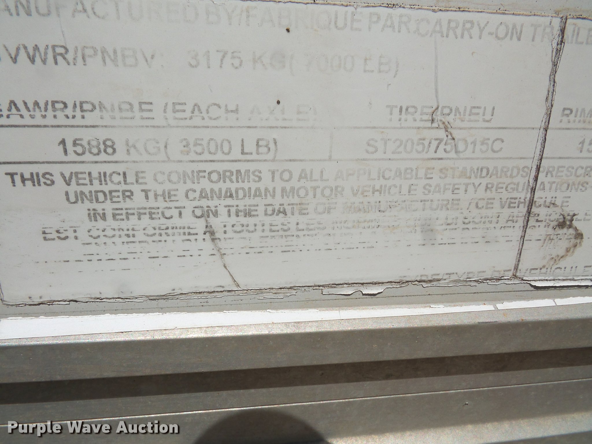 Purple Wave is selling a used Enclosed Cargo Trailer in Kansas. This item is a 2009 Carry-On enclosed cargo trailer with the following: 16'L x 95"W, Rear ramp door, Side entry door, (2) windows, Interior shelving, Interior lighting, 2" ball hitch, 205/75R15 tires, GVWR 7,000 lbs, GAWR 3,500 lbs