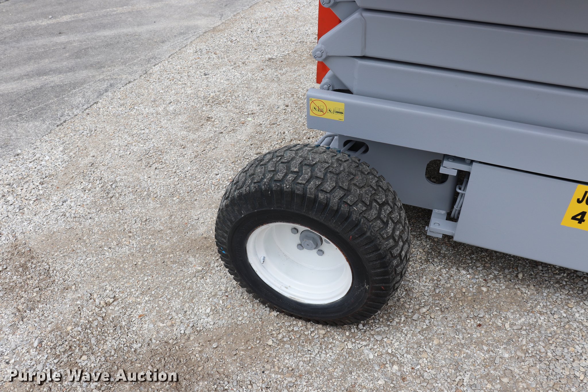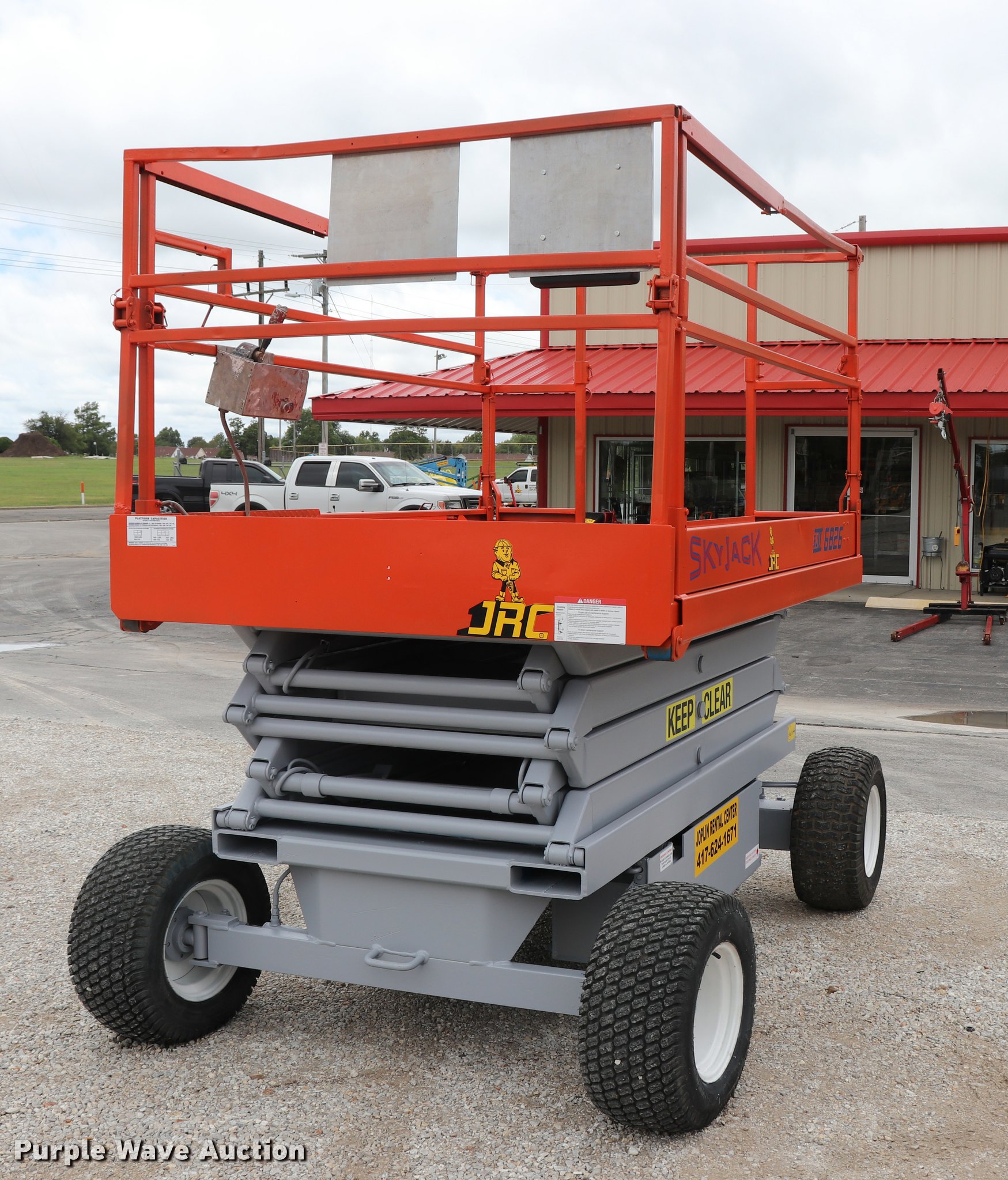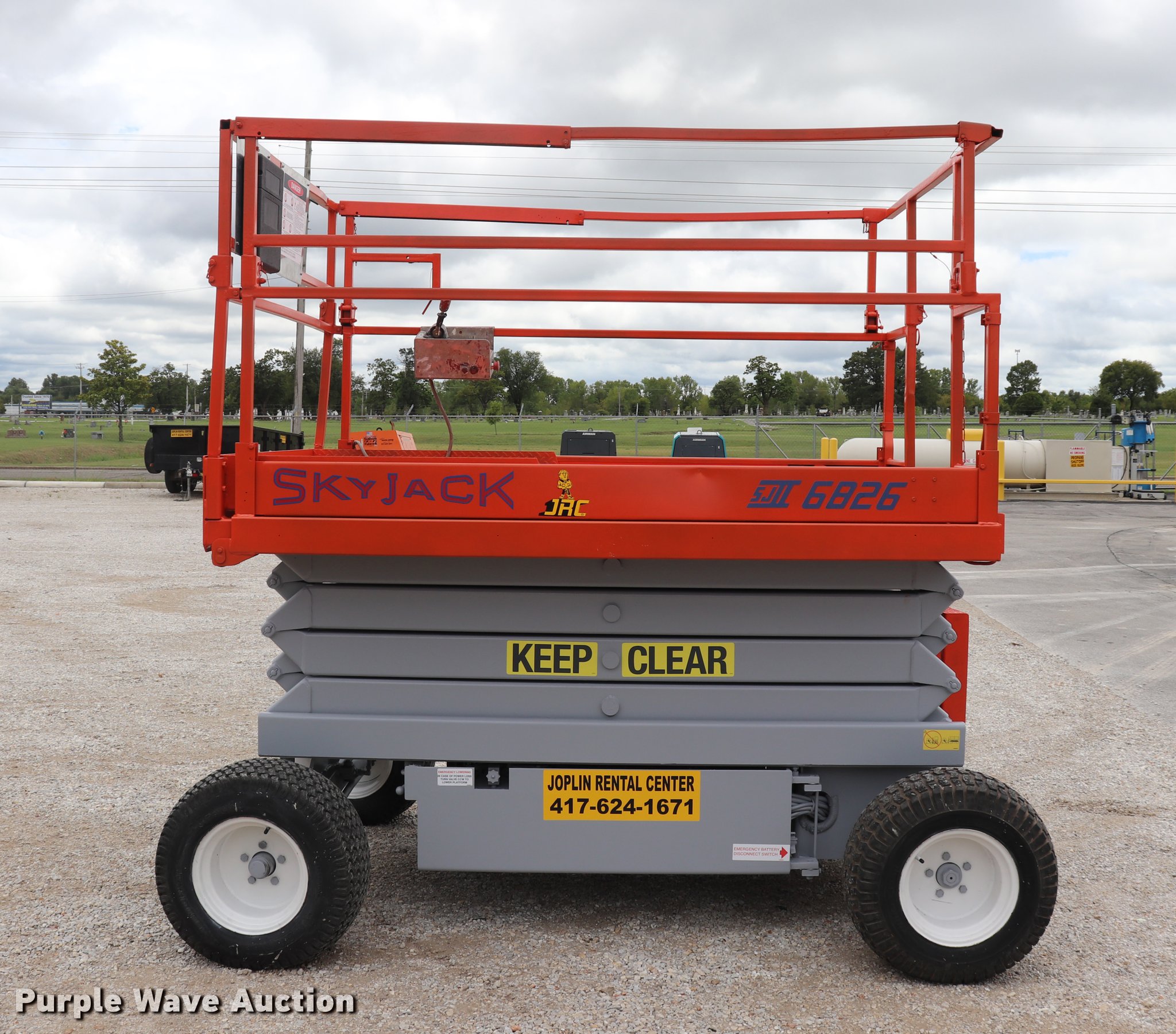 Purple Wave is selling a used Scissor or Vertical Lift in Missouri. This item is a Sky Jack 6826 scissor lift with the following: 323 hours on meter, Electric operation, 1,200 lbs maximum lift capacity, 26' maximum lift height, 7'L x 5'W platform, 3' manual platform extensions, AC power outlet, Platform and ground controls, Safety alarm, 23 x 10.5-12 pneumatic tires, Non-operational safety alarm, Serial 75171