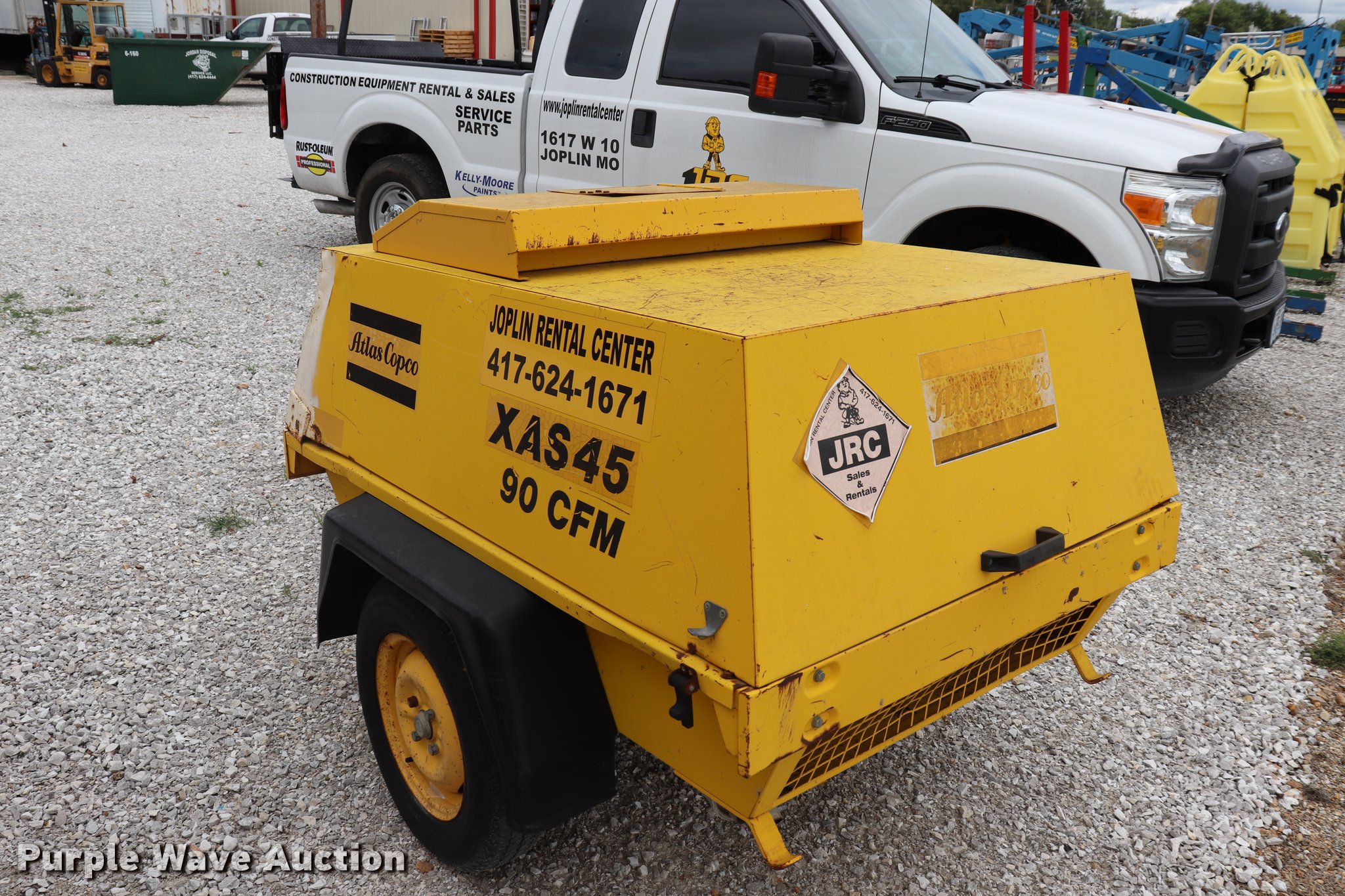 1994 Atlas Copco XAS45 air compressor. 1,555 hours on meter, Deutz two cylinder diesel engine, Atlas Copco pump, 90 CFM, 135 psi, Jack stand, 2" ball hitch, 155/80R13 tire, Serial AIR221445. Transfer of ownership documentation will be a bill of sale. Joplin Rental Center LLC. 1617 W 10th. Joplin, MO 64801