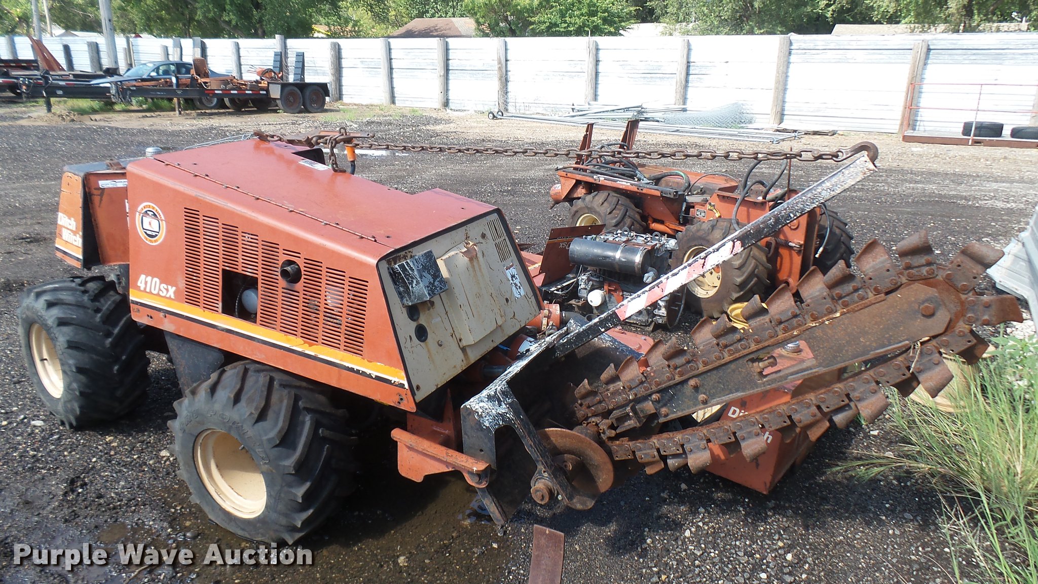 1995 Ditch Witch 410SX vibratory plow. 2,259 hours on meter, Lister Petter four cylinder diesel engine, Hydorstatic transmission, Four wheel drive, Model H400 trencher 48" maximum digging depth, Vibratory plow Hydraulic lift, Hydraulic swing, Roto bore unit, 26 x 12-12 tires, Unknown operating condition, Serial 4M0320. 3405 N Broadway St. Wichita, KS 67219
