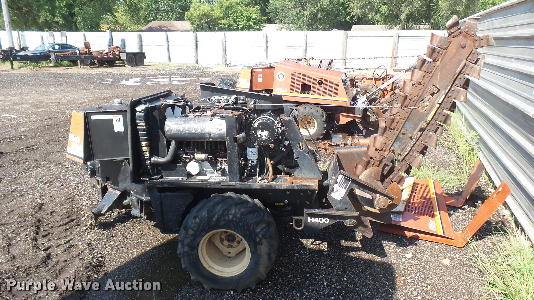 Ditch Witch 410SX vibratory plow. 2,363 hours on meter, Lister Petter four cylinder diesel engine, Hydrostatic transmission, Four wheel drive, Trencher model H400 48" maximum digging depth, Serial 2R2942, Vibratory plow Hydraulic lift, Hydraulic swing, Roto bore unit, 26 x 12-12 tires, Non-operational unit, One tire removed. 3405 N Broadway St. Wichita, KS 67219